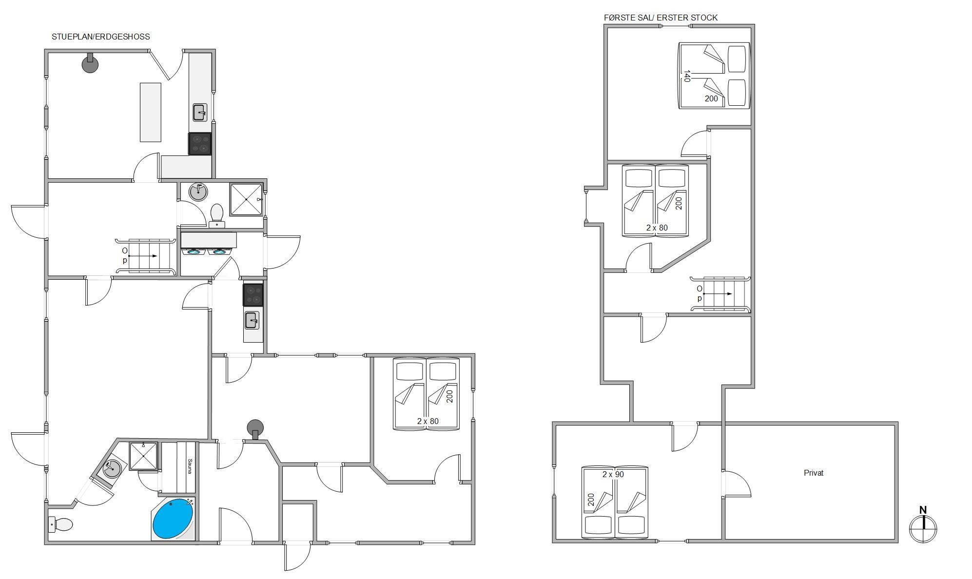 Sommerhuset rummer fire komfortable soverum, der hver især er indrettet med en dobbeltseng, hvilket sikrer, at I får en god nattesøvn. Et soveværelse er lokaliseret på stueetagen og tre soveværelser er placeret på førstesalen. Med to badeværelser bliver det let at fordele morgenrutinerne, og luksusen fortsætter i form af en sauna og en tømmespa.