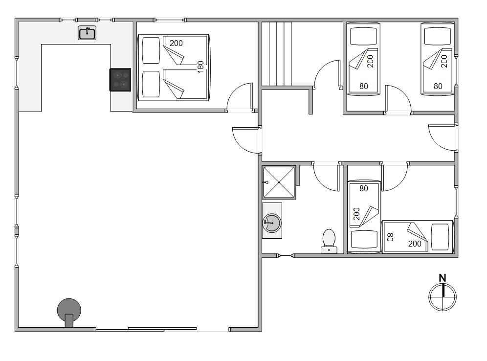 Med de 3 soveværelser finder hele familien god plads i dobbeltsengen, de tre enkeltsenge og køjesengen. Badeværelset med bruseniche og vaskemaskine ligger over for husets sauna, som helt sikkert vil blive brugt flittigt igennem ferien - både på de kolde dage, og efter en lang spadseretur gennem skovområdet eller langs sandstranden i Houstrup.