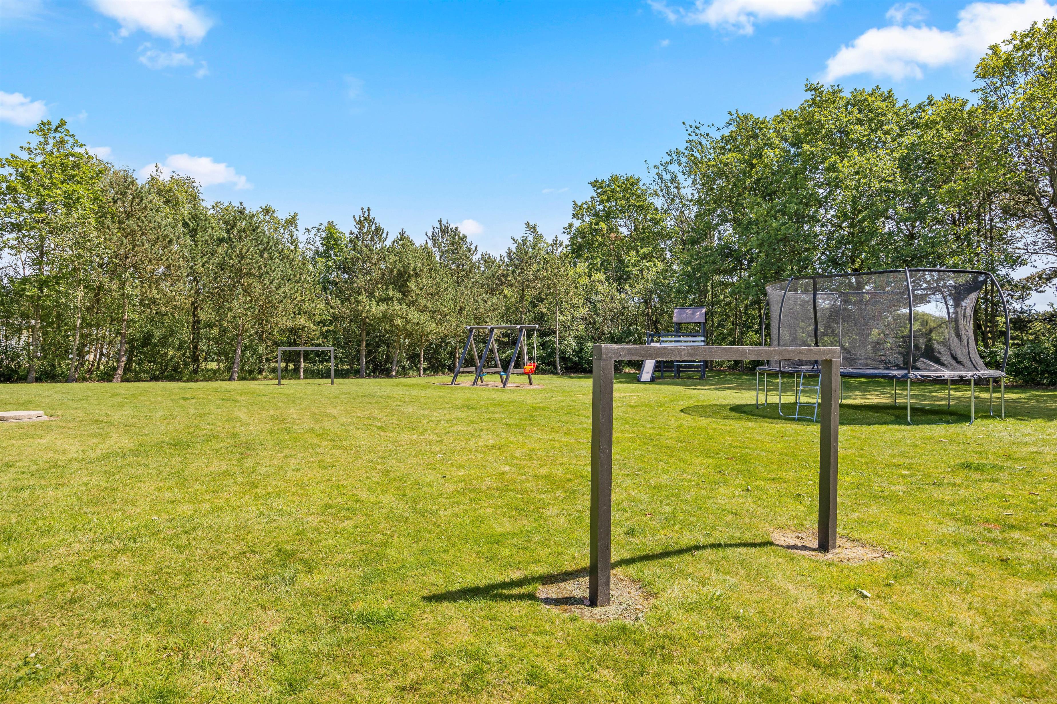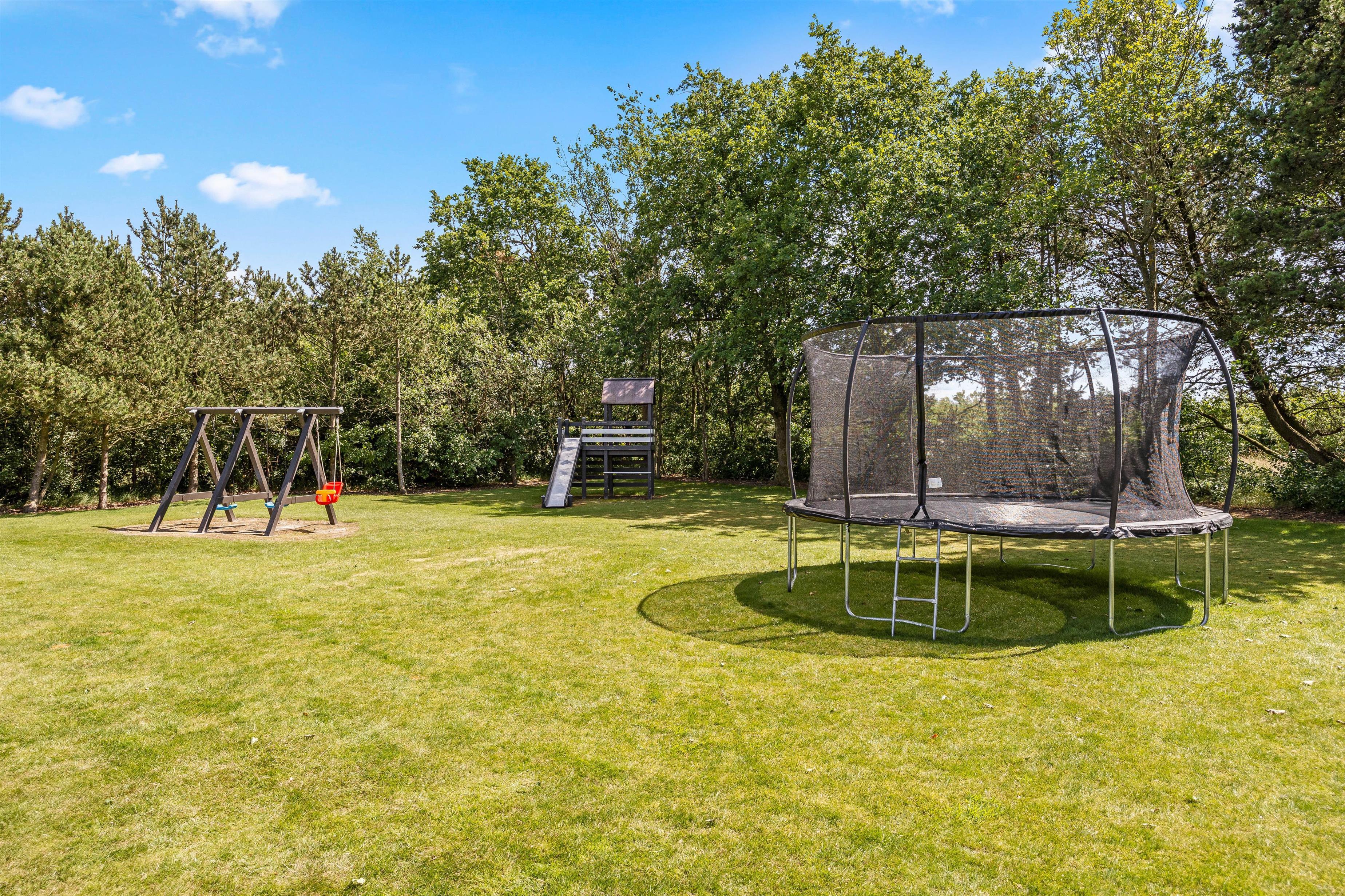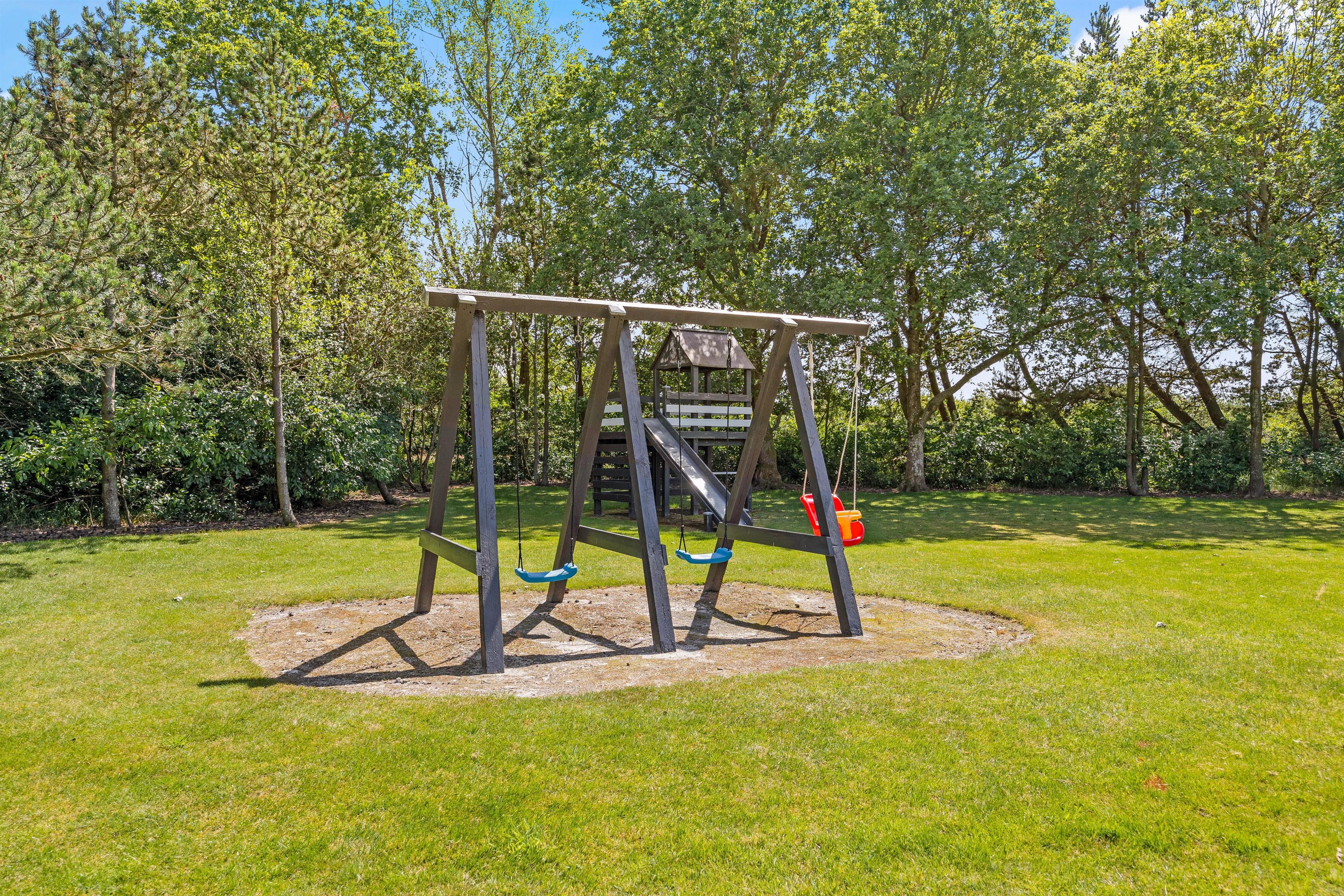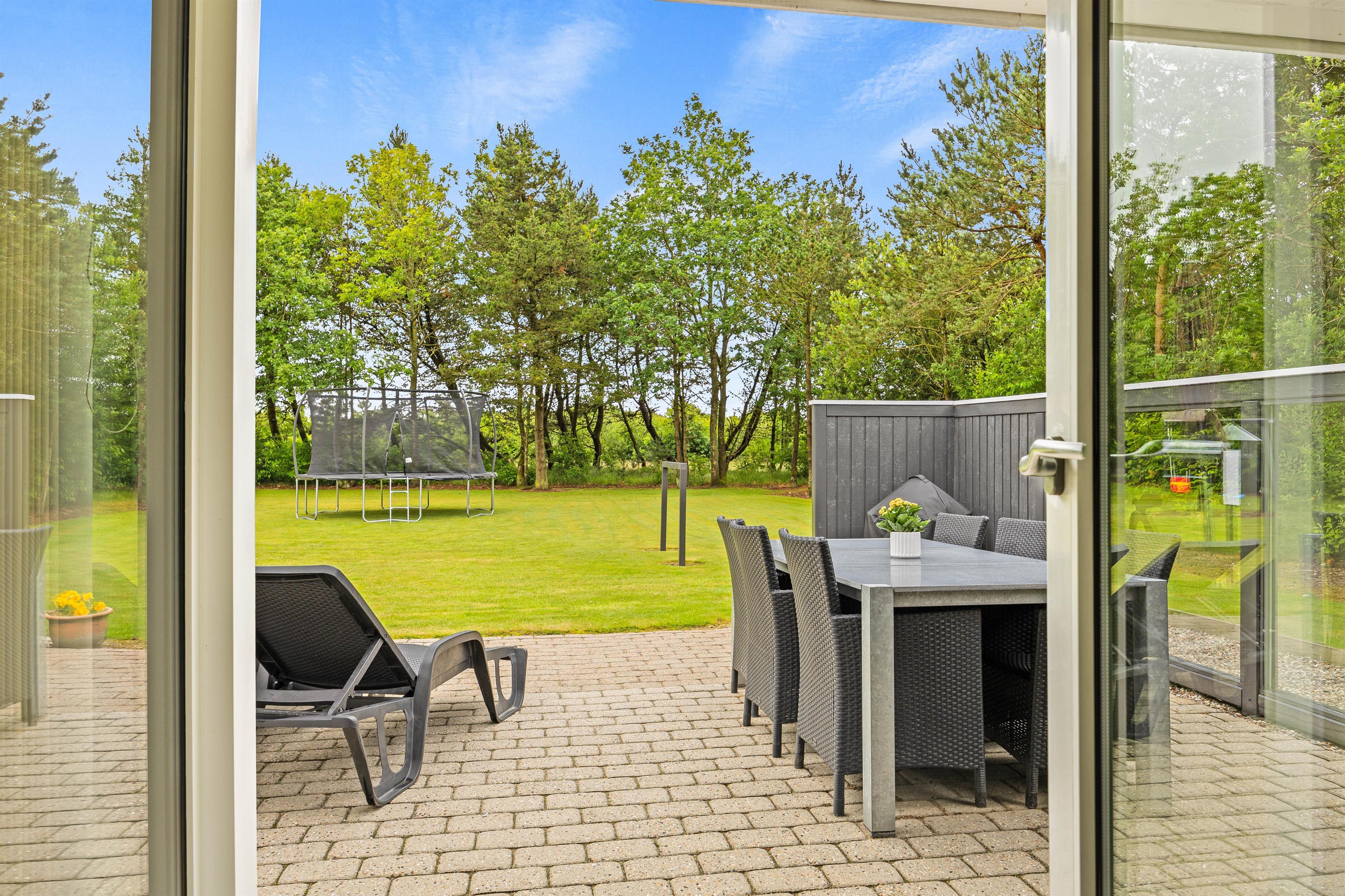 På feriehusets delvist overdækkede og afskærmede terrasse er alt til ferien til rådighed. Her finder I både grill og havemøbler, solvogne og parasol, der indbyder til afslapning og udendørs måltider. Fra terrassen kan I nyde udsigten over den 2686 kvadratmeter store naturgrund. I haven står et legetårn med rutchebane klar til at underholde de yngre familiemedlemmer. Terrassen er delvist overdækket og afskærmet, hvilket giver jer mulighed for at nyde udendørslivet uanset vejret.