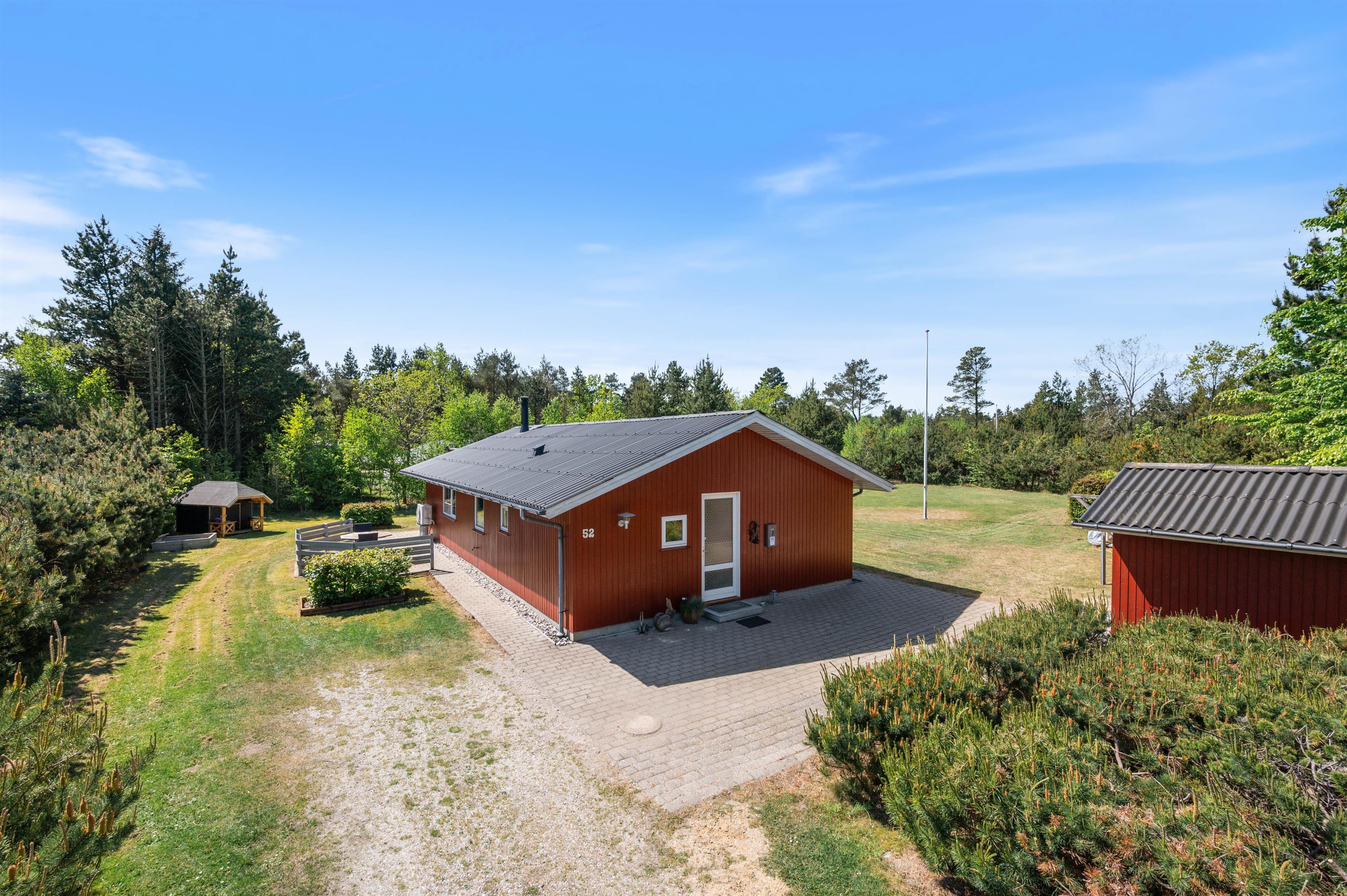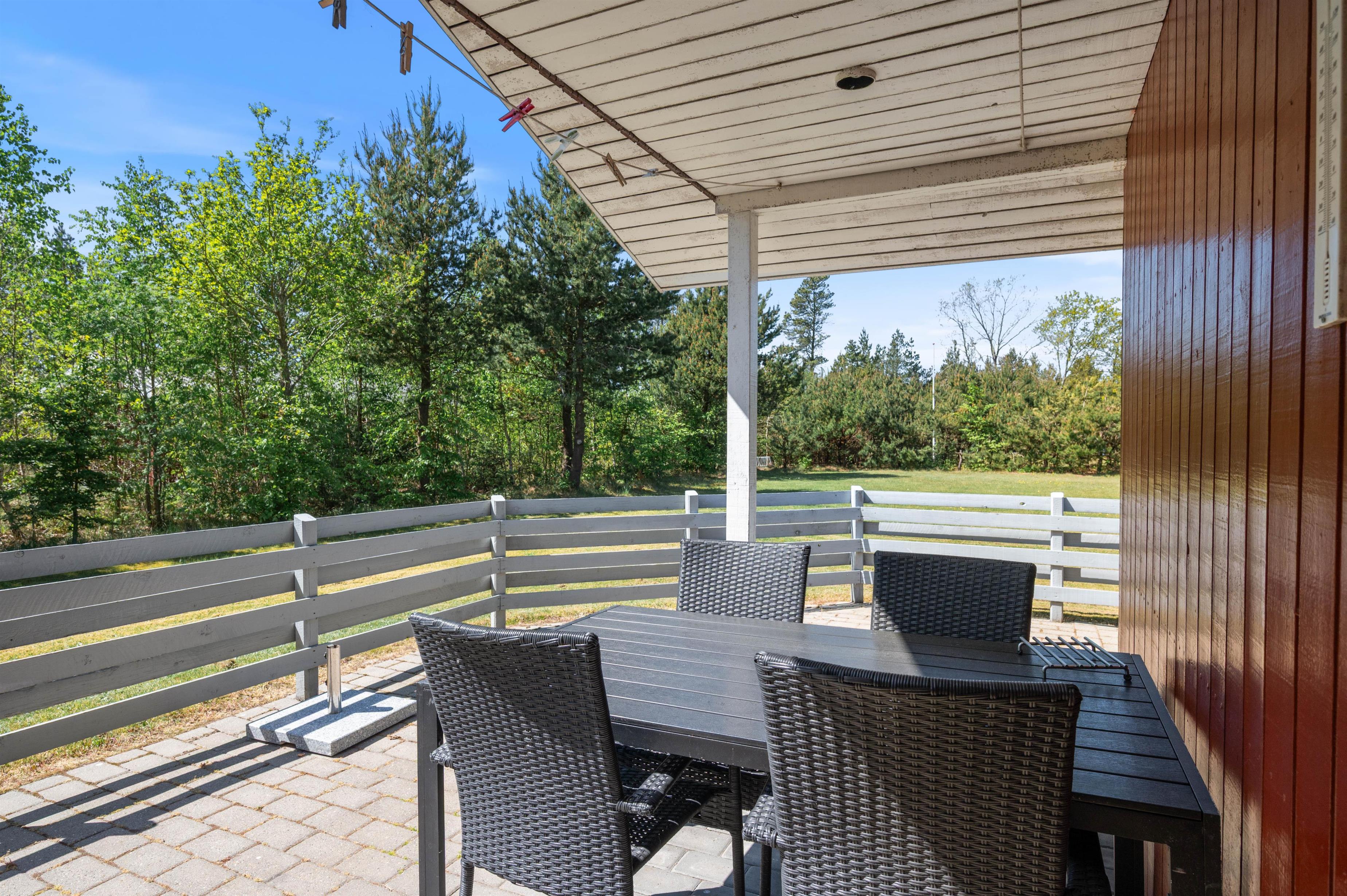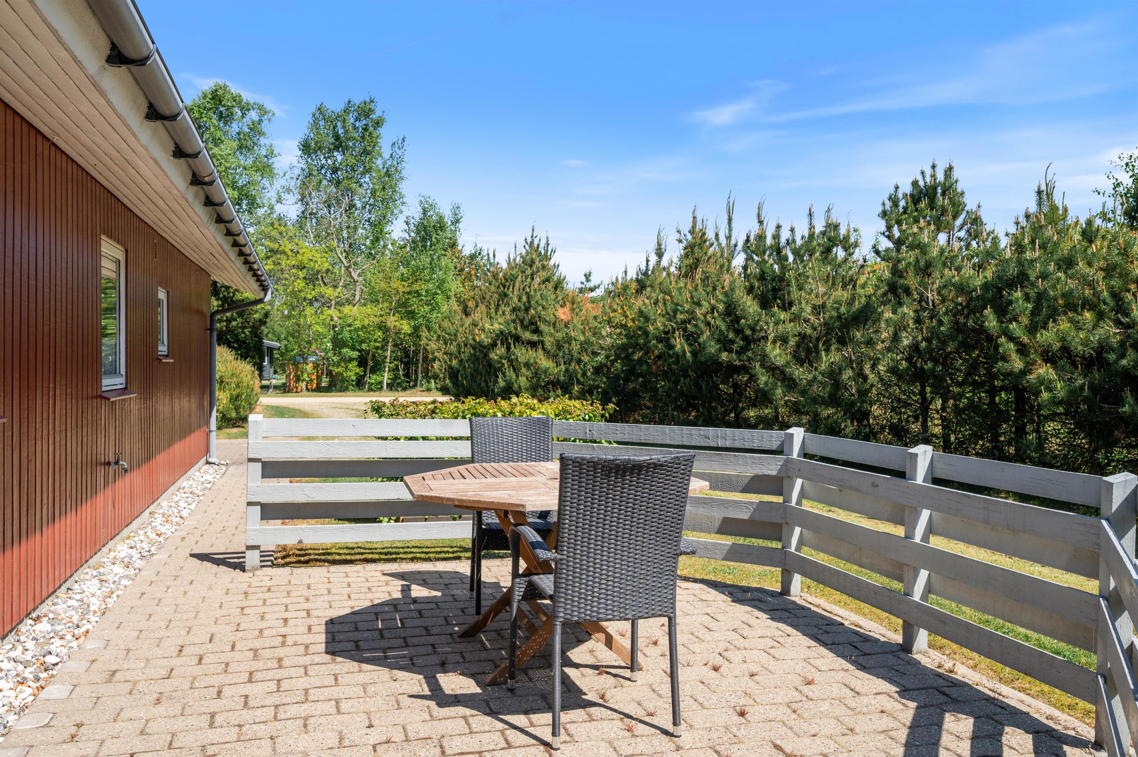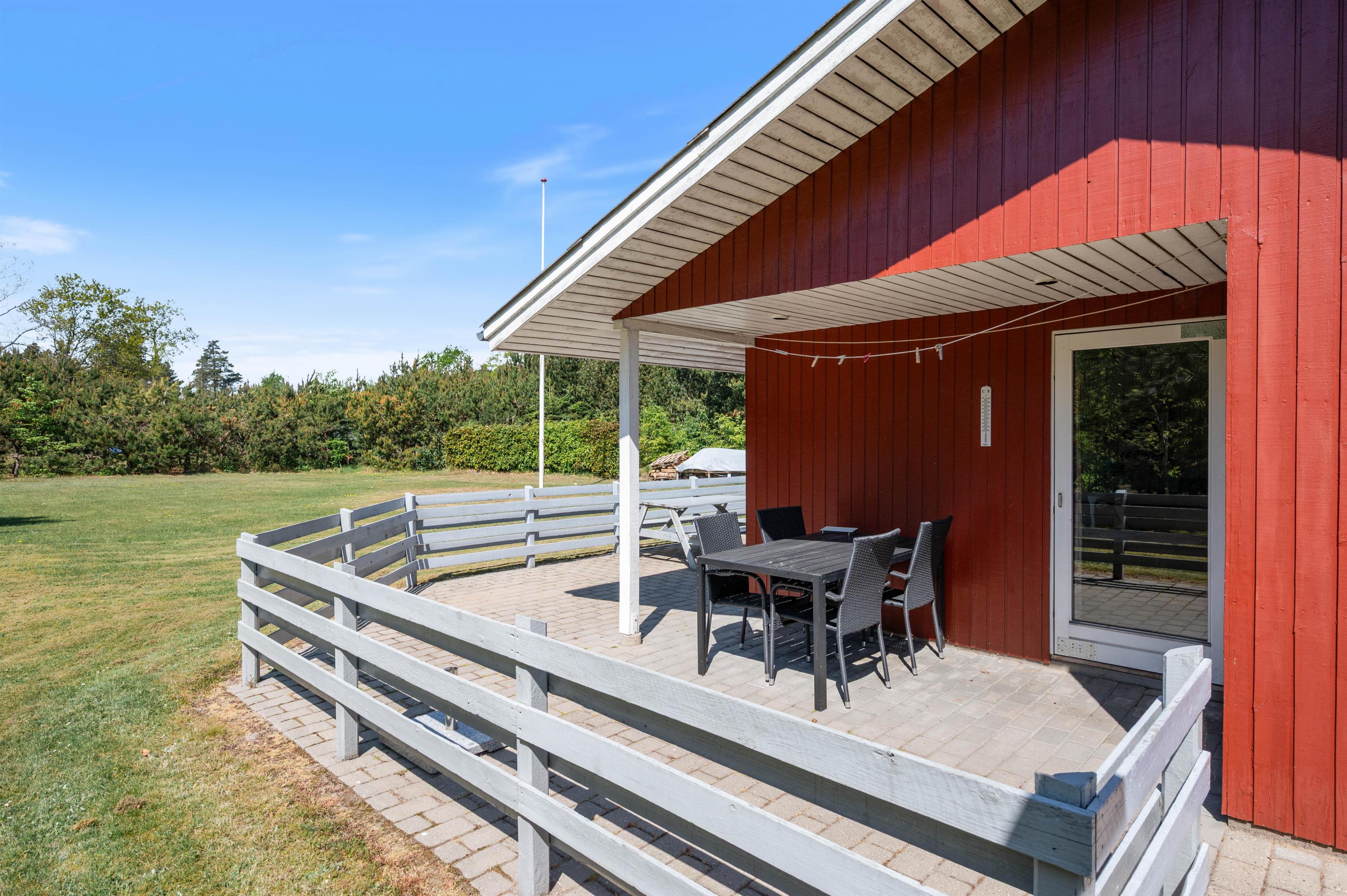 Sommerhuset ligger på en skøn 1.720 m2 stor, lukket grund, som er omkranset af træer og buske. Det giver læ, så I kan nyde jeres ferie i fred og ro. Huset har flere terrasser, så I har mulighed for at finde sol og læ.