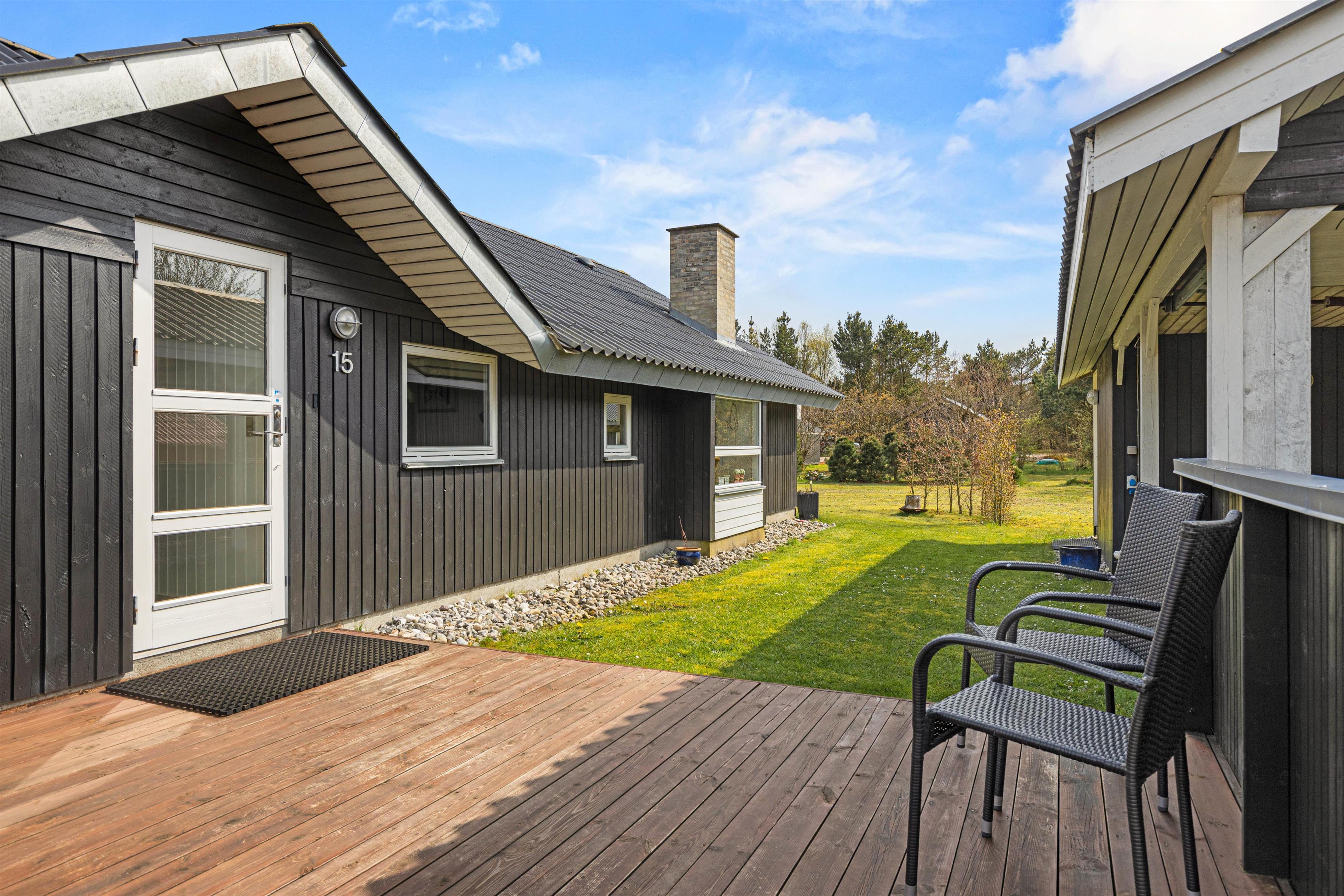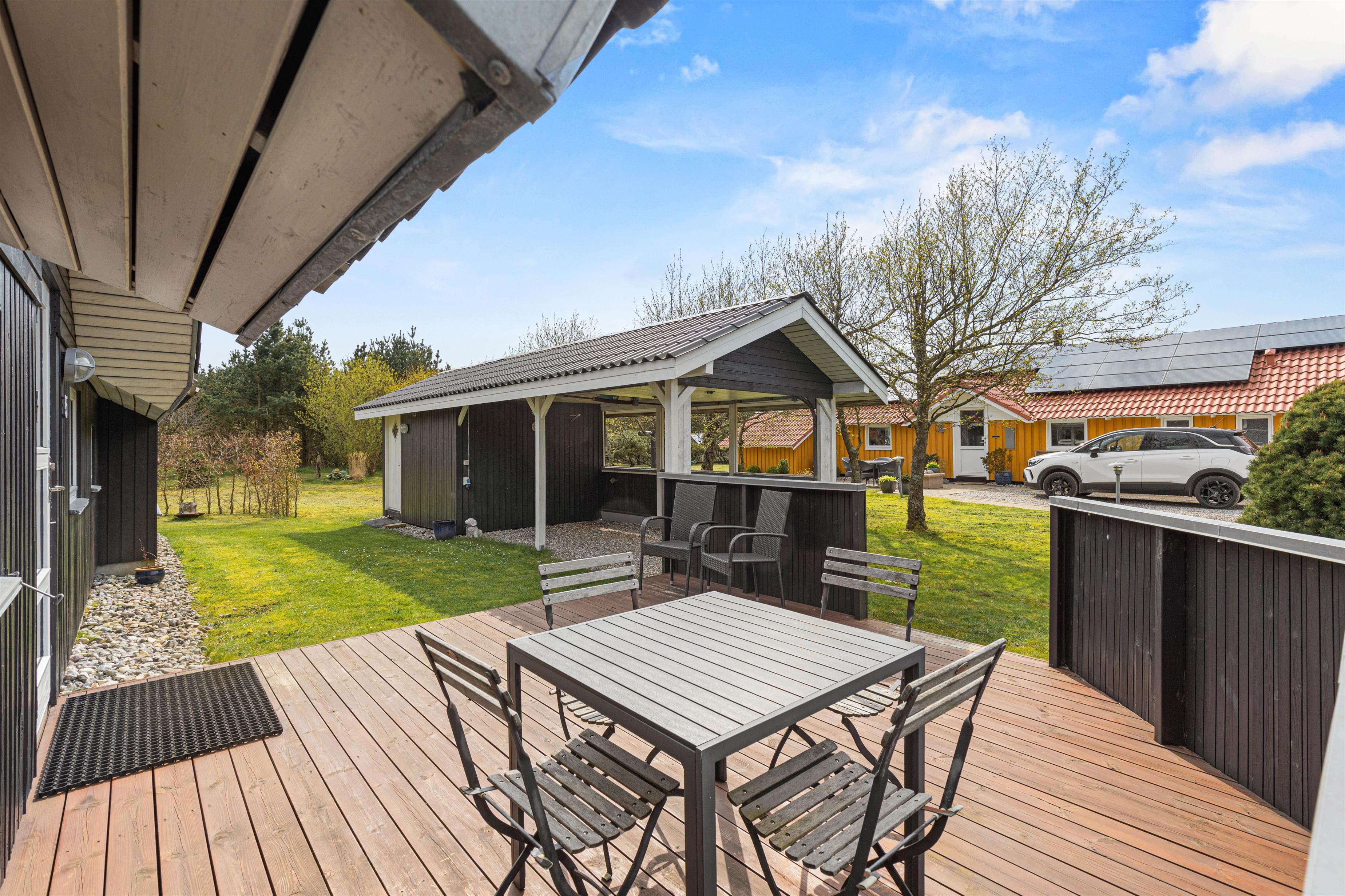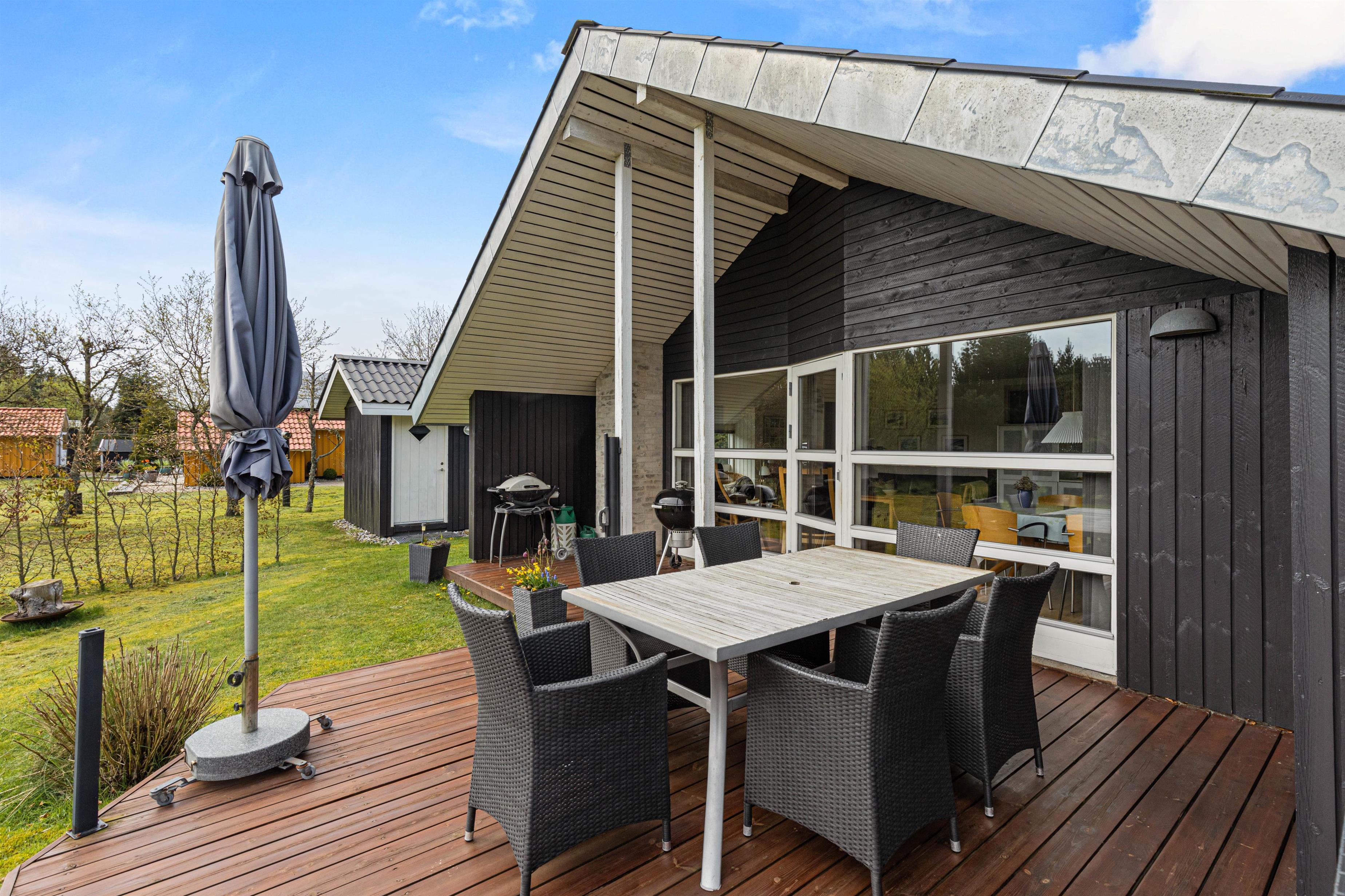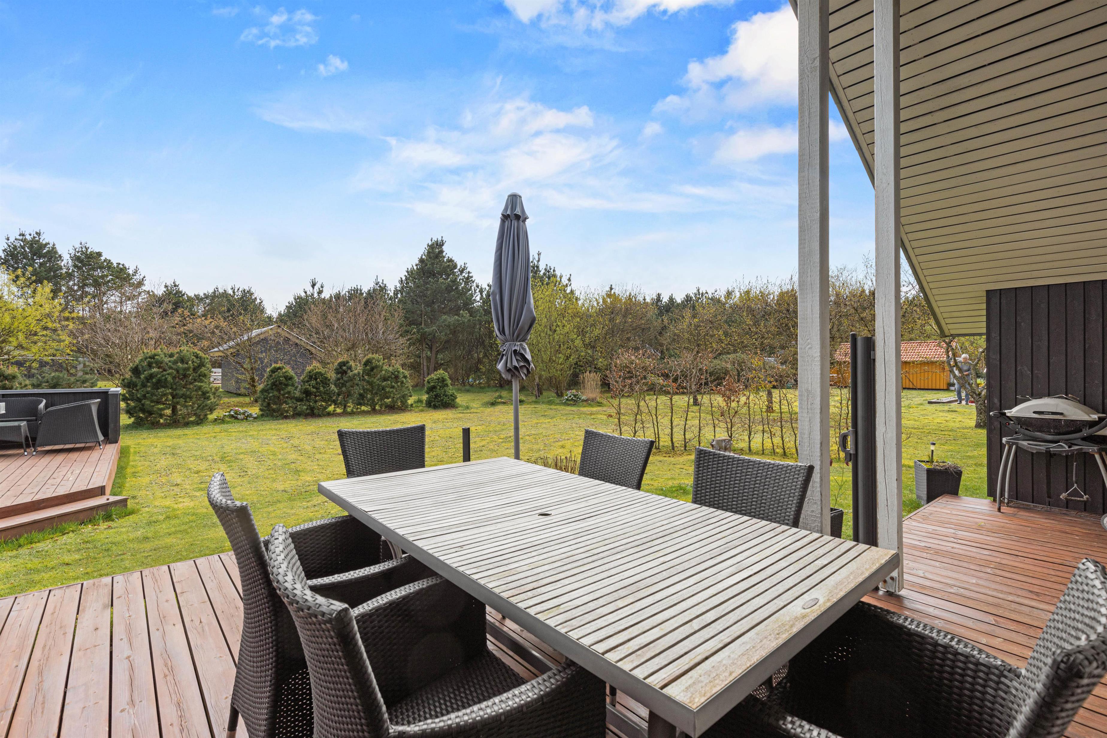 Når I går ud af stuens terrassedør i syd, står I på den skønne træterrasse, hvorfra der er blik udover den skønne have og fuglene kvidrer i baggrunden. På terrassen venter havemøbler og liggestole på jer, og her kan I nyde frokosten med grillede pølser fra grillen – her kan I også sidde i skygge og læ under halvtaget.