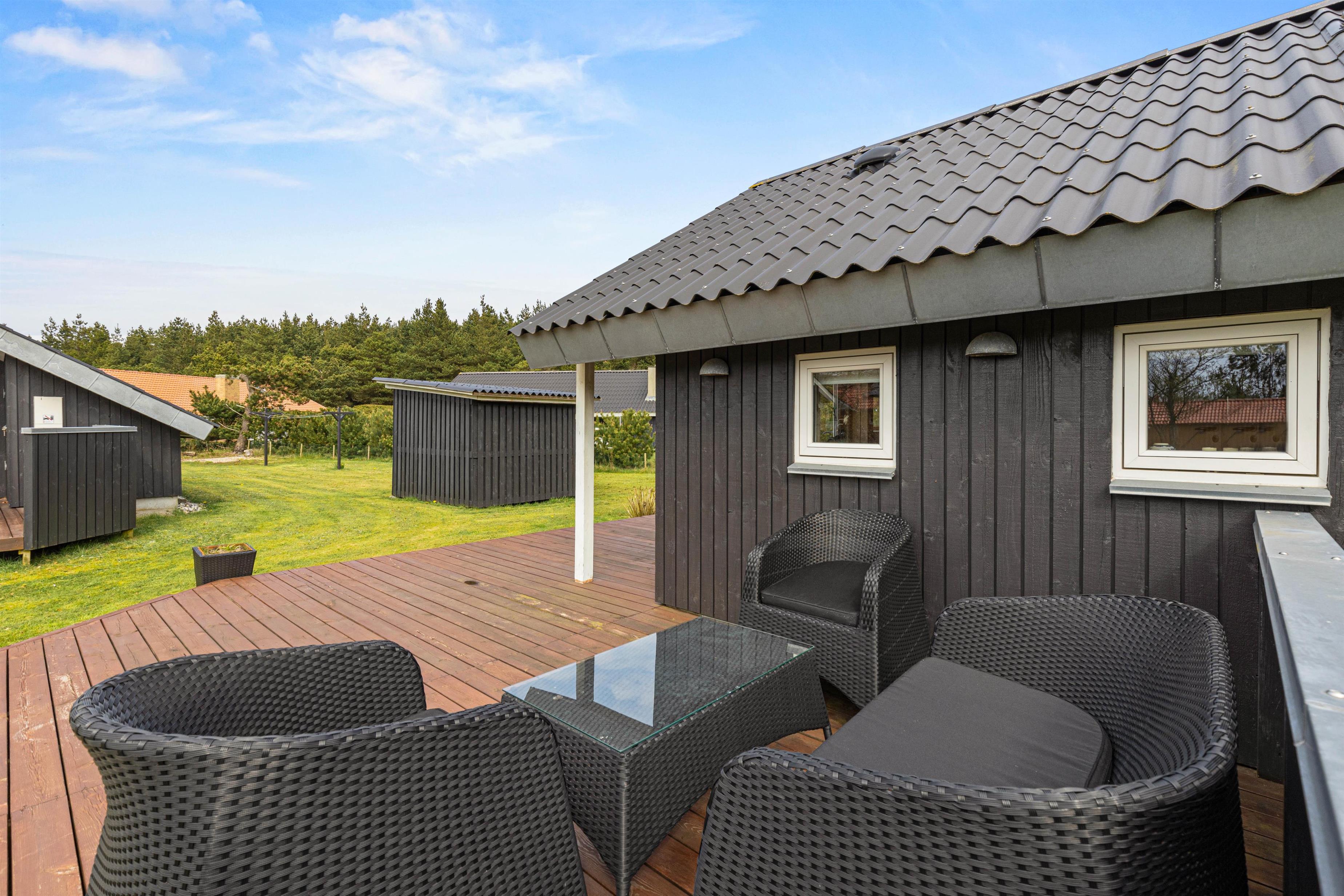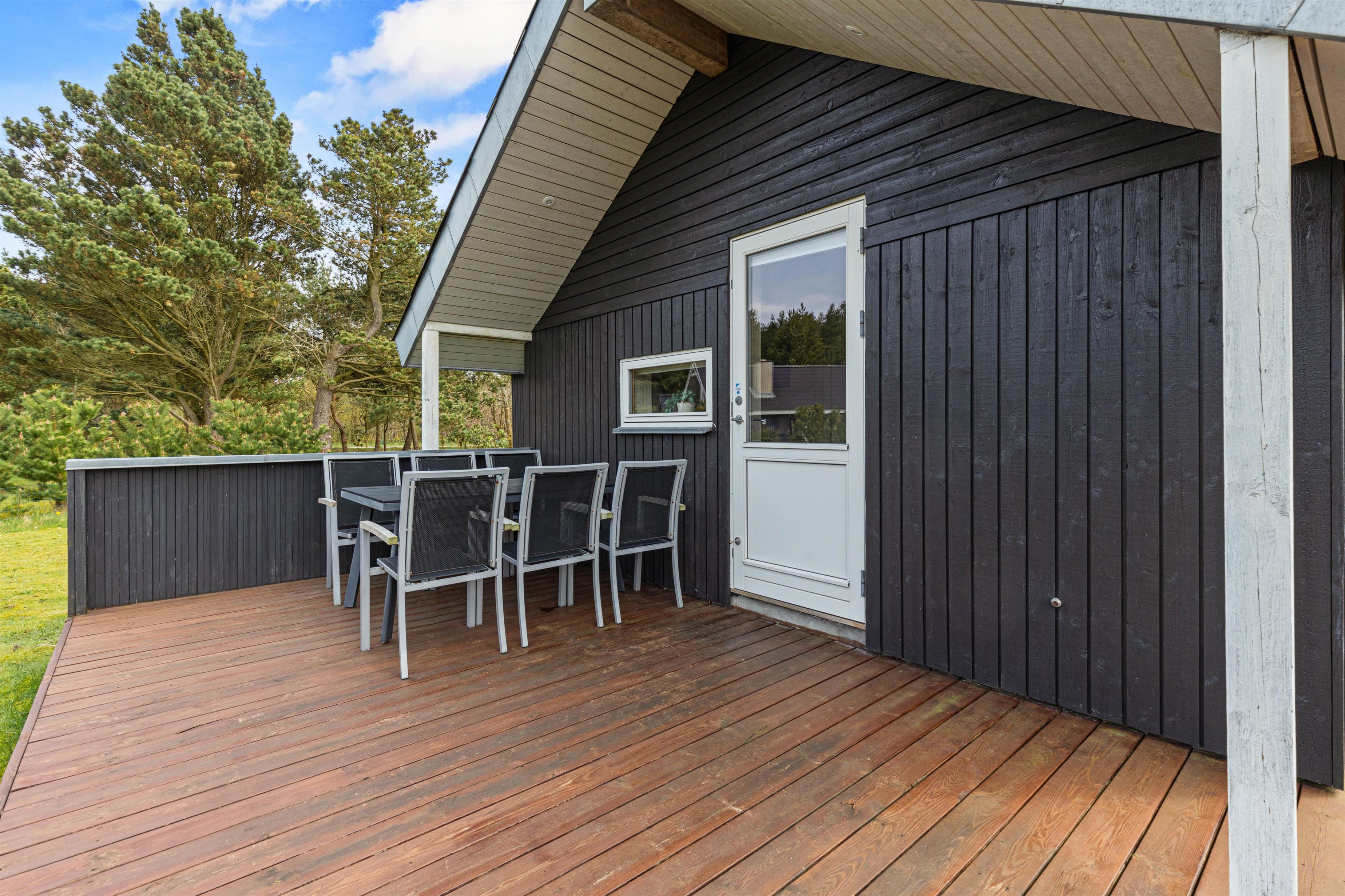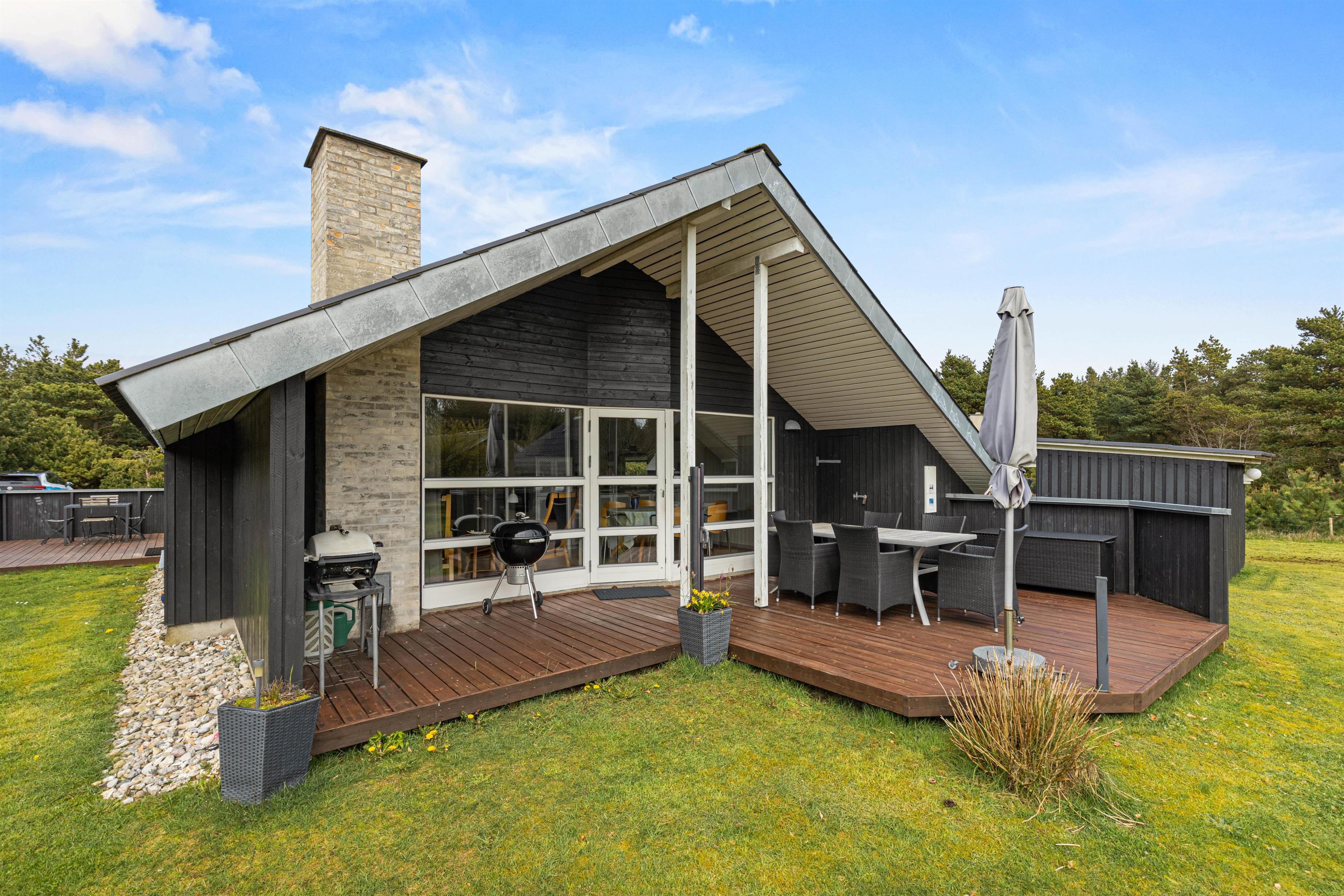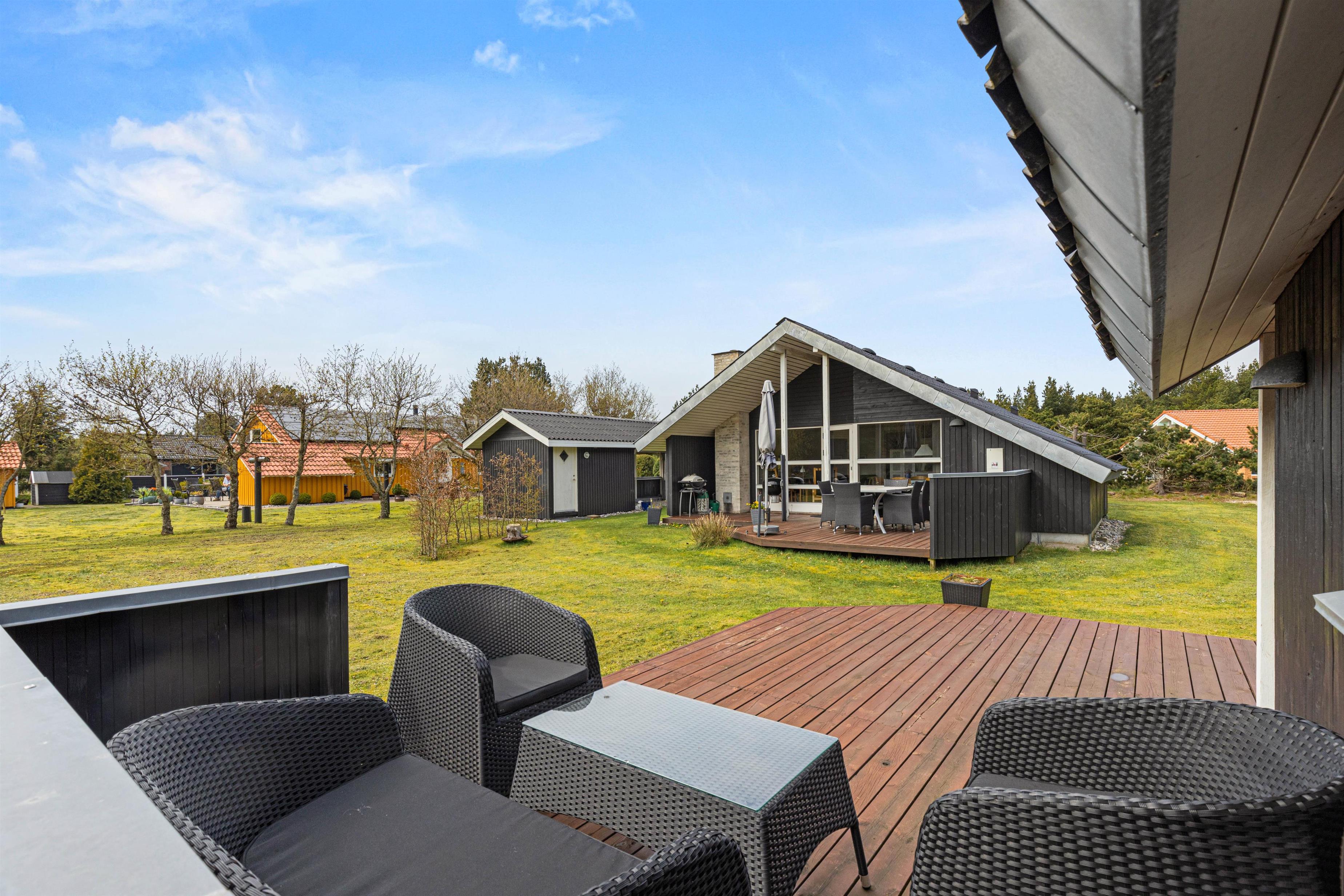 Når I går ud af stuens terrassedør i syd, står I på den skønne træterrasse, hvorfra der er blik udover den skønne have og fuglene kvidrer i baggrunden. På terrassen venter havemøbler og liggestole på jer, og her kan I nyde frokosten med grillede pølser fra grillen – her kan I også sidde i skygge og læ under halvtaget.