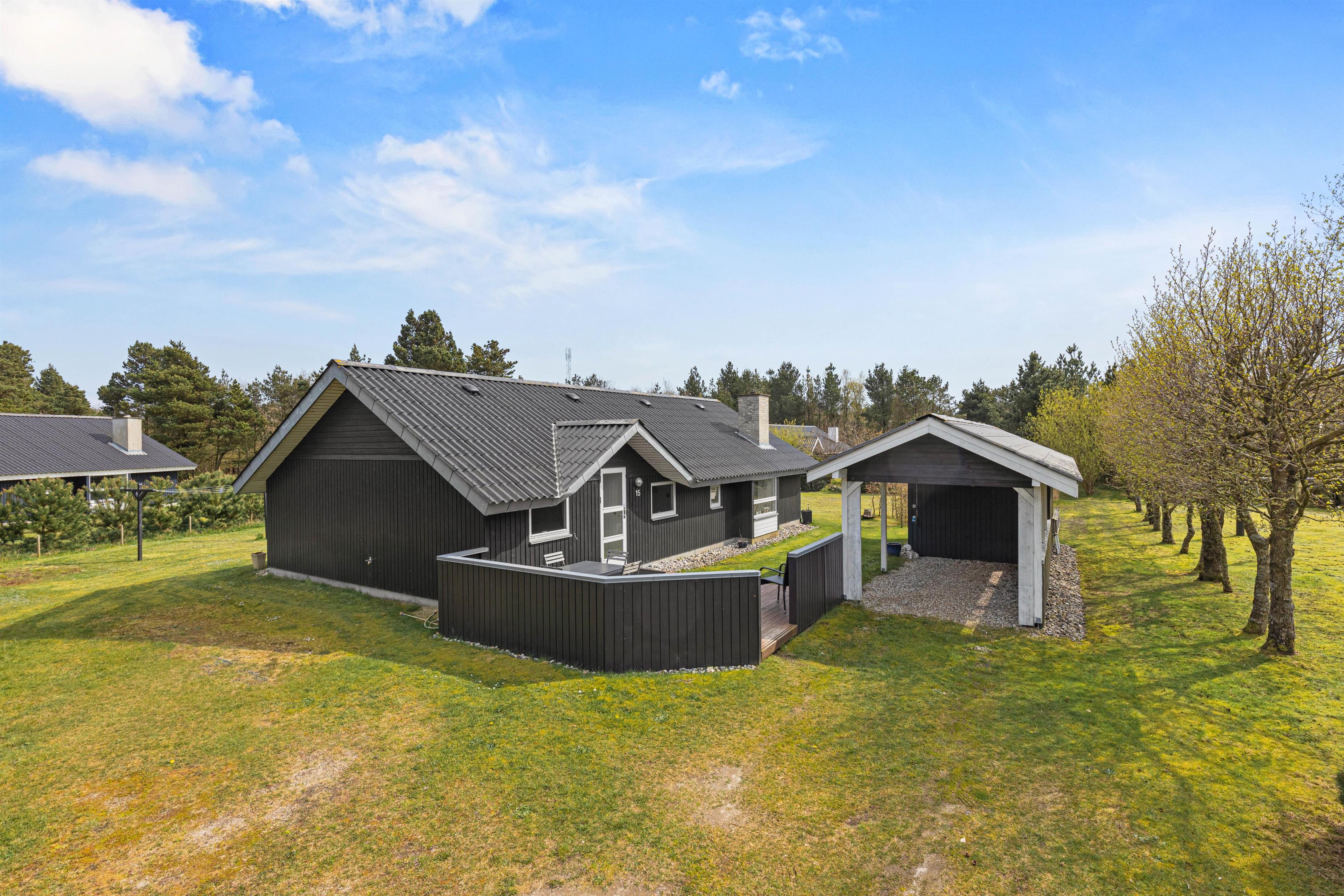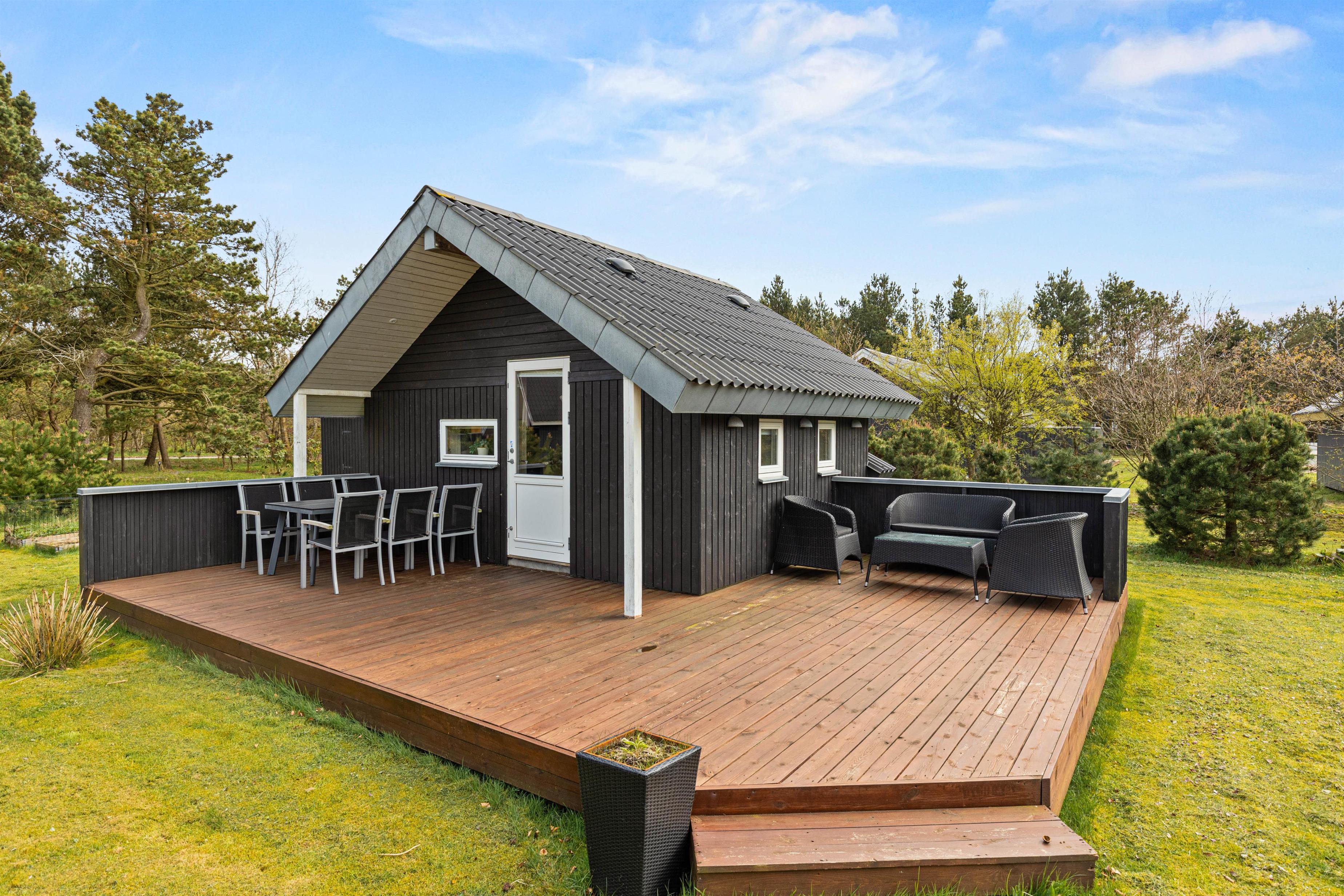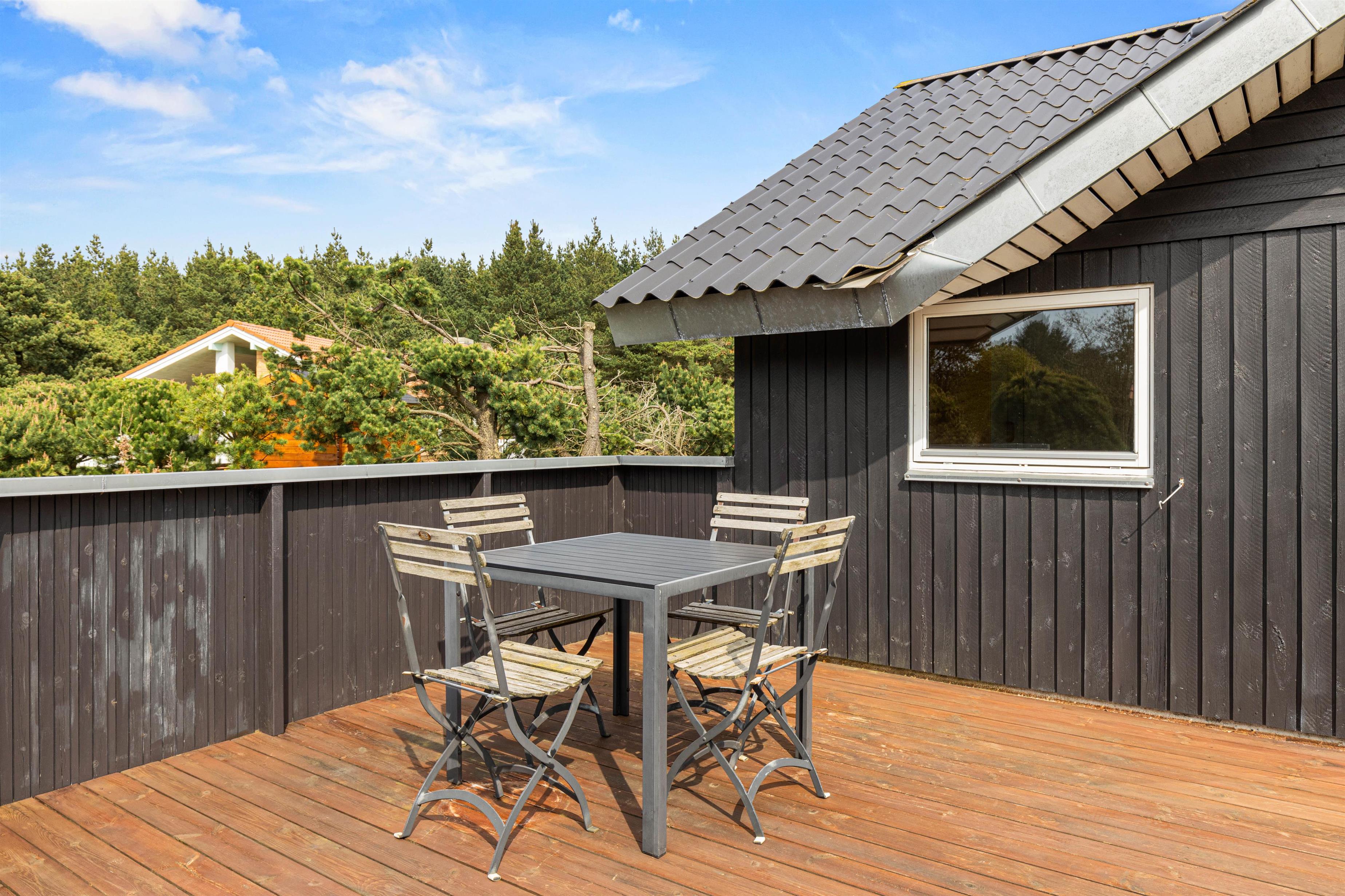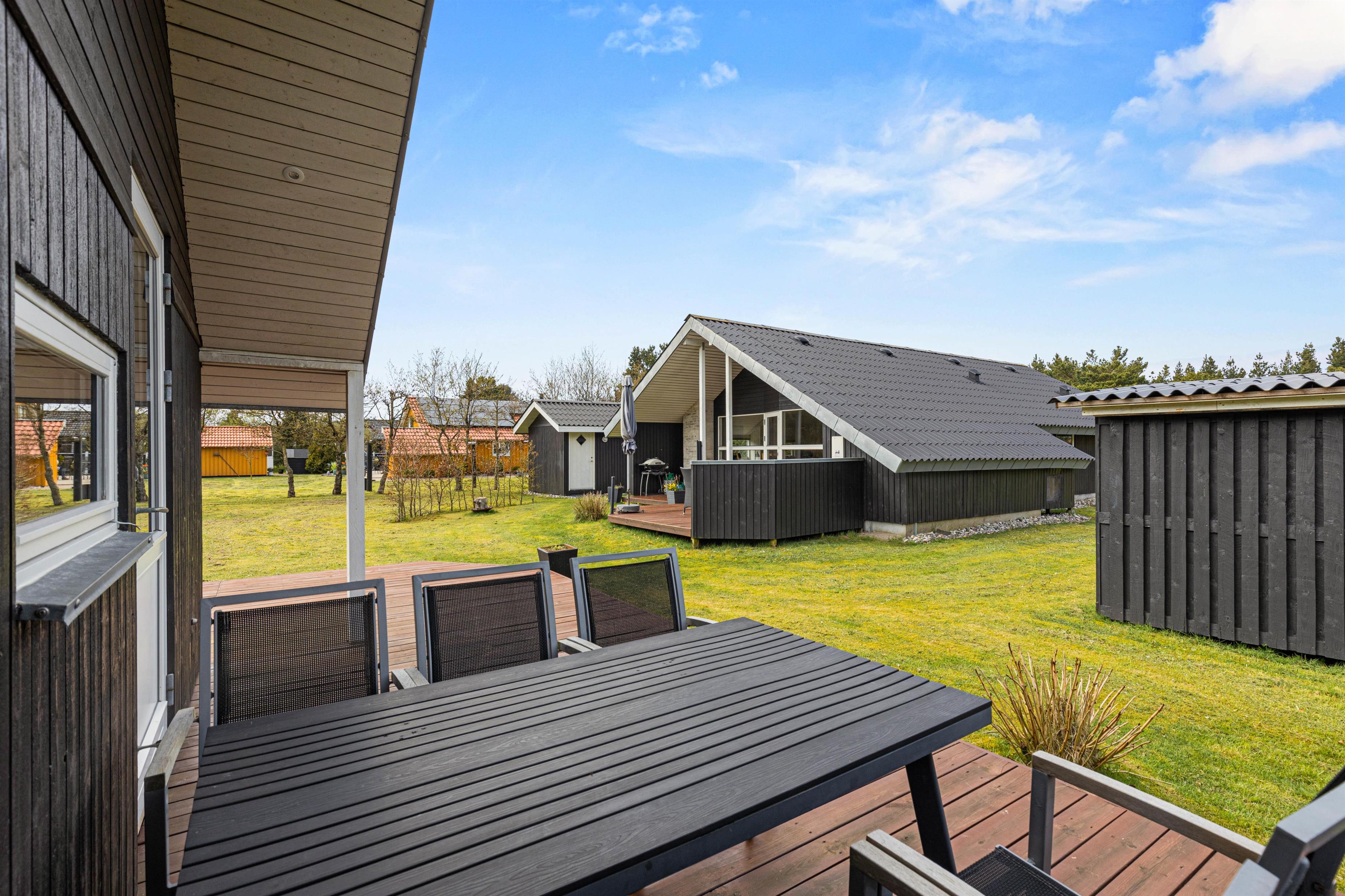 Når I går ud af stuens terrassedør i syd, står I på den skønne træterrasse, hvorfra der er blik udover den skønne have og fuglene kvidrer i baggrunden. På terrassen venter havemøbler og liggestole på jer, og her kan I nyde frokosten med grillede pølser fra grillen – her kan I også sidde i skygge og læ under halvtaget.