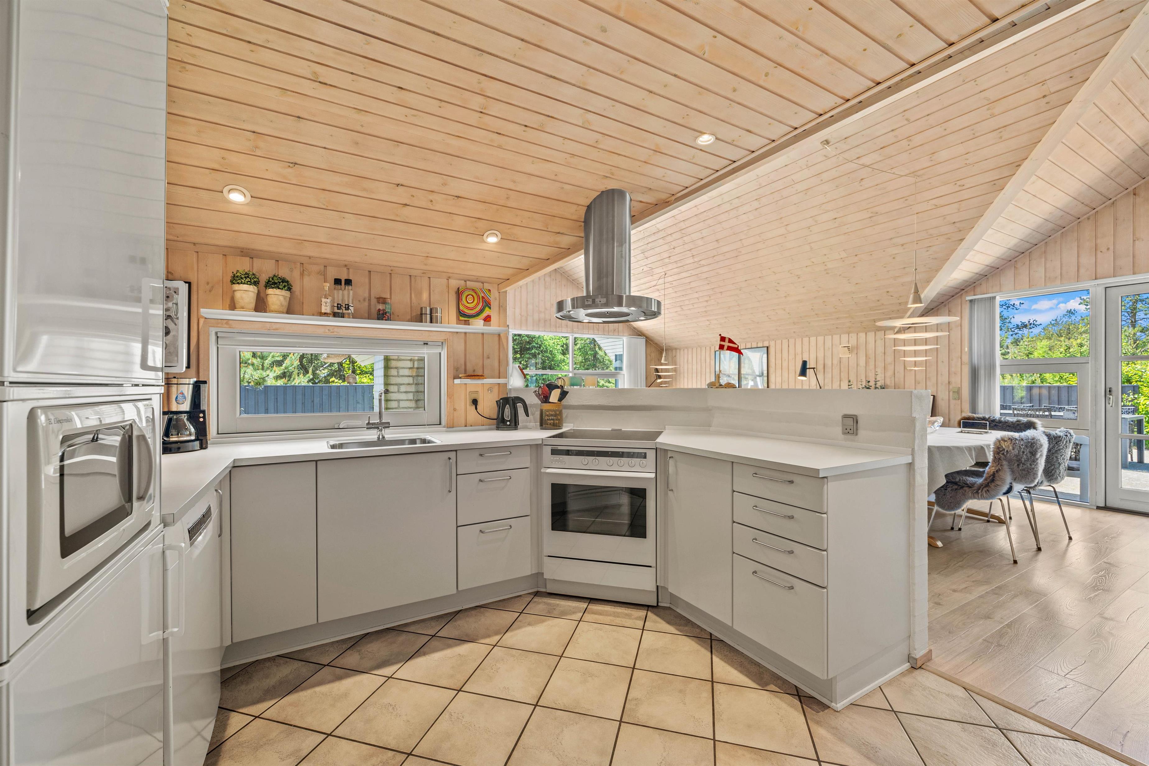 Inde i sommerhuset bliver I mødt af en lys og indbydende atmosfære, hvor træpanelerne strækker sig op til kip, og store vinduer lader det naturlige lys strømme ind. Den åbne indretning forbinder køkken, spisestue og stue på en elegant måde, så I let kan nyde hinandens selskab fra ethvert hjørne af ferieboligen. Og takket være opvaskemaskinen bliver oprydningen efter måltiderne en leg.