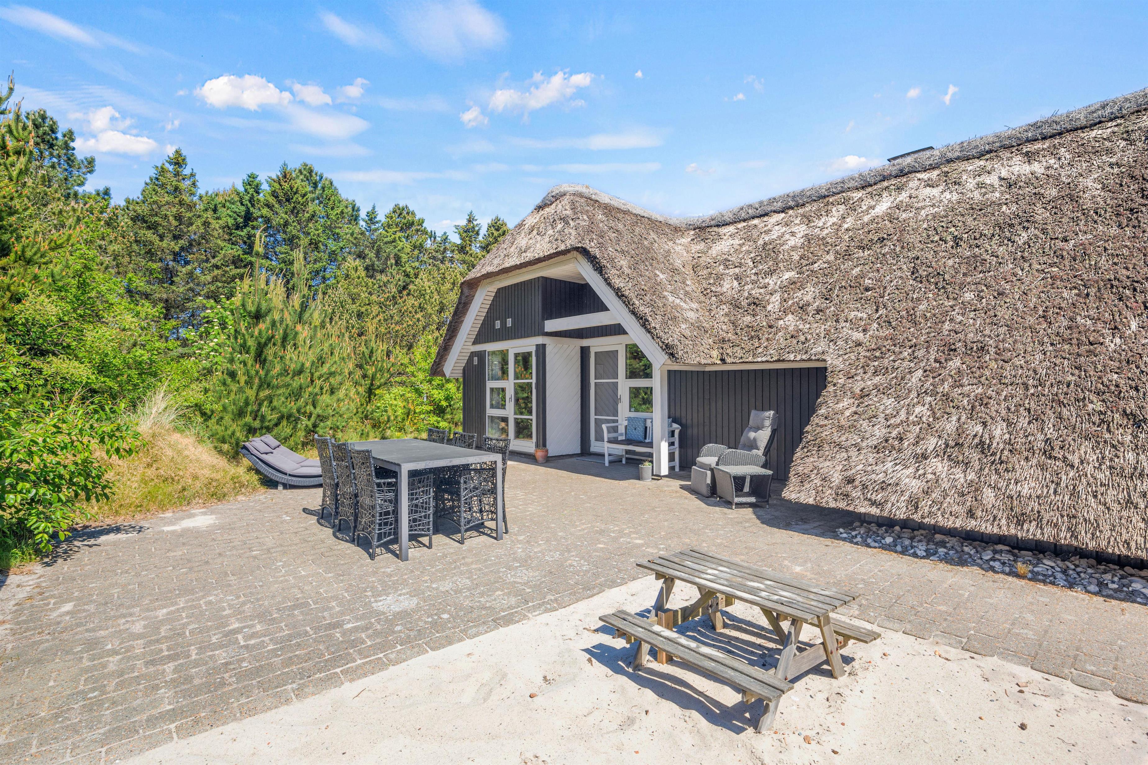 Fra sommerhusets stue åbner terrassedørene sig ud til en rummelig terrasse, der omkranser hele sommerhuset - så der altid er et solrigt spot at nyde morgenkaffen eller et afslappende glas vin ved aftenstid.