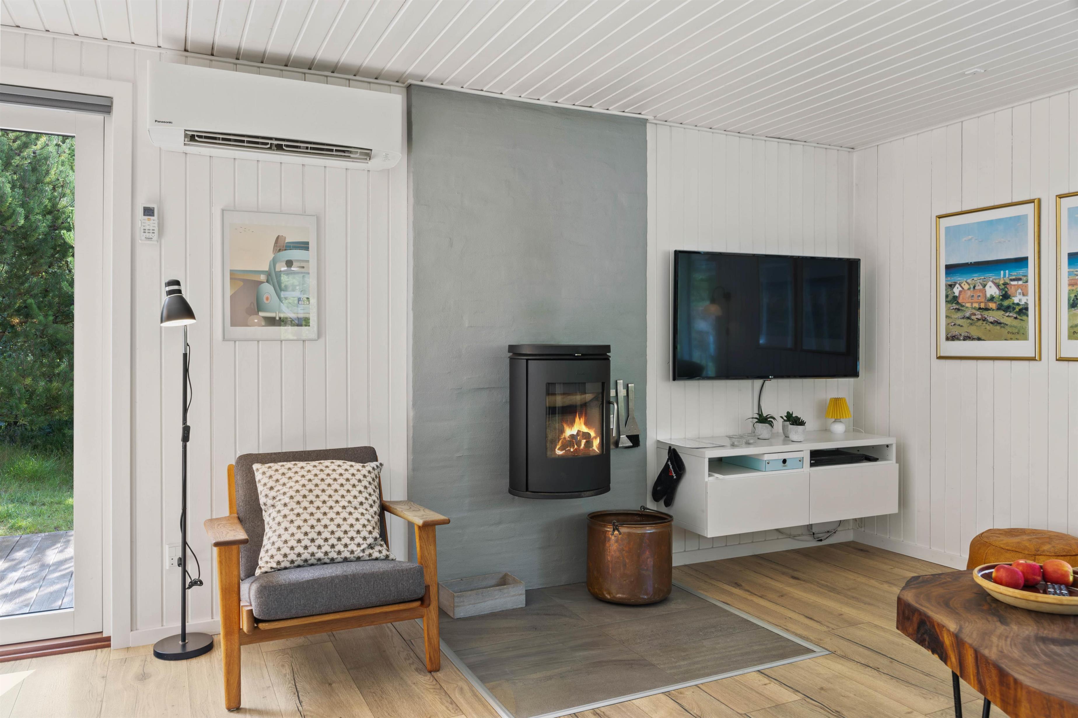Opholdsrummet med stue og spiseafdeling ligger i åben forbindelse med køkken, og det giver mulighed for masser af skønt samvær. I sofahjørnet står brændeovnen, som med sine knitrende flammer spreder varme og skøn atmosfære på selv de koldeste feriedage, og gennem de store vinduer har I udsyn til den grønne natur.