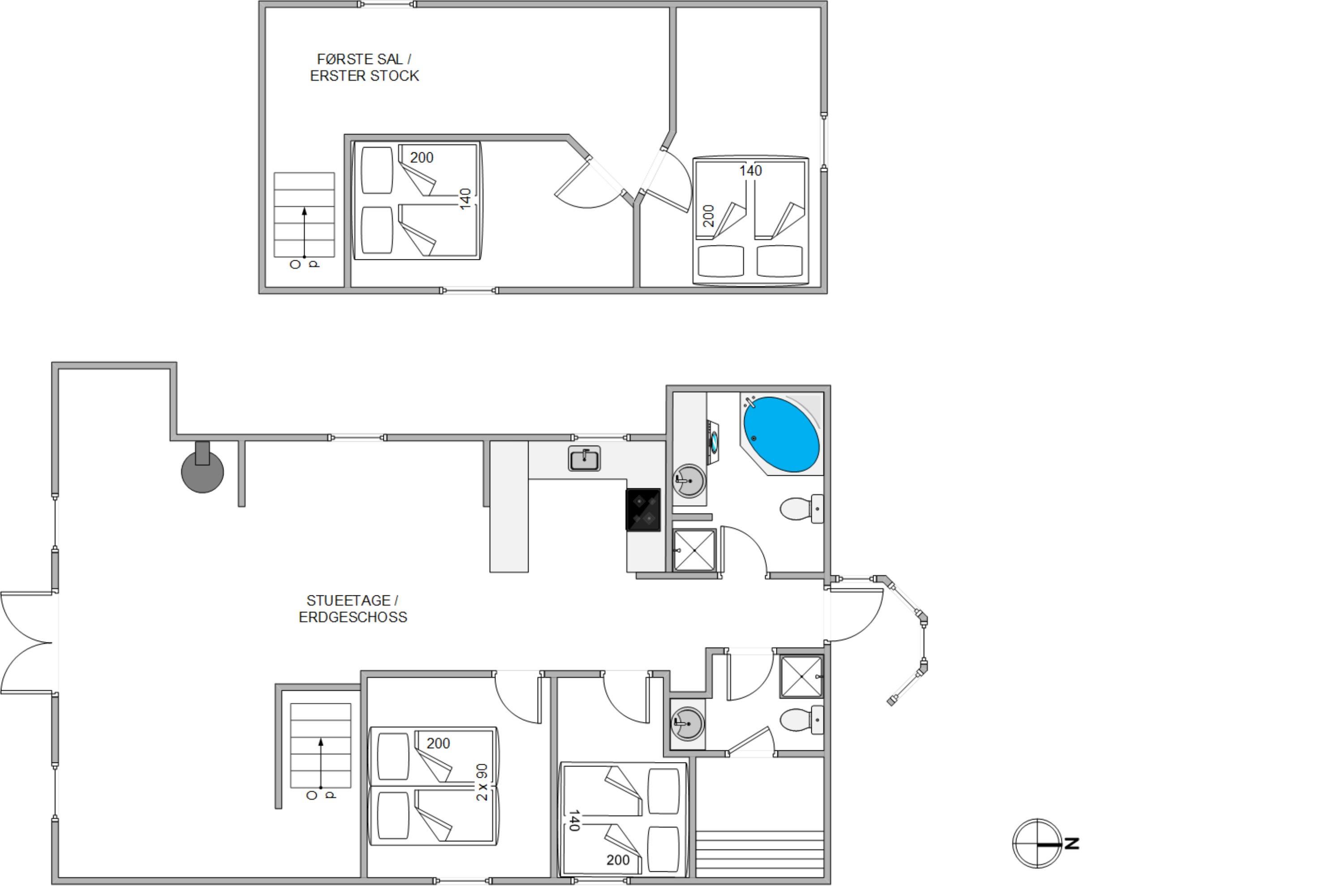Det flotte sommerhus er topmoderne og udstyret med både sauna og spabad, som I finder i det ene af to badeværelser. Her kan ferien virkelig nydes i fulde drag, specielt efter en lang gåtur eller udflugt i det blå. Spaen har endda stjernehimmel, som giver en ekstra behagelig og afslappende stemning.