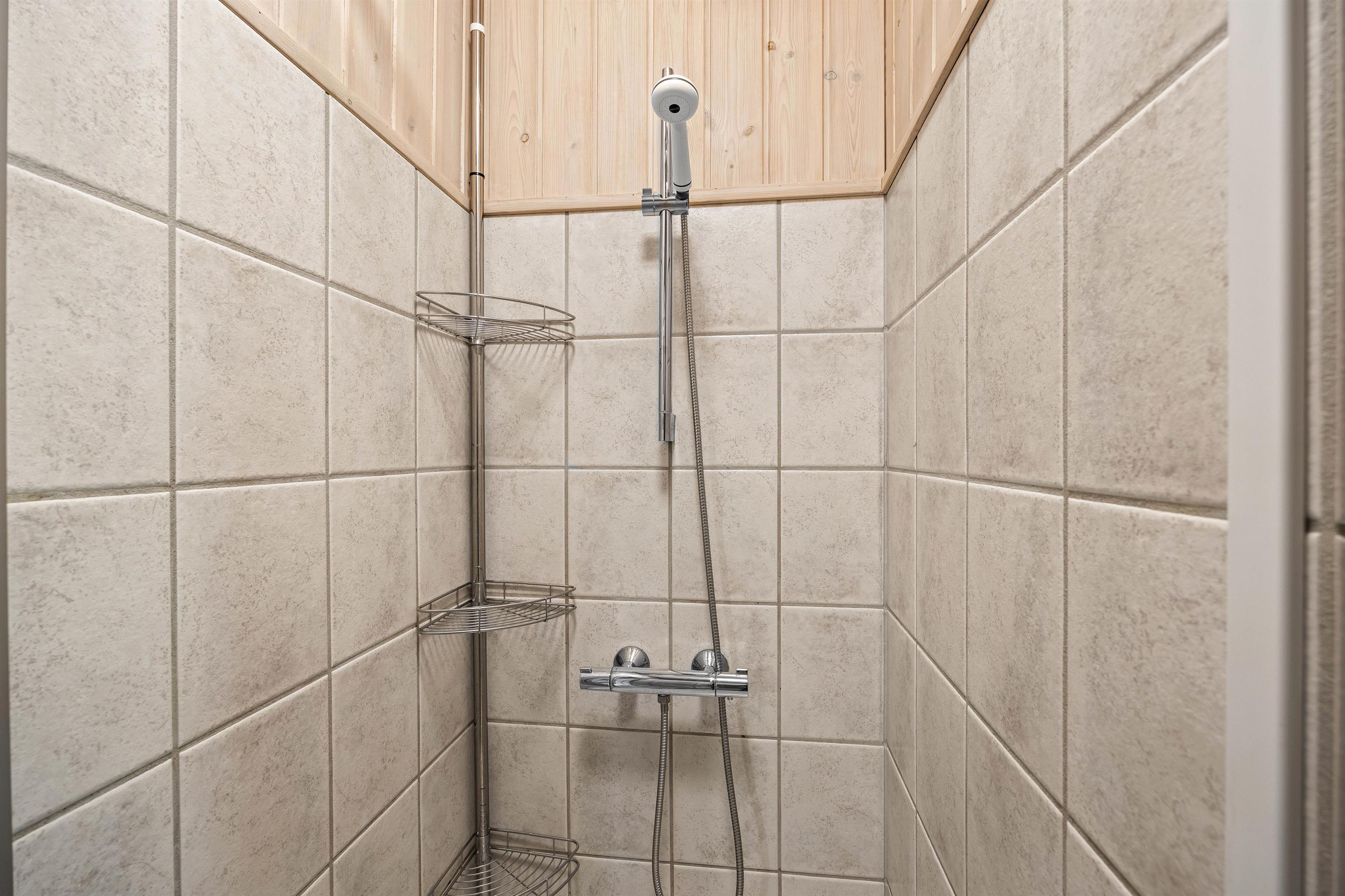 Badeværelset er praktisk indrettet for at give jer den bedst mulige oplevelse. Det er udstyret med gulvvarme, som sørger for, at I aldrig kommer til at fryse, når der skal børstes tænder om morgenen.