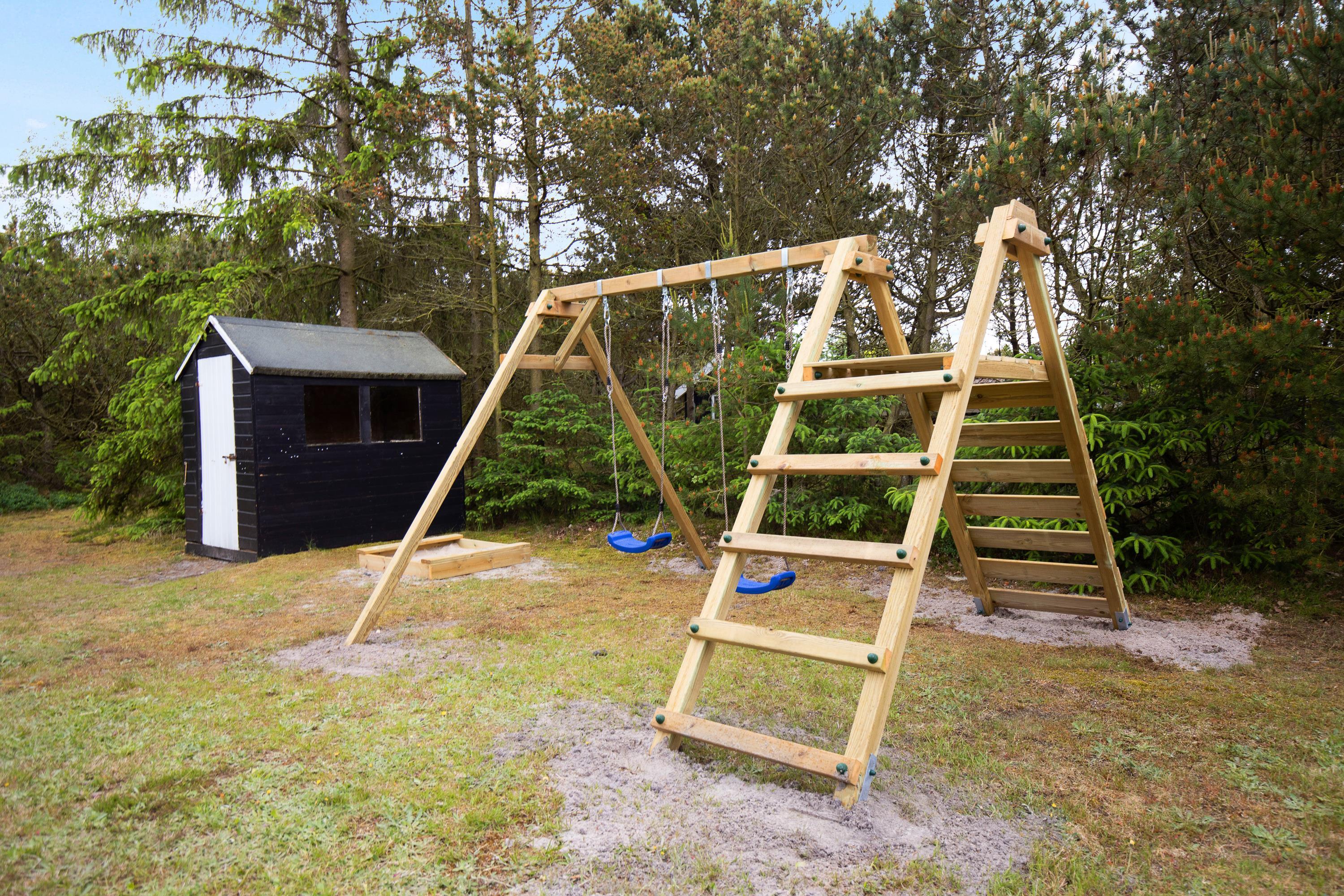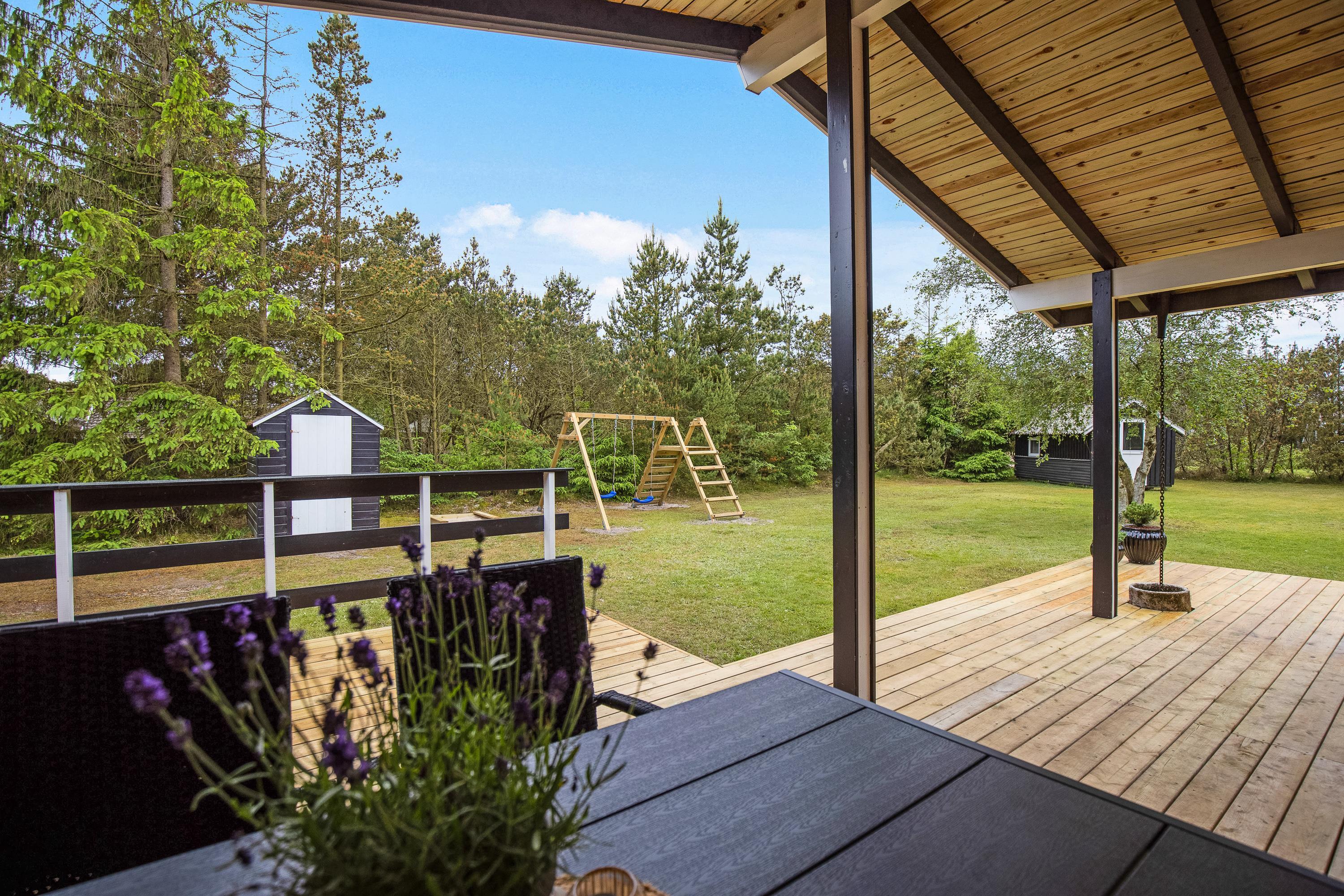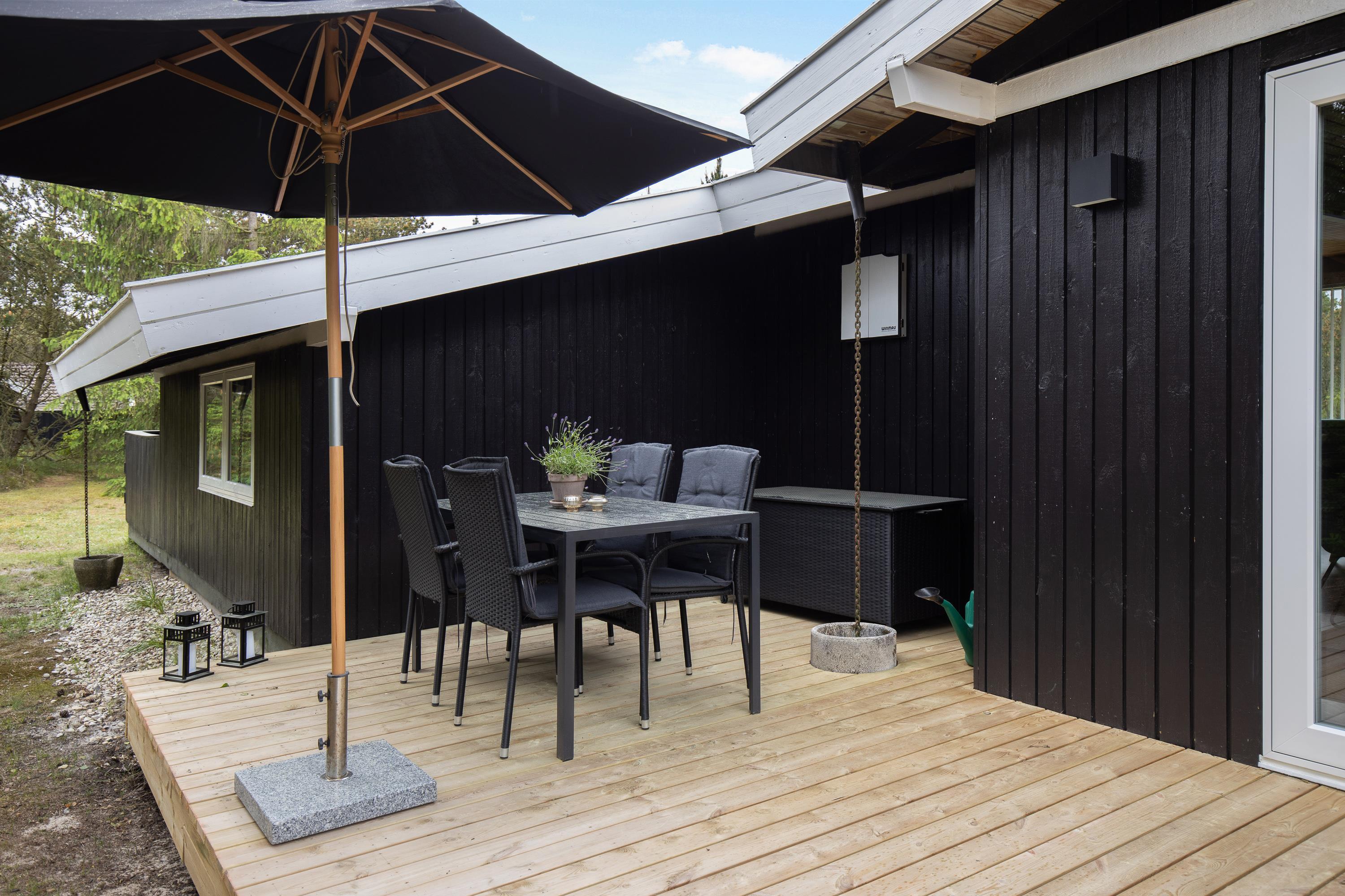 Fra soveværelset og stuen er der direkte udgang til den store træterrasse. Terrassen følger hele husets syd- og vestside og en del af den er overdækket. Her kan man nemt tilbringe hele dagen, - der er gode havemøbler, grill og liggestole. Vil man gerne være lidt aktiv, kan man svinge lidt i sansegyngen med børnene, deltage i legen ved legehuset eller måske spille lidt boldt på naturplænen. Om aftenen er terrassen perfekt til at grille, - skulle det dryppe lidt søger man blot ind under halvtaget. Der er ligeledes udgang fra køkken til mindre terrasse mod øst, hvor morgenkaffen kan nydes.