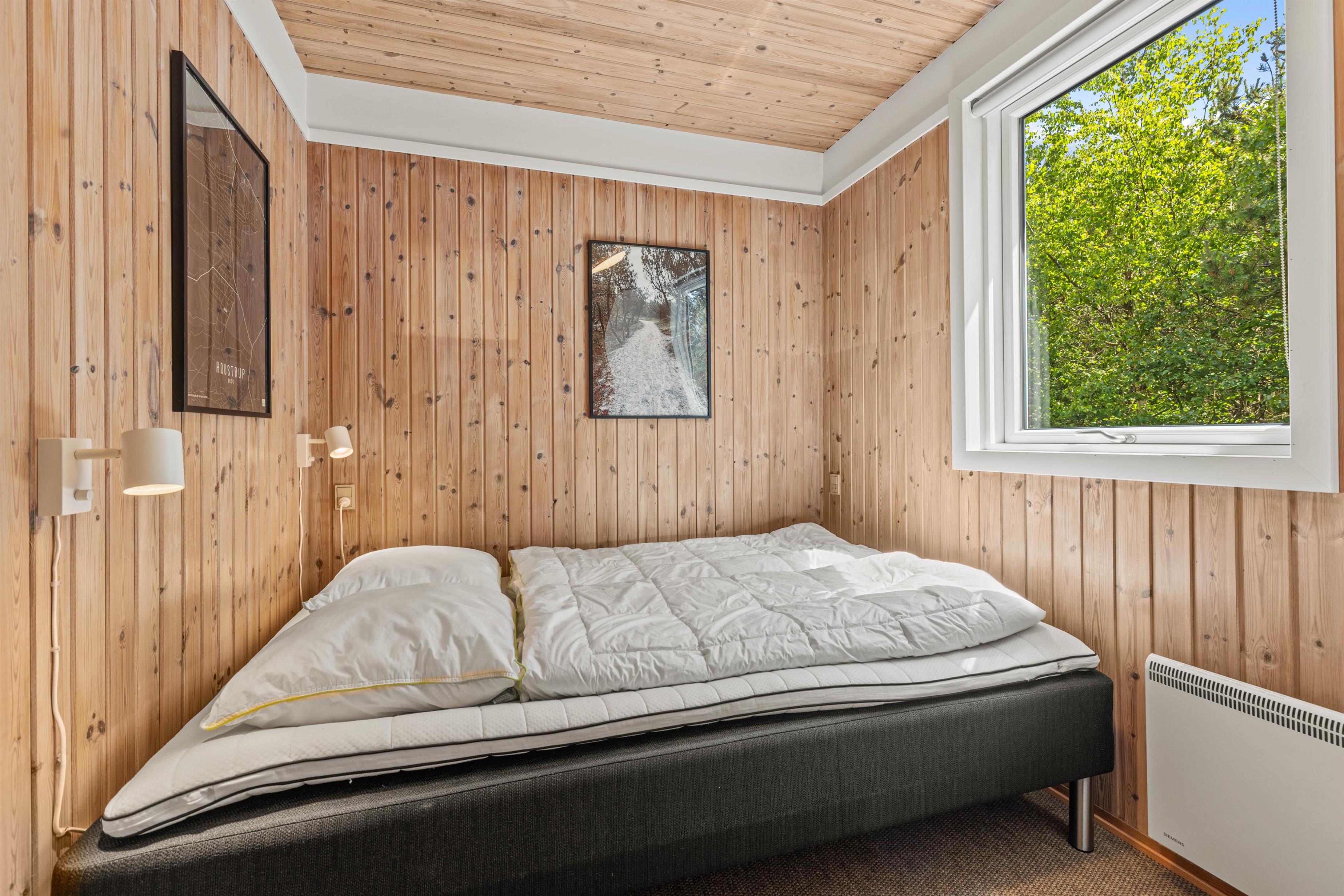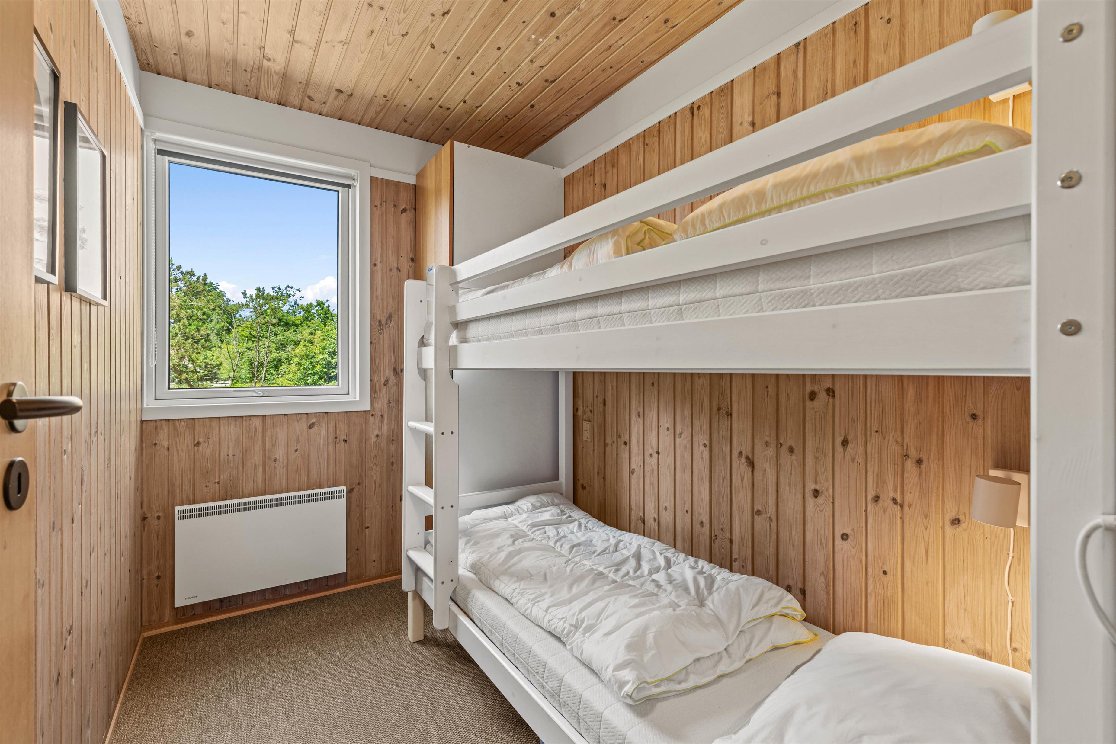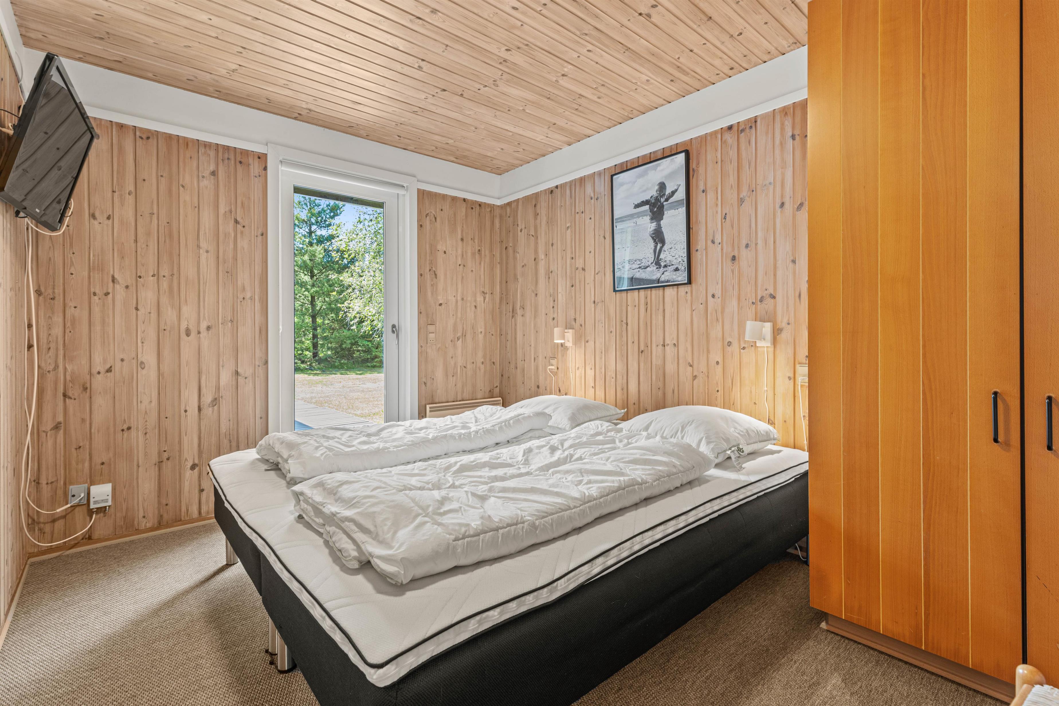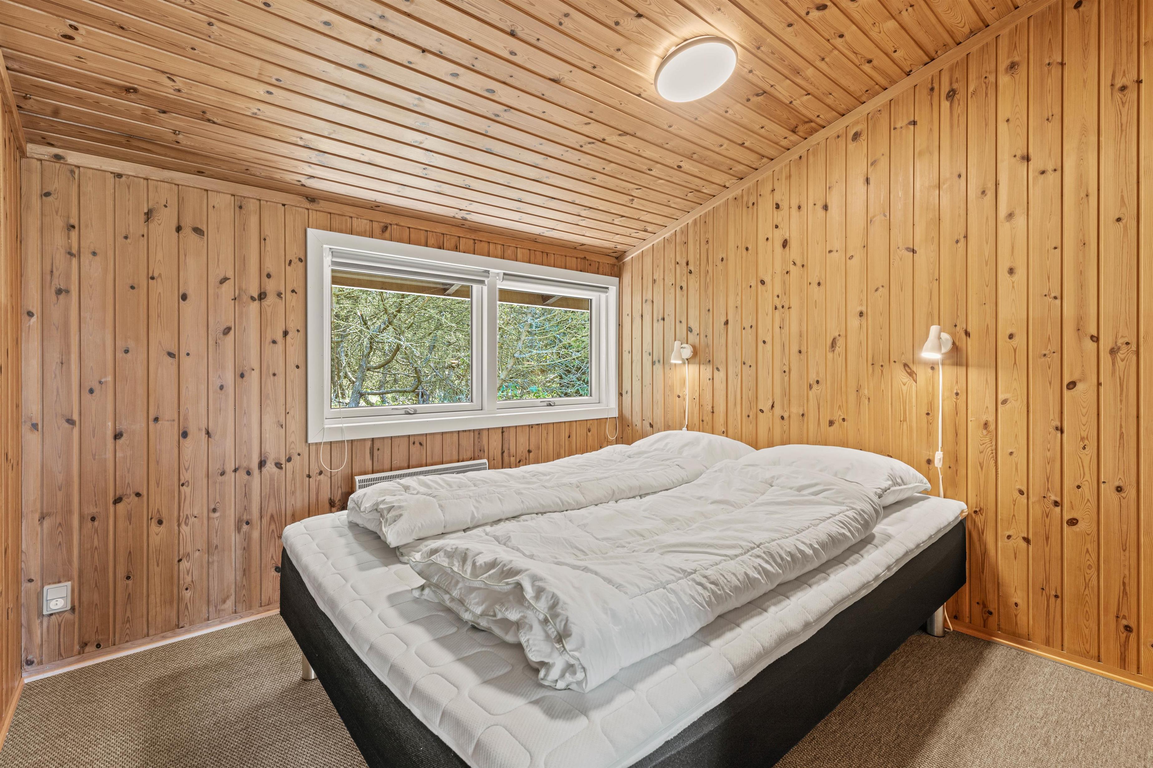 Velkommen til et dejligt feriehus med rigtig feriehusstemning! Huset er hyggeligt indrettet med bekvemme møbler, gode senge og træbeklædning på vægge og lofter. Her er plads til den store familie eller op til 3 vennepar. Her er 8 sovepladser fordelt på 4 rum, - et enkeltværelse med køjesenge og 3 værelser med dobbeltsenge. Det ene dobbeltværelse har egen udgang til terrassen og et stort fjernsyn på væggen.