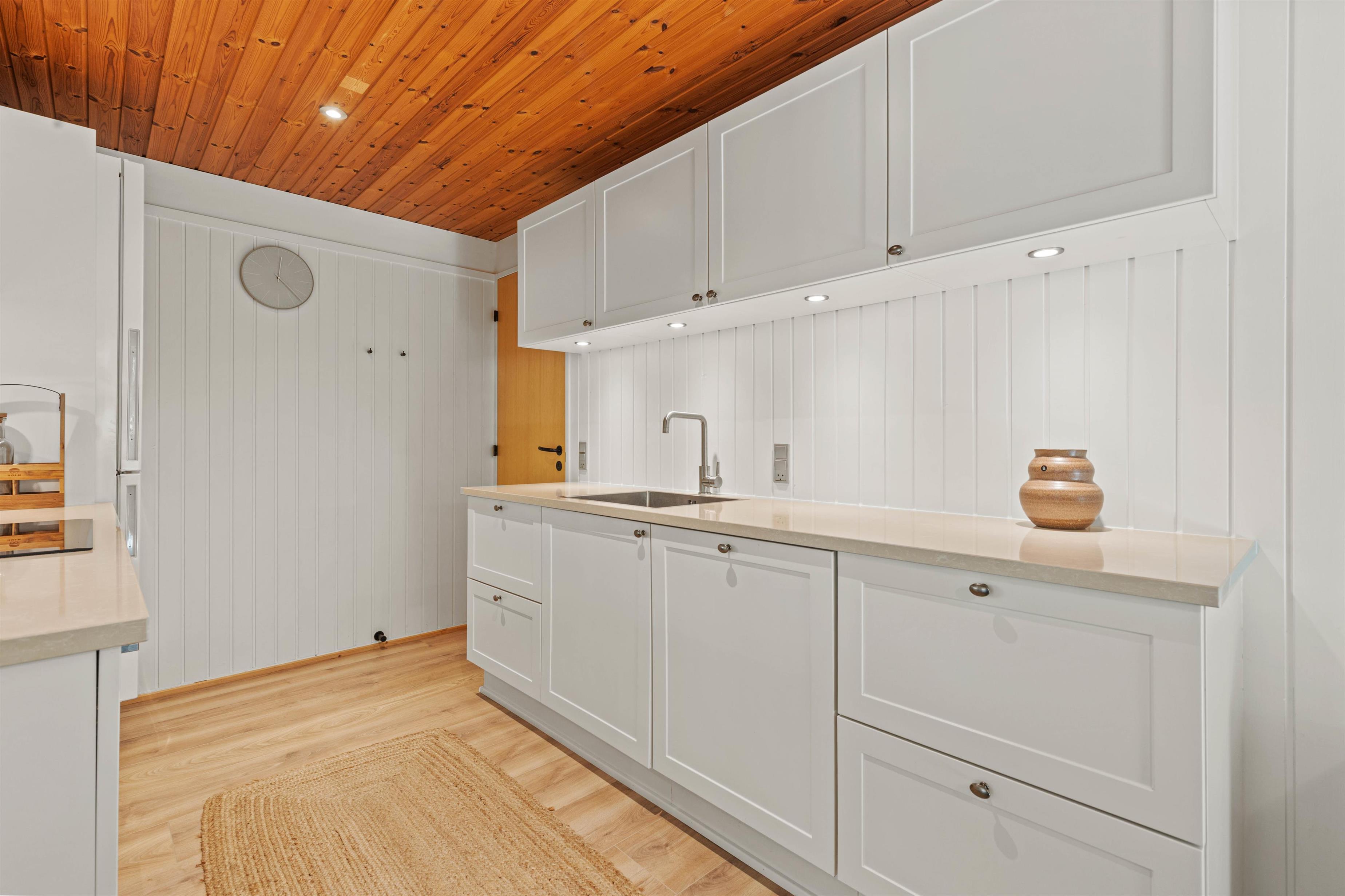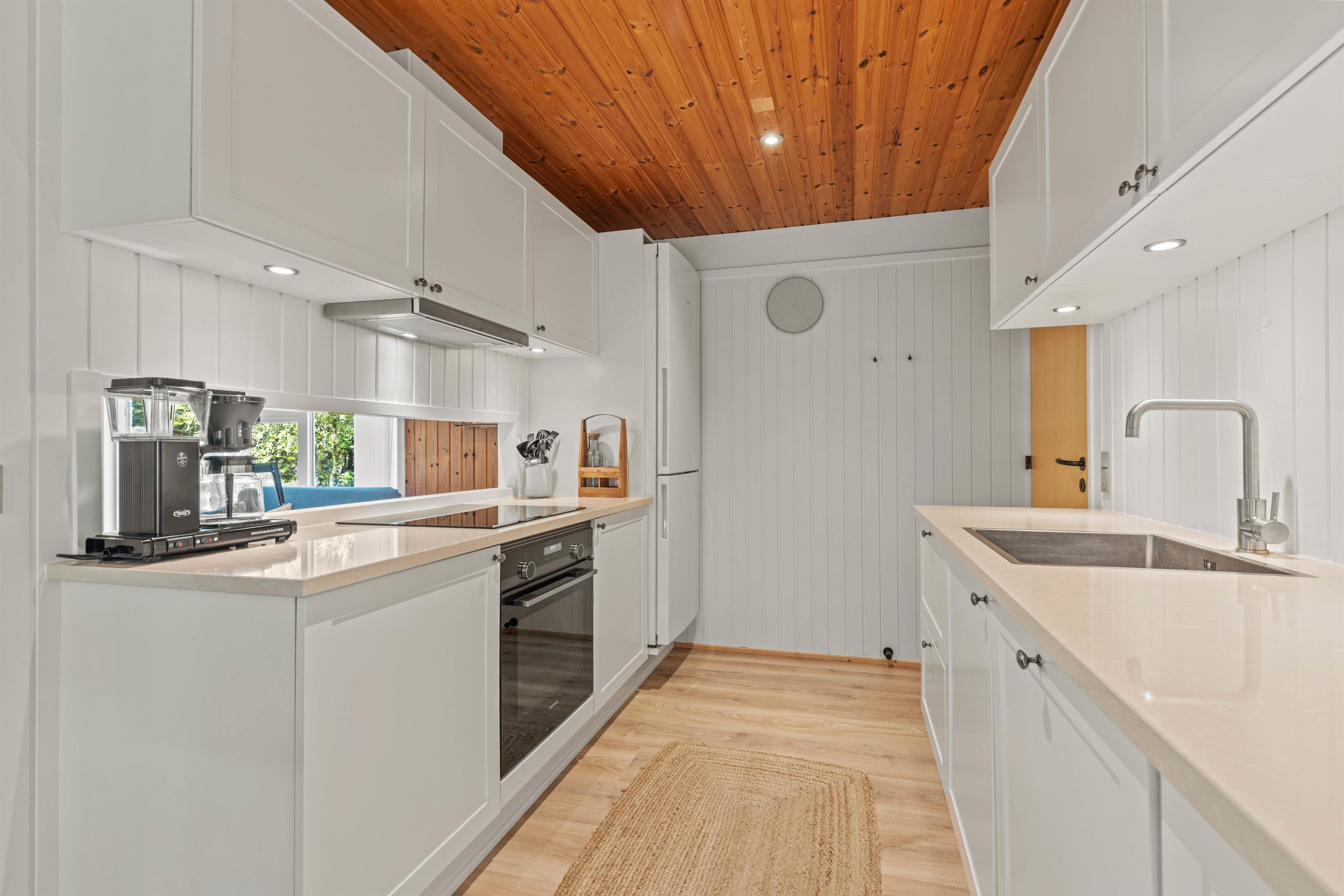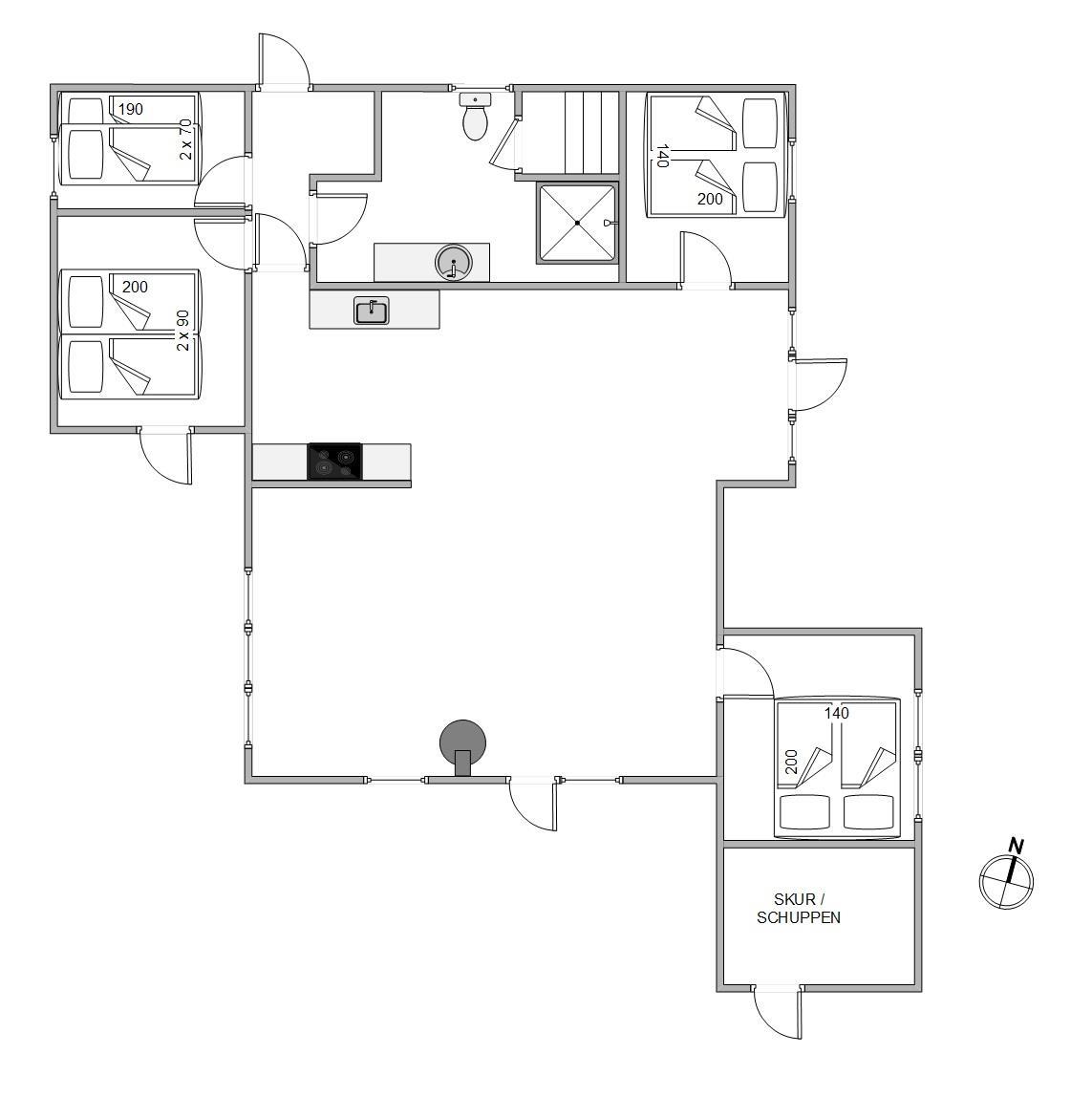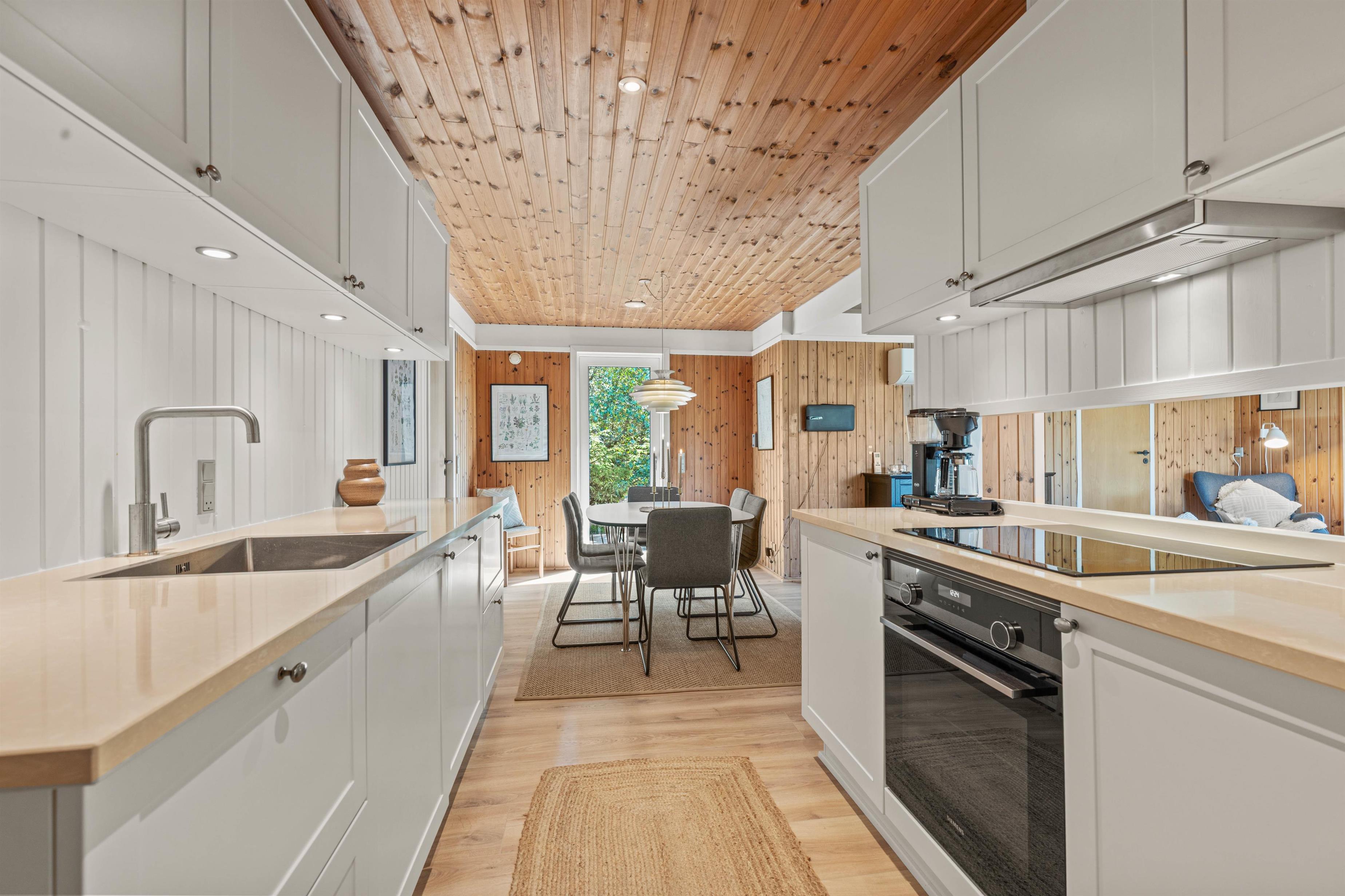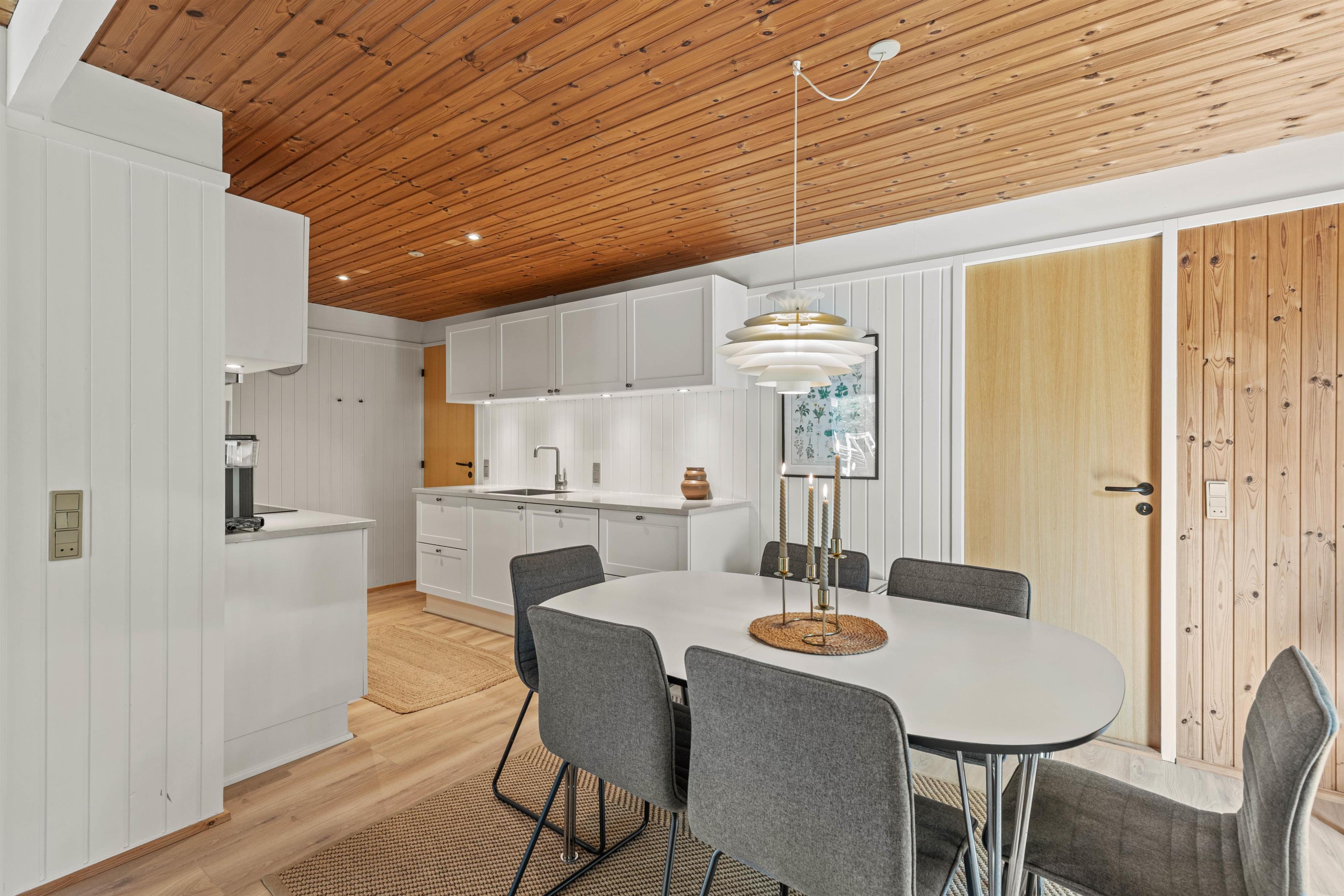 Velkommen til et dejligt feriehus med rigtig feriehusstemning! Huset er hyggeligt indrettet med bekvemme møbler, gode senge og træbeklædning på vægge og lofter. Her er plads til den store familie eller op til 3 vennepar. Her er 8 sovepladser fordelt på 4 rum, - et enkeltværelse med køjesenge og 3 værelser med dobbeltsenge. Det ene dobbeltværelse har egen udgang til terrassen og et stort fjernsyn på væggen.