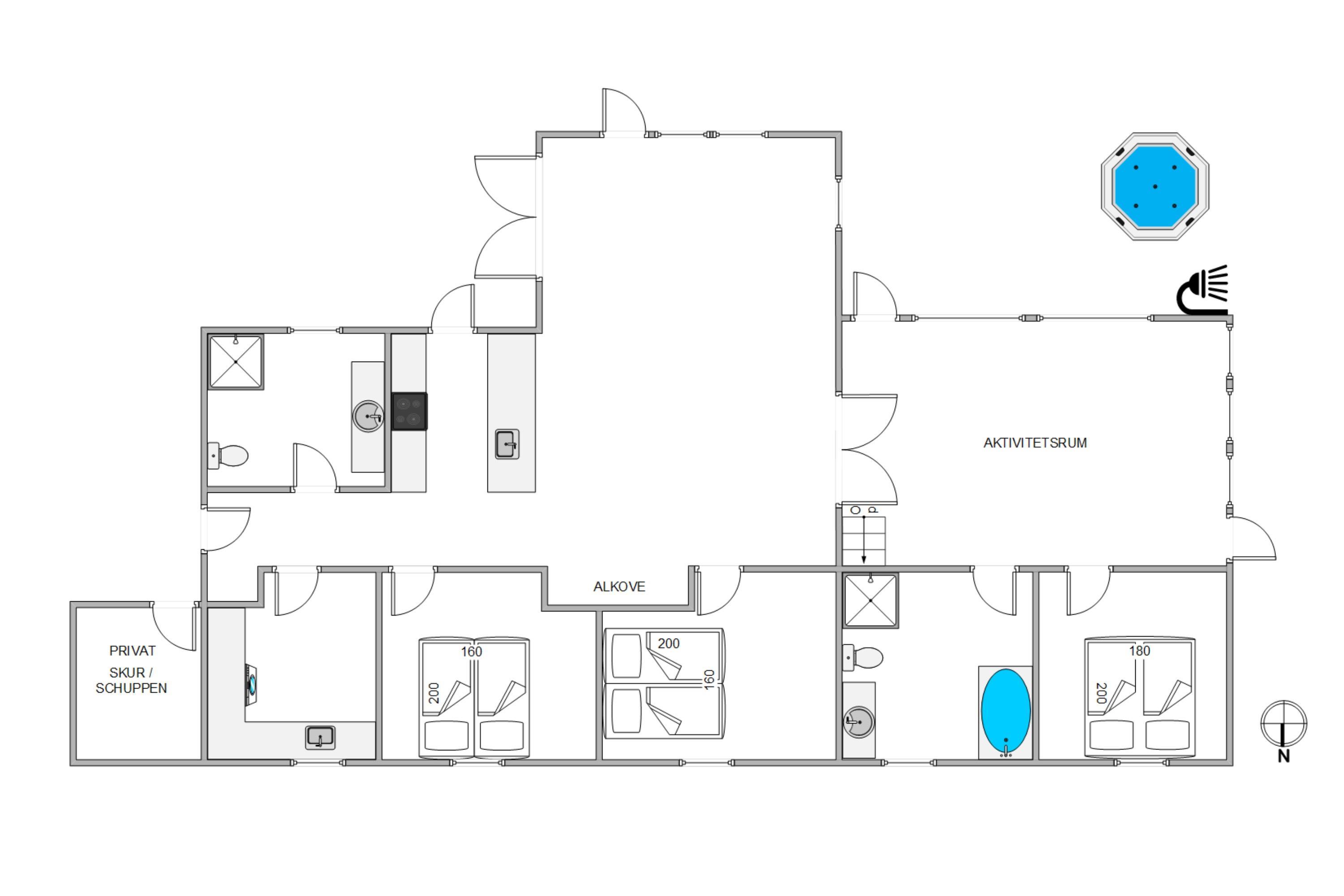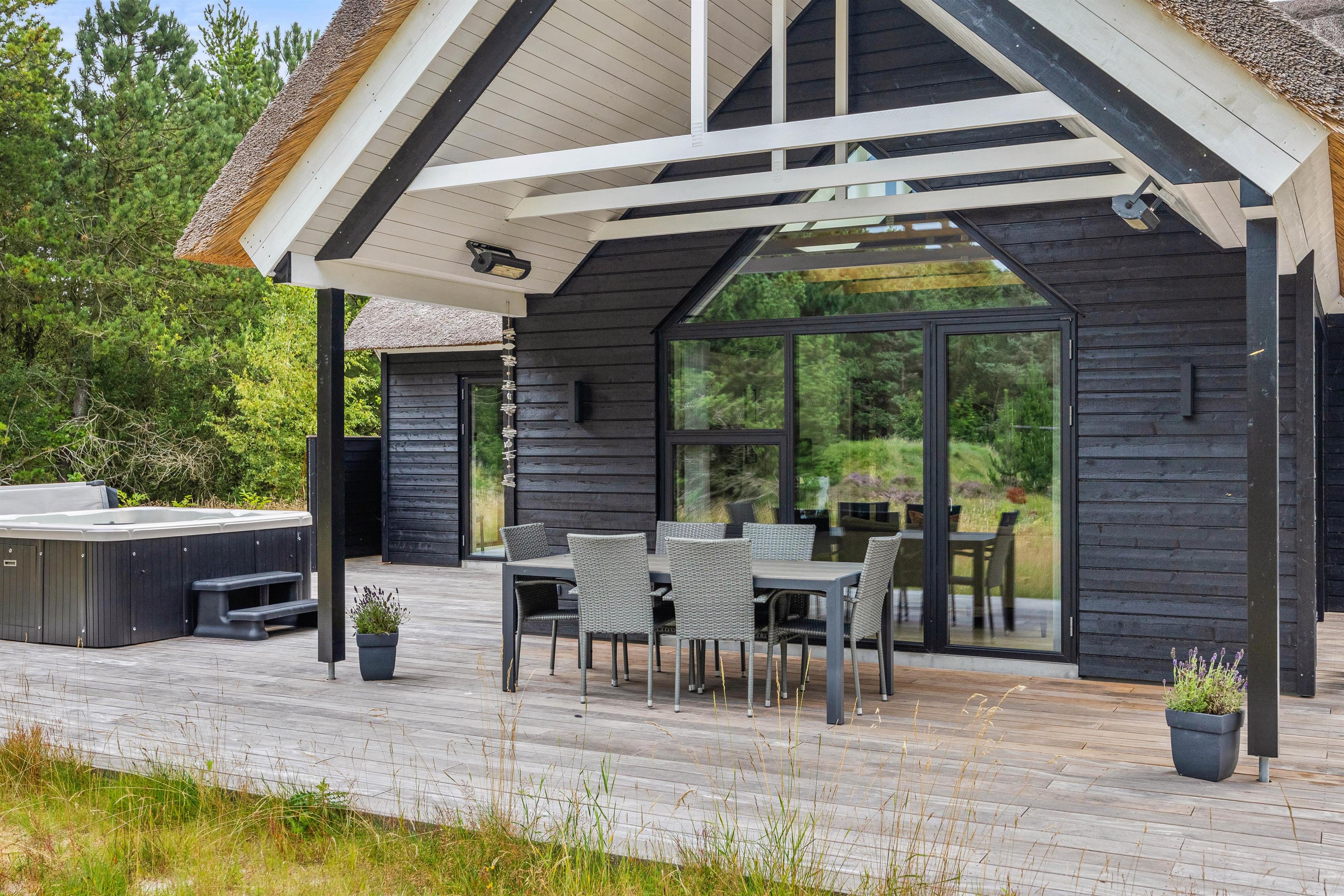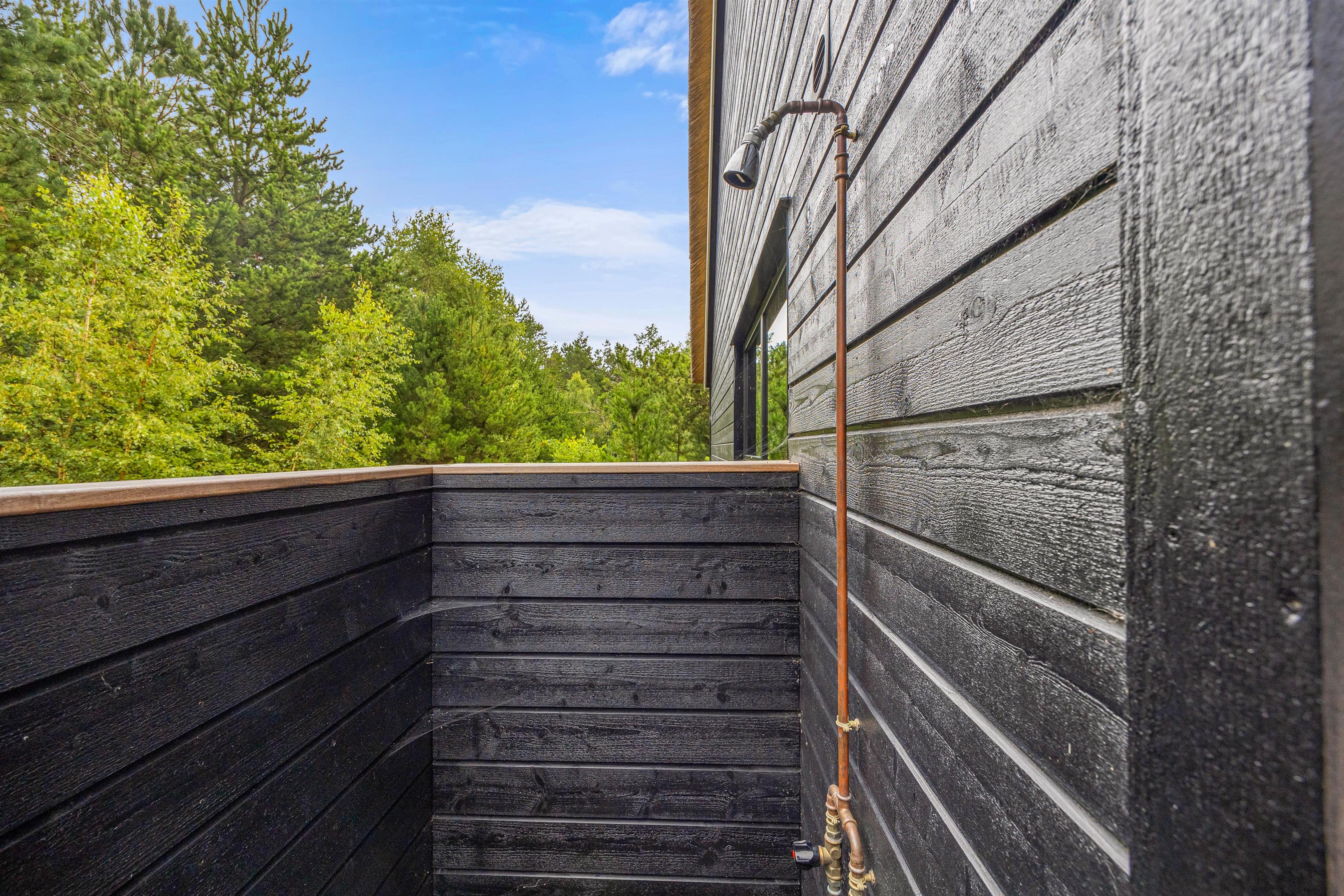 På terrassen kan I finde en fantastisk udespa med plads til 6 personer, hvor I kan slappe af i det varme vand under en funklende stjernehimmel, hvilket tilføjer en luksuriøs dimension til jeres ophold. Som en forfriskende start på jeres spaoplevelse er der også en praktisk udebruser til rådighed fra april til november. Dette giver jer mulighed for en kold afskylning, inden I træder ned i det varme vand, og fuldender den ultimative oplevelse af velvære.