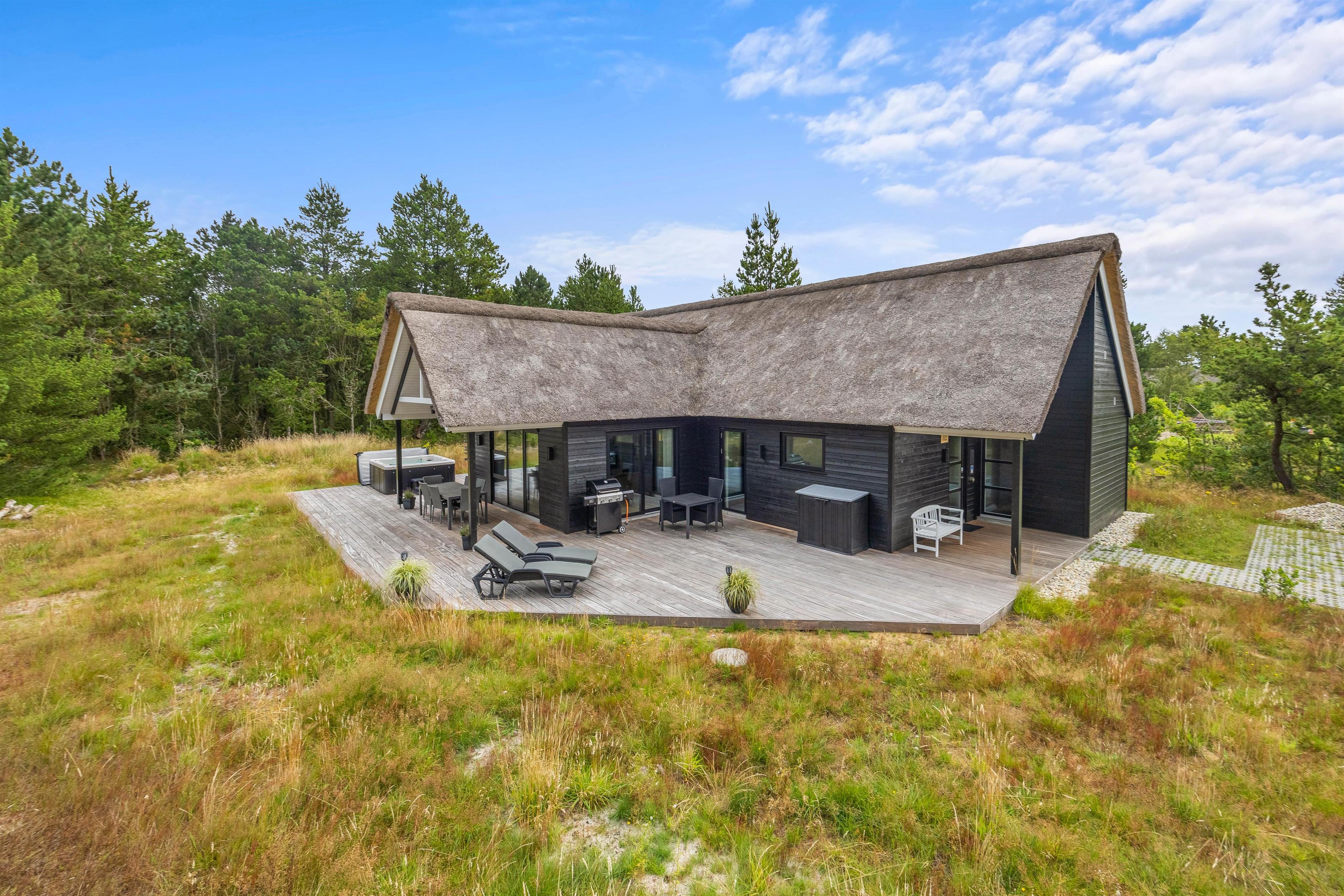På en rolig beliggenhed midt i Houstrups smukke sommerhusområde ligger dette luksushus på Jeppesvej 112. Sommerhuset, der blev bygget i 2022, har både et aktivitetsrum, udendørs spabad, udendørs bruser og en lademulighed til elbiler. Med et boligareal på i alt 135 m² er der masser af plads til en skøn ferie med op til 6 personer. Den fantastiske beliggenhed og de komfortable møbler taler for sig selv i dette feriehus, og beslutningen om at tilbringe jeres velfortjente feriedage her er ikke svær at træffe.