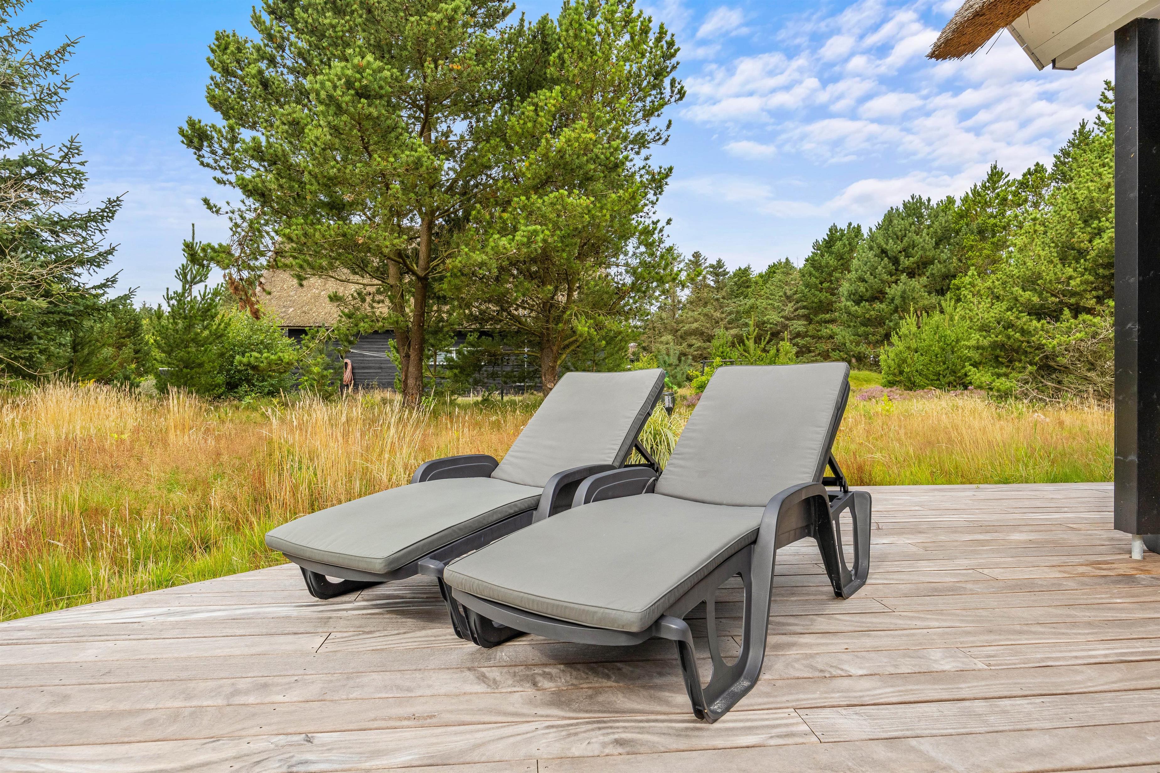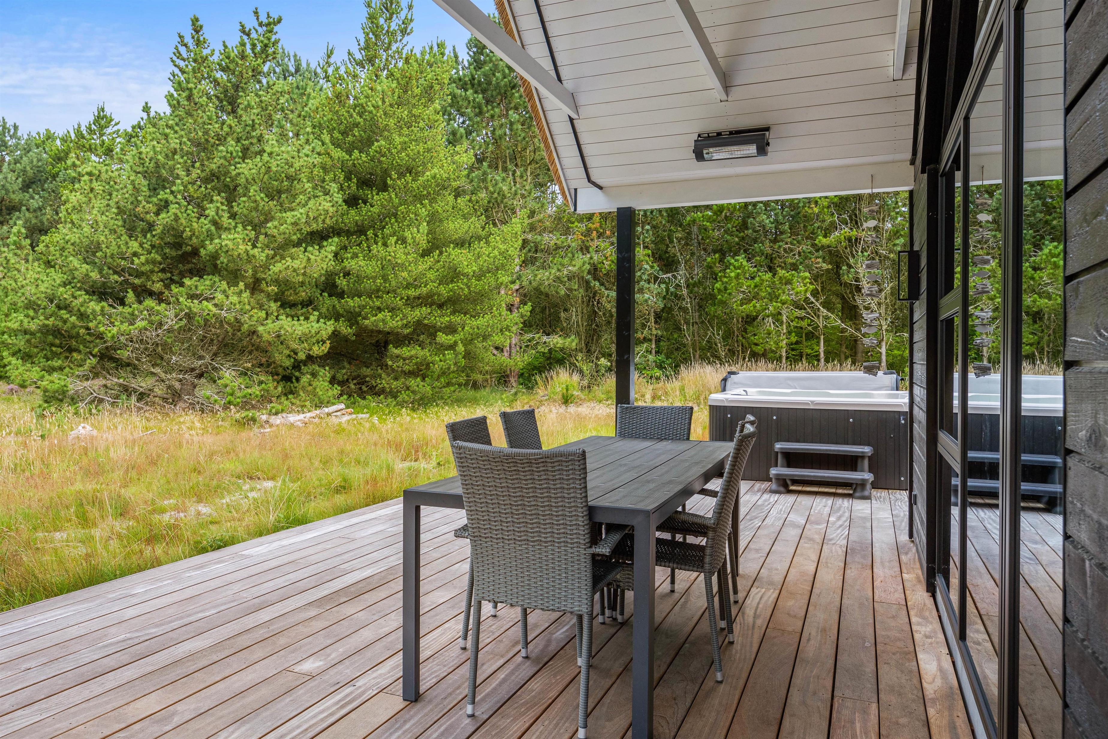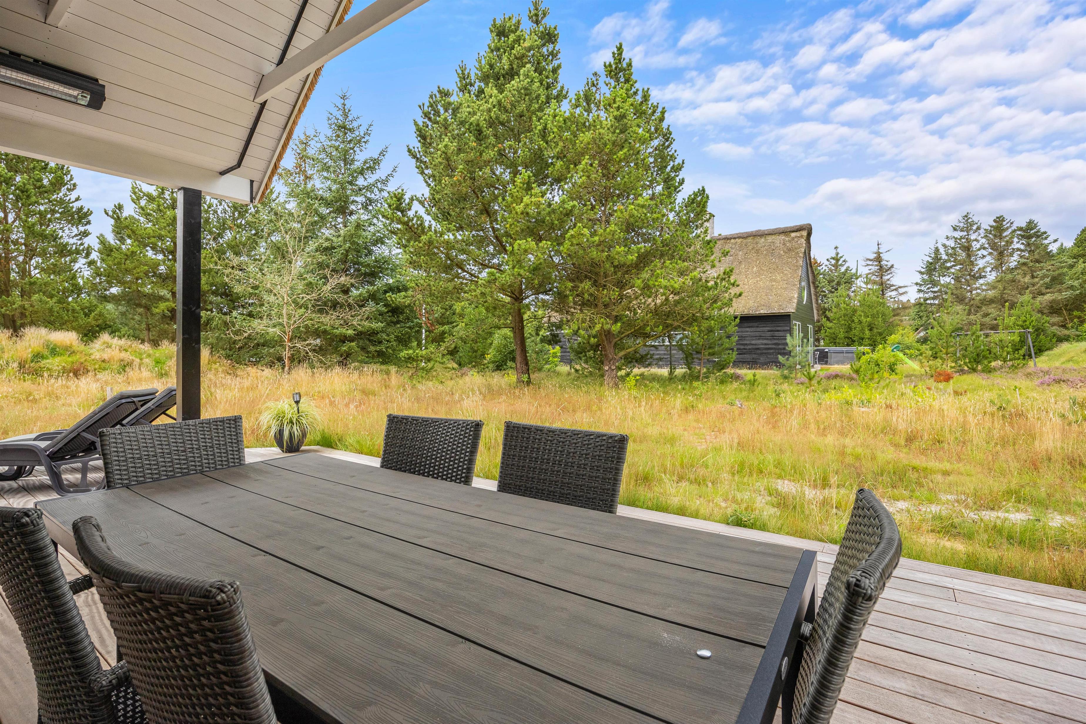 Der er flere direkte udgange fra sommerhuset til det skønne udeområde, hvilket gør det nemt at bringe indelivet udendørs. Her venter både overdækkede og åbne terrasser, som hver giver unikke muligheder for at nyde naturen. Uanset om det er til en afslappet brunch under morgensolen eller en hyggelig BBQ-aften, har de veludstyrede udeområder alt, hvad I behøver for den perfekte udendørsmiddag.