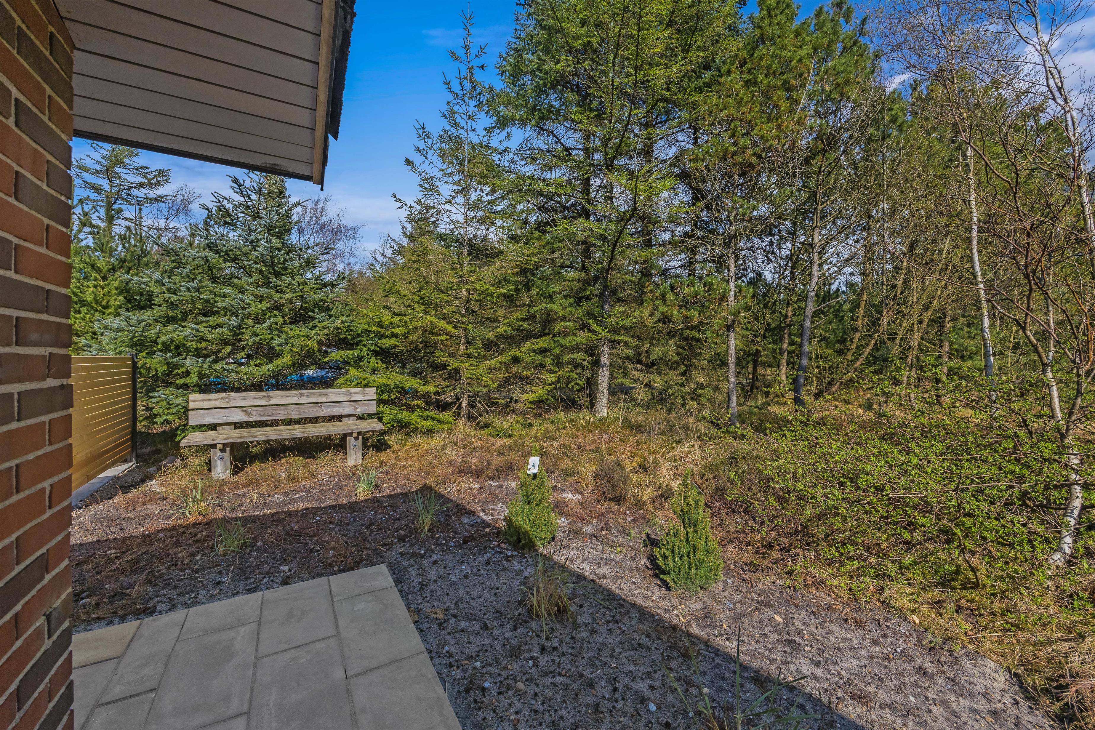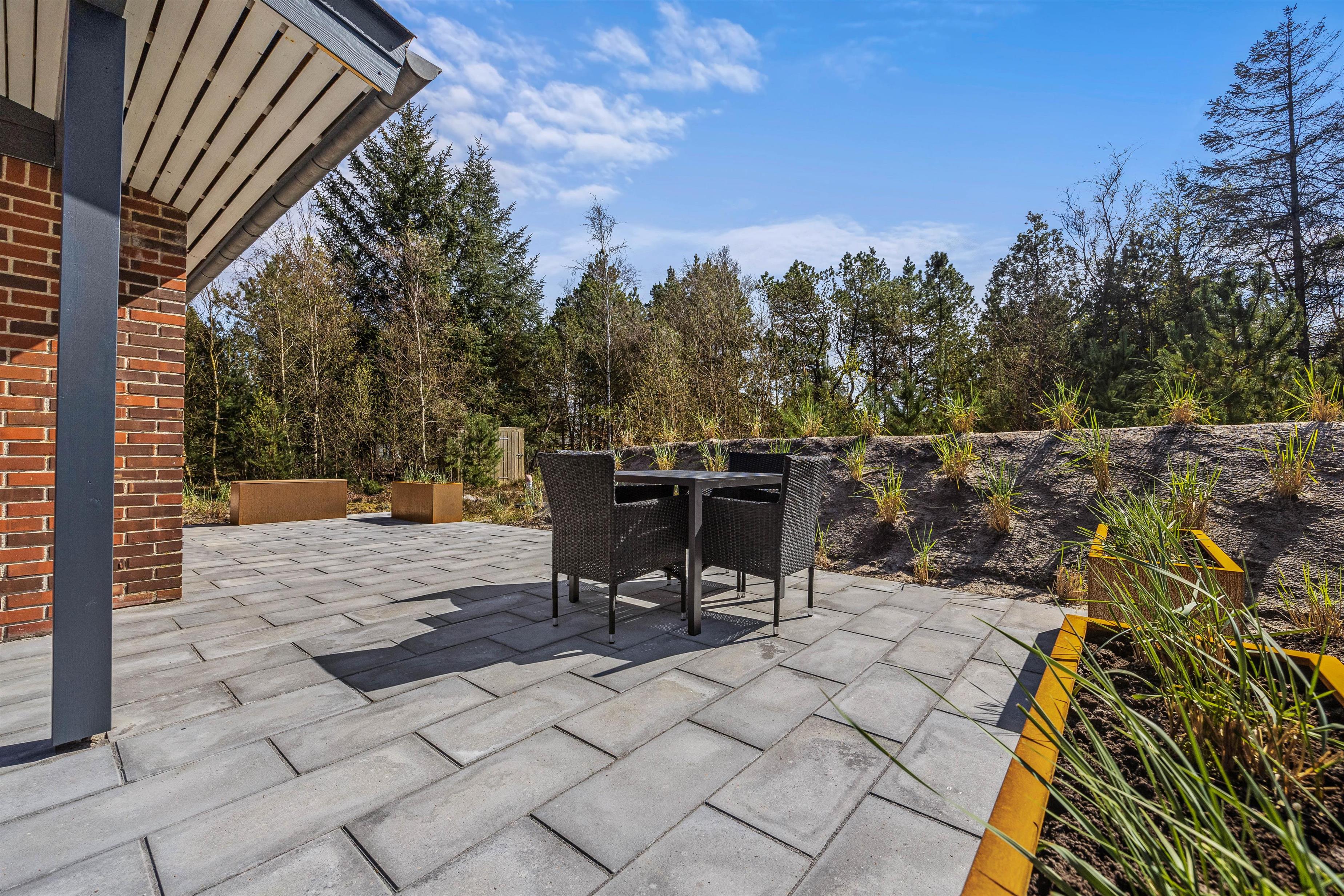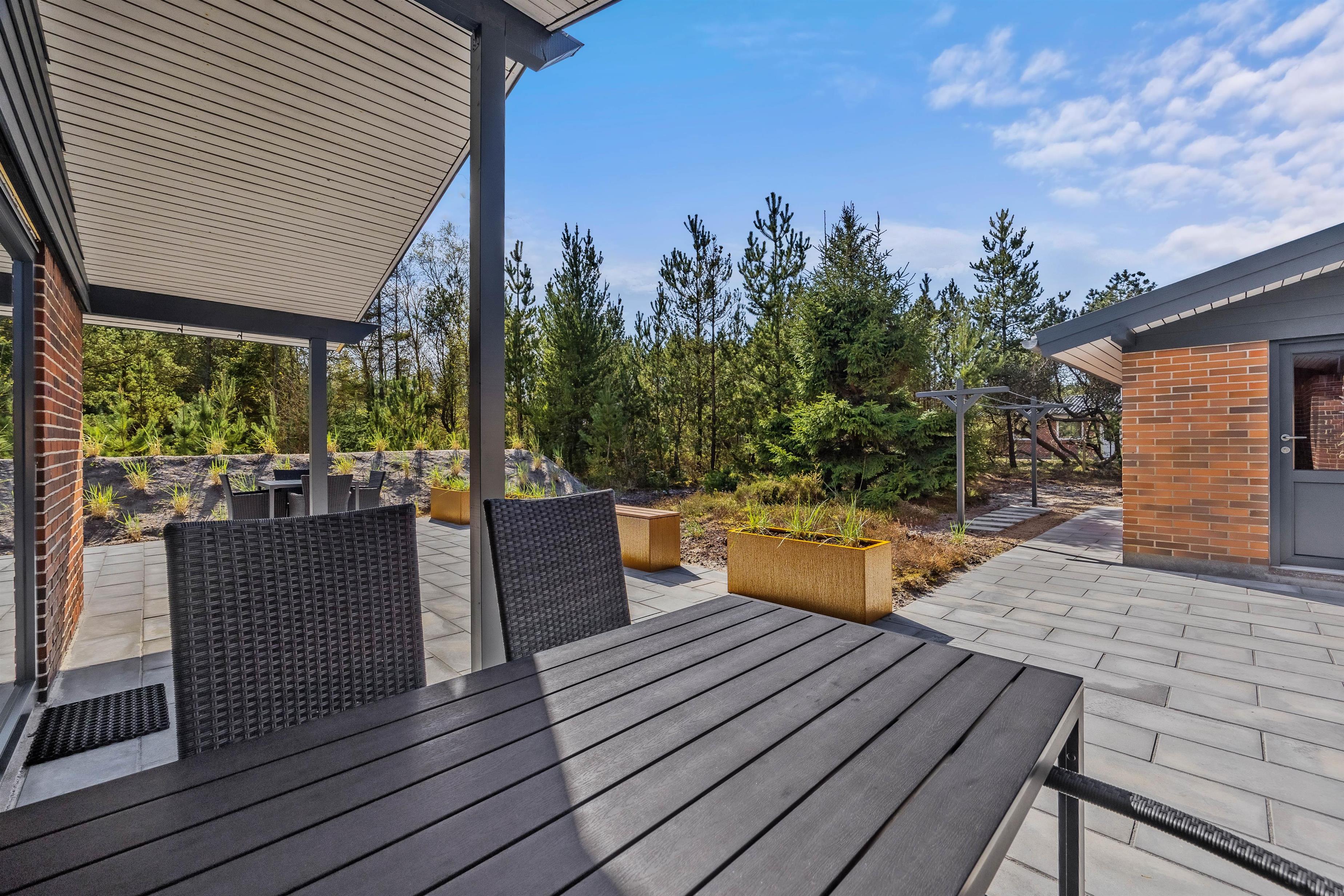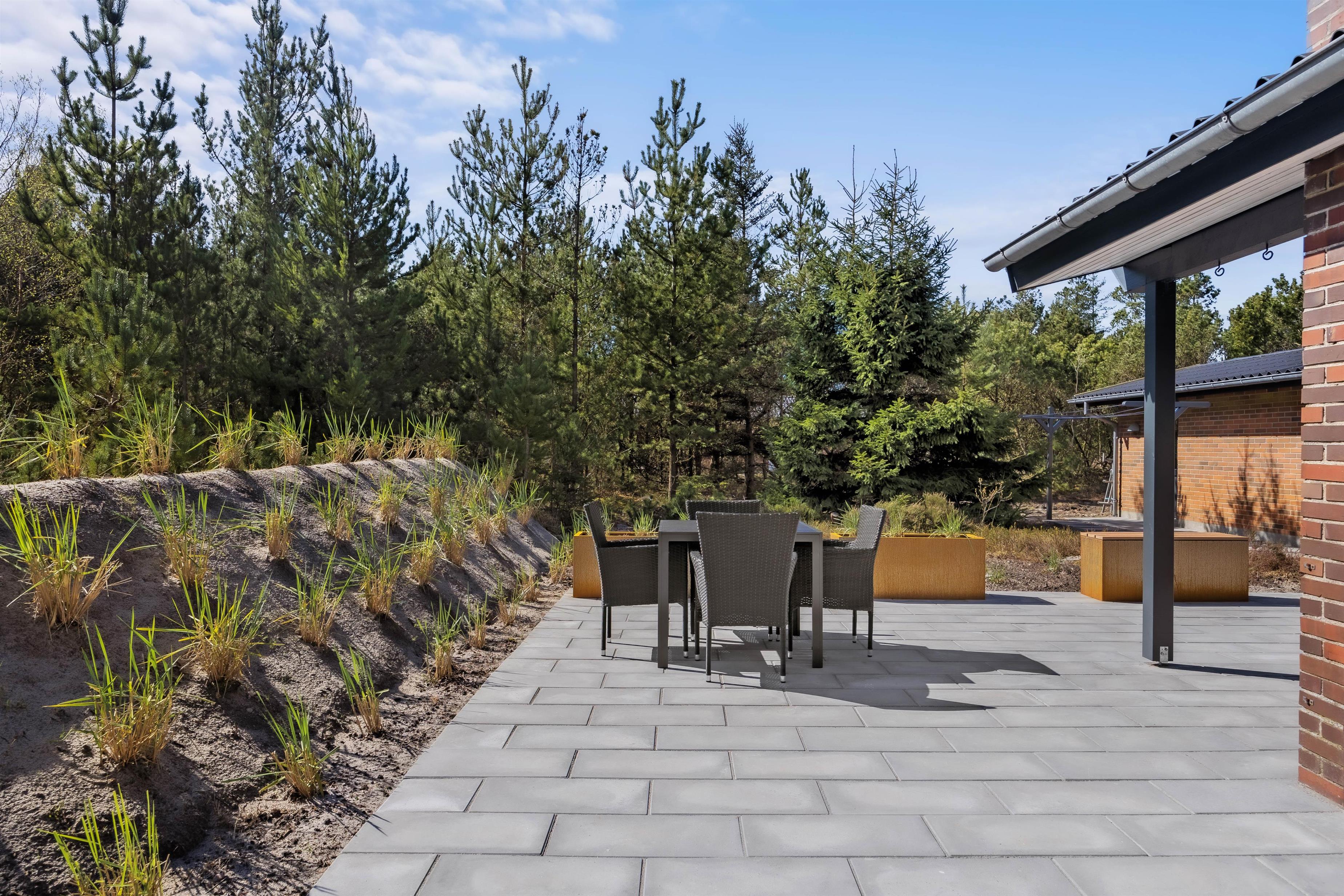 Den smukke og naturrige Blåbjerg Klitplantage ligger næsten helt op til huset, og selve terrassen er omgivet af nåletræer og buske. Her kan I altid finde læ og nyde en lækker morgenmad med friskbrygget kaffe, eller tænde op i grillen på de lune aftener. Der er rigeligt med havemøbler og liggestole, så I kan slappe af i solen, og den overdækkede del af terrassen sørger for, at I kan betragte de flotte omgivelser i al slags vejr.