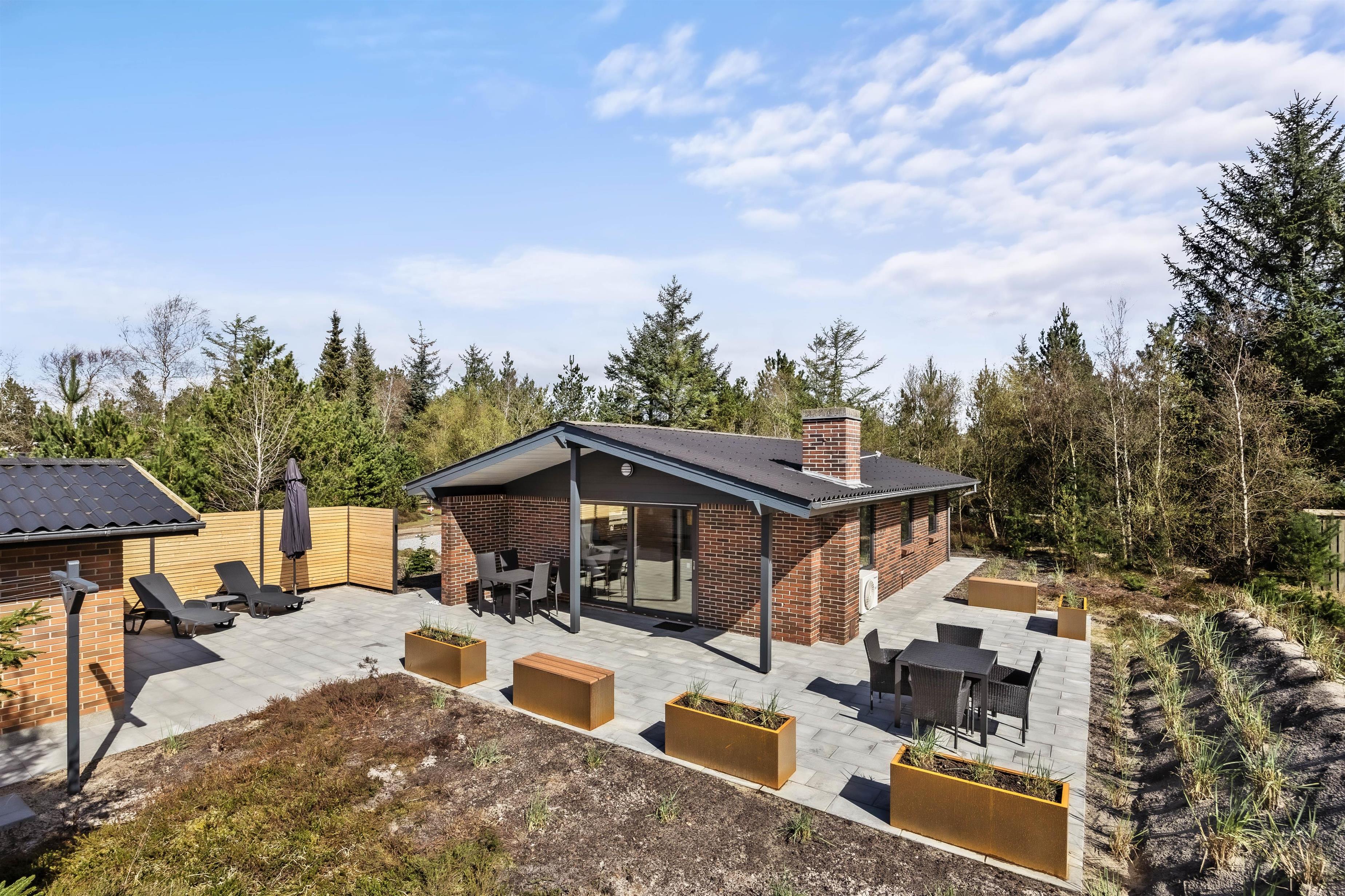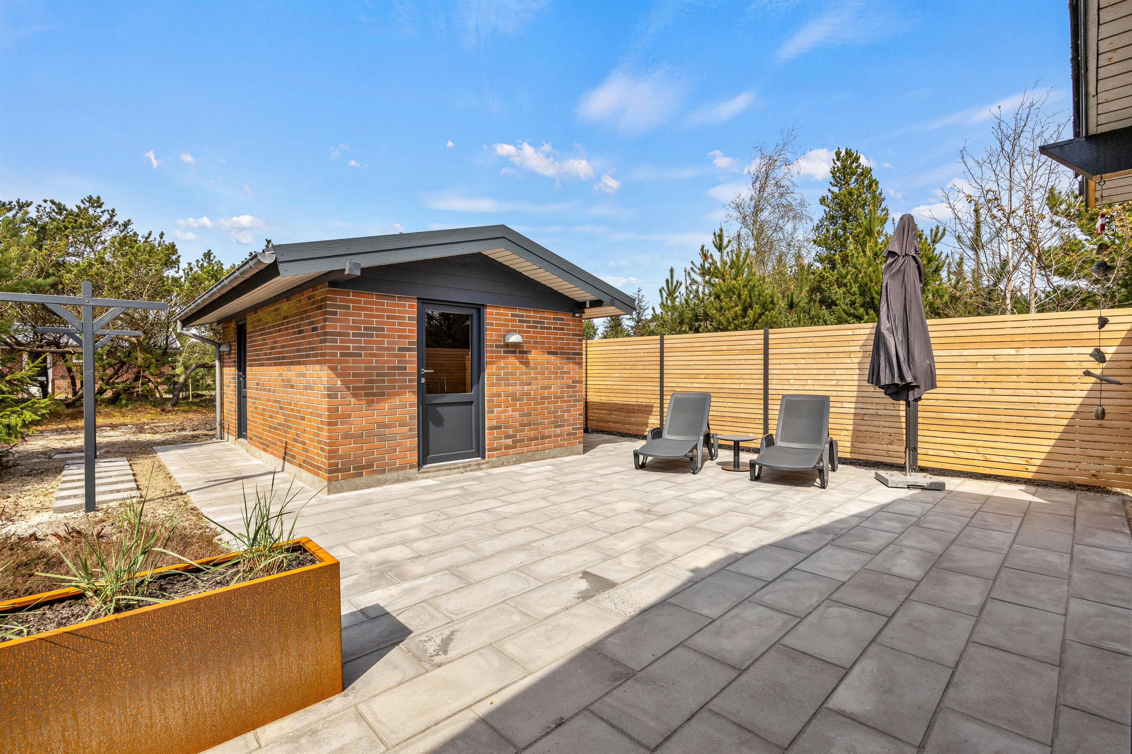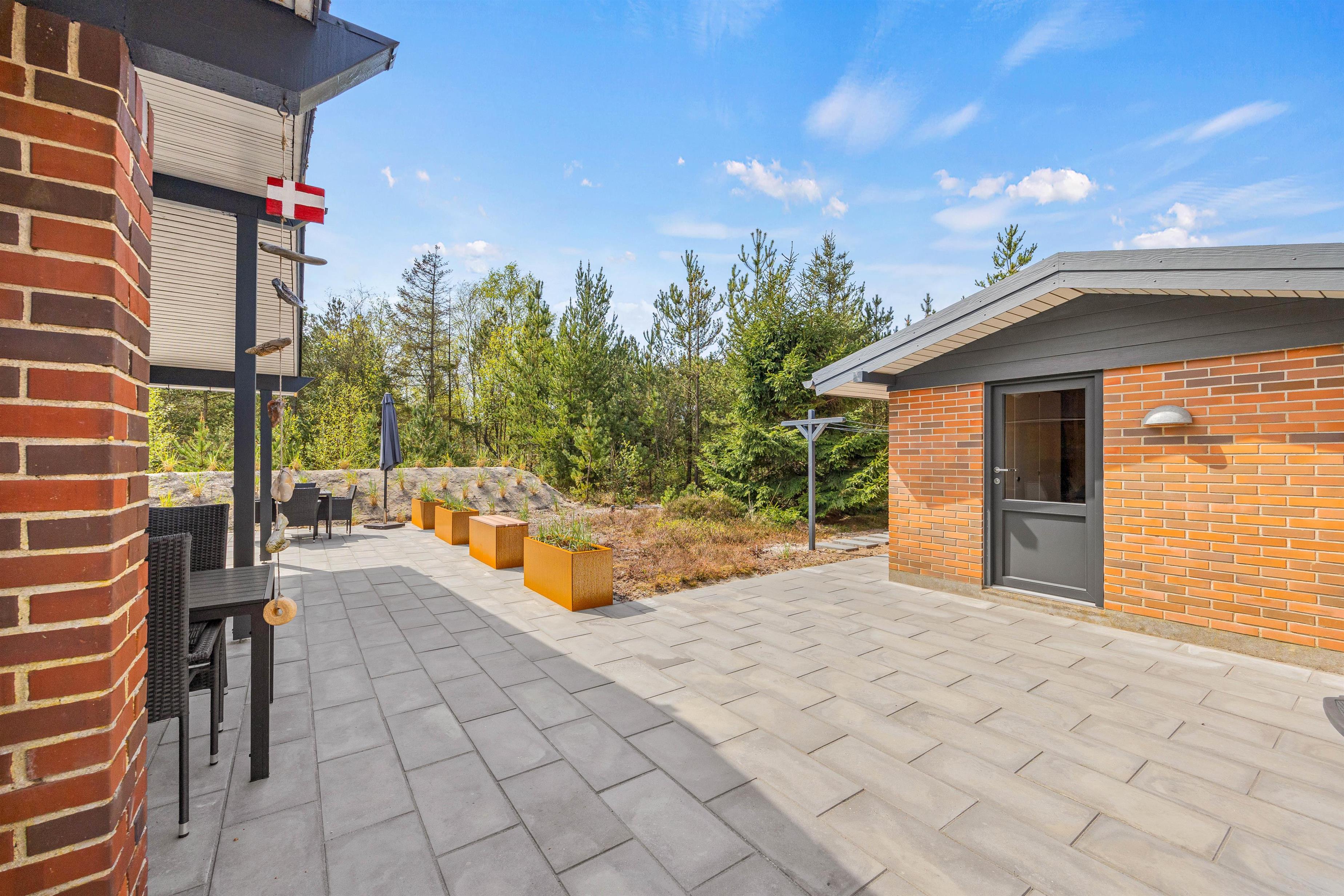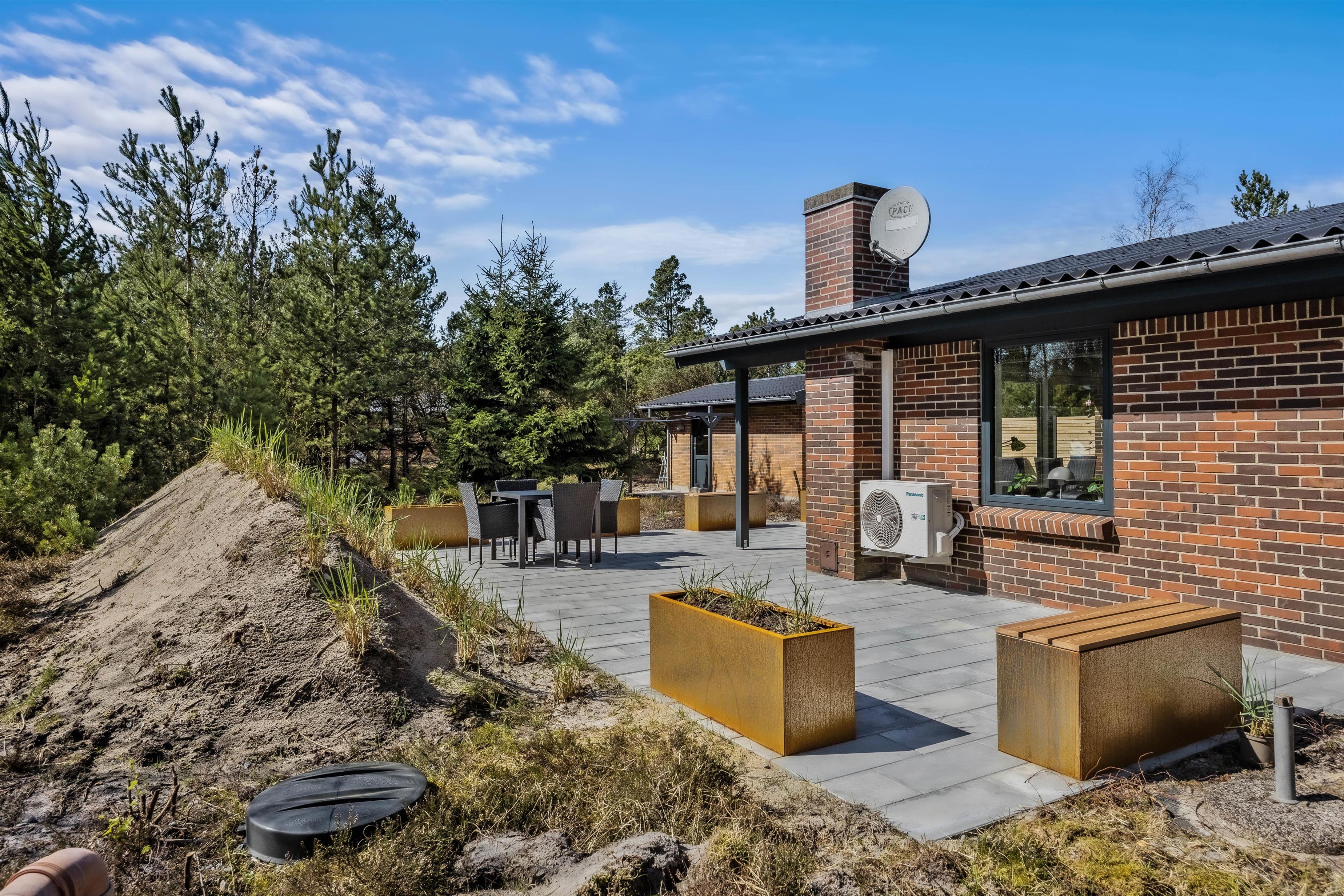 Den smukke og naturrige Blåbjerg Klitplantage ligger næsten helt op til huset, og selve terrassen er omgivet af nåletræer og buske. Her kan I altid finde læ og nyde en lækker morgenmad med friskbrygget kaffe, eller tænde op i grillen på de lune aftener. Der er rigeligt med havemøbler og liggestole, så I kan slappe af i solen, og den overdækkede del af terrassen sørger for, at I kan betragte de flotte omgivelser i al slags vejr.