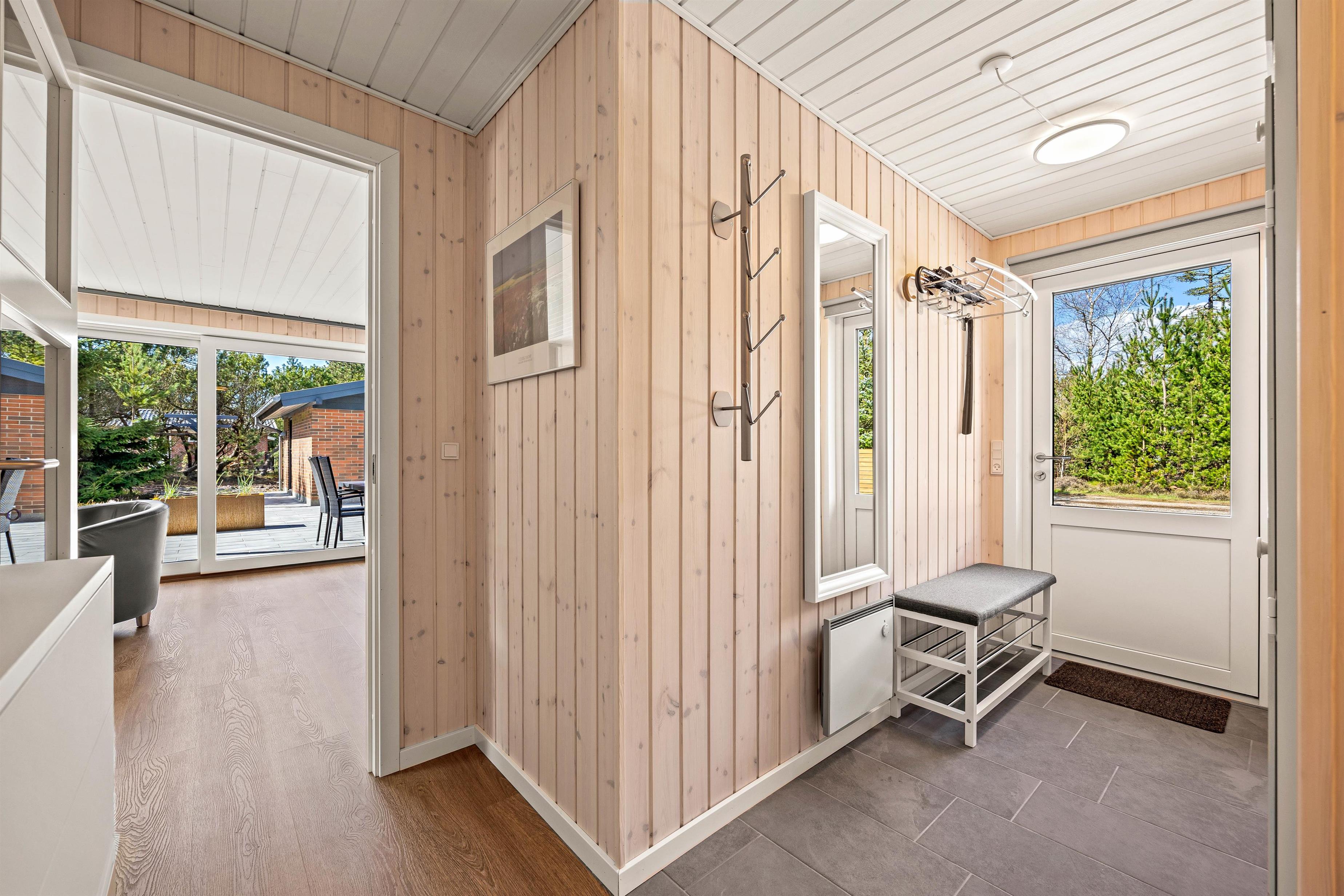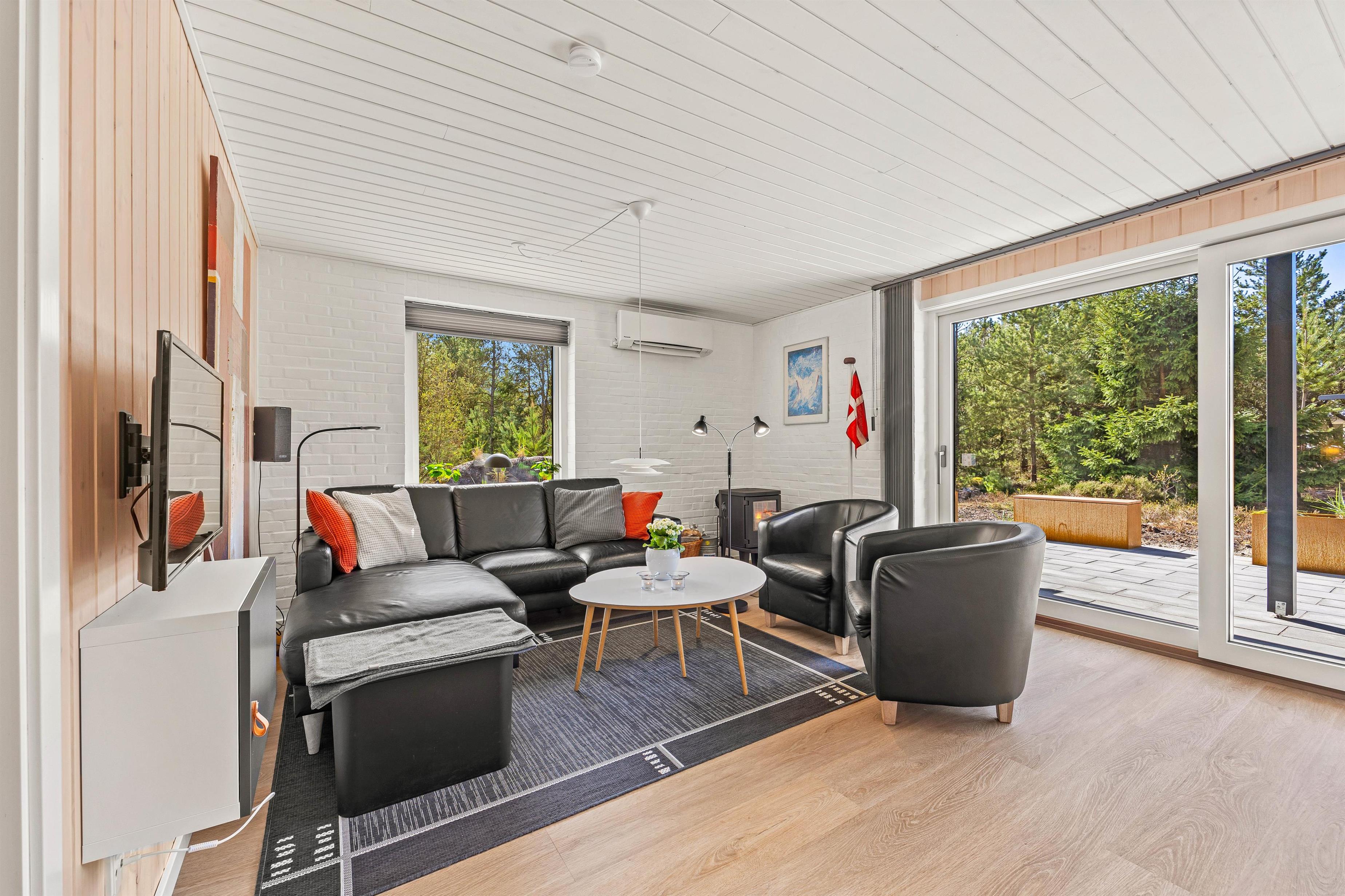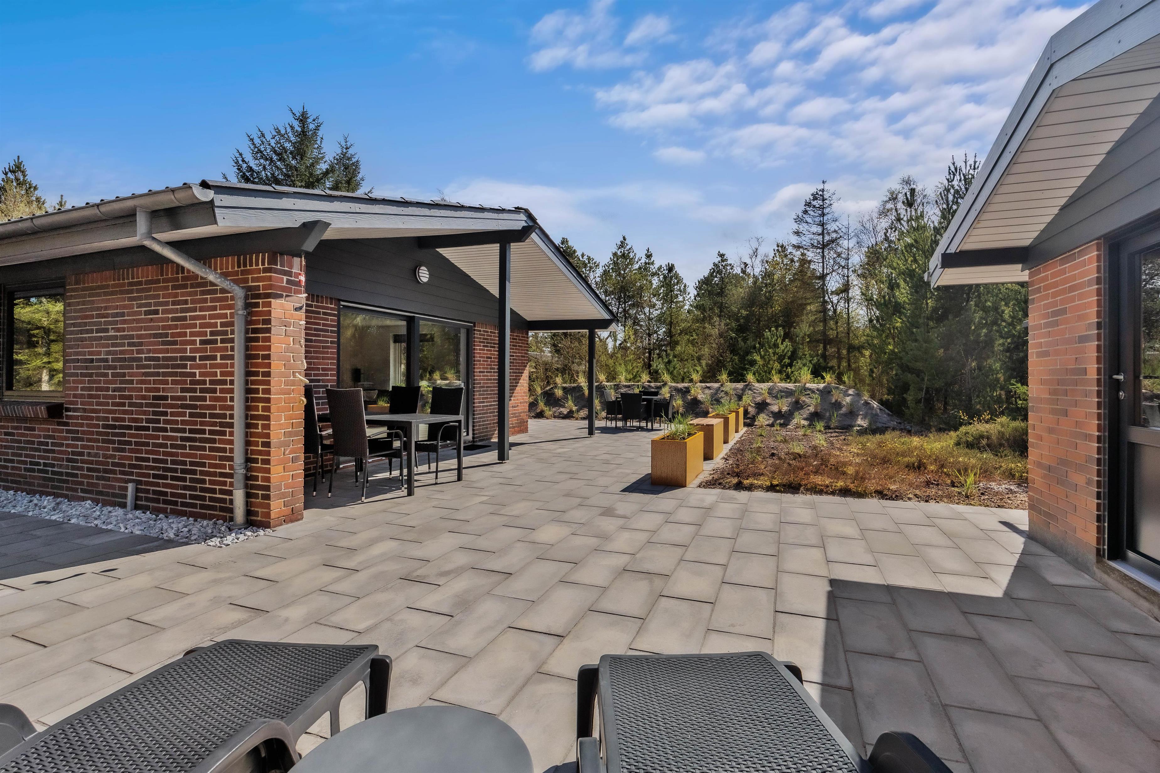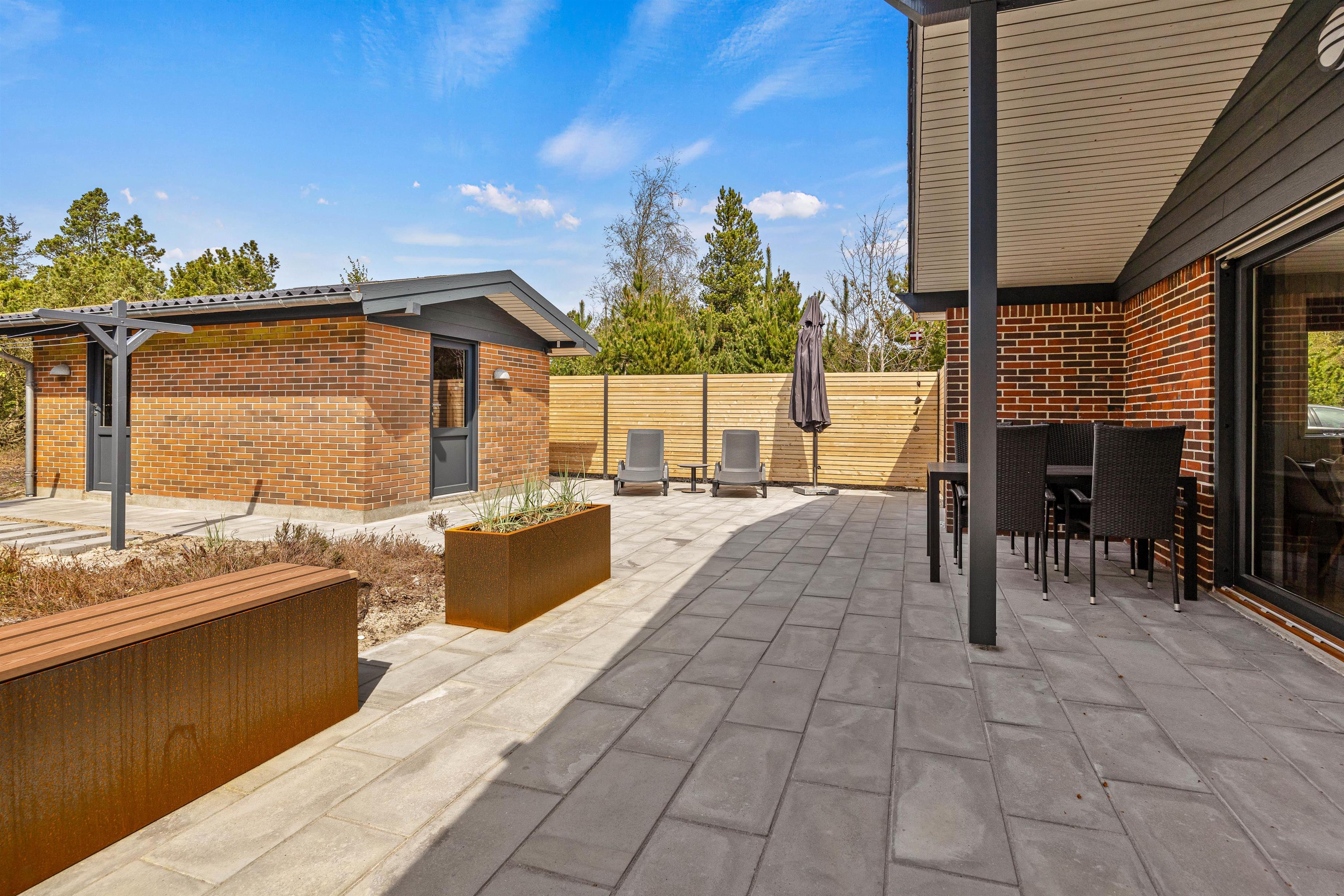 Den smukke og naturrige Blåbjerg Klitplantage ligger næsten helt op til huset, og selve terrassen er omgivet af nåletræer og buske. Her kan I altid finde læ og nyde en lækker morgenmad med friskbrygget kaffe, eller tænde op i grillen på de lune aftener. Der er rigeligt med havemøbler og liggestole, så I kan slappe af i solen, og den overdækkede del af terrassen sørger for, at I kan betragte de flotte omgivelser i al slags vejr.