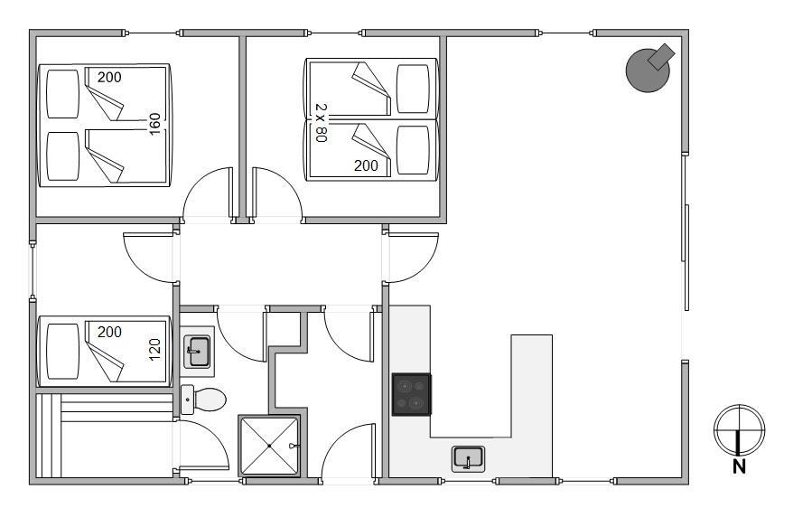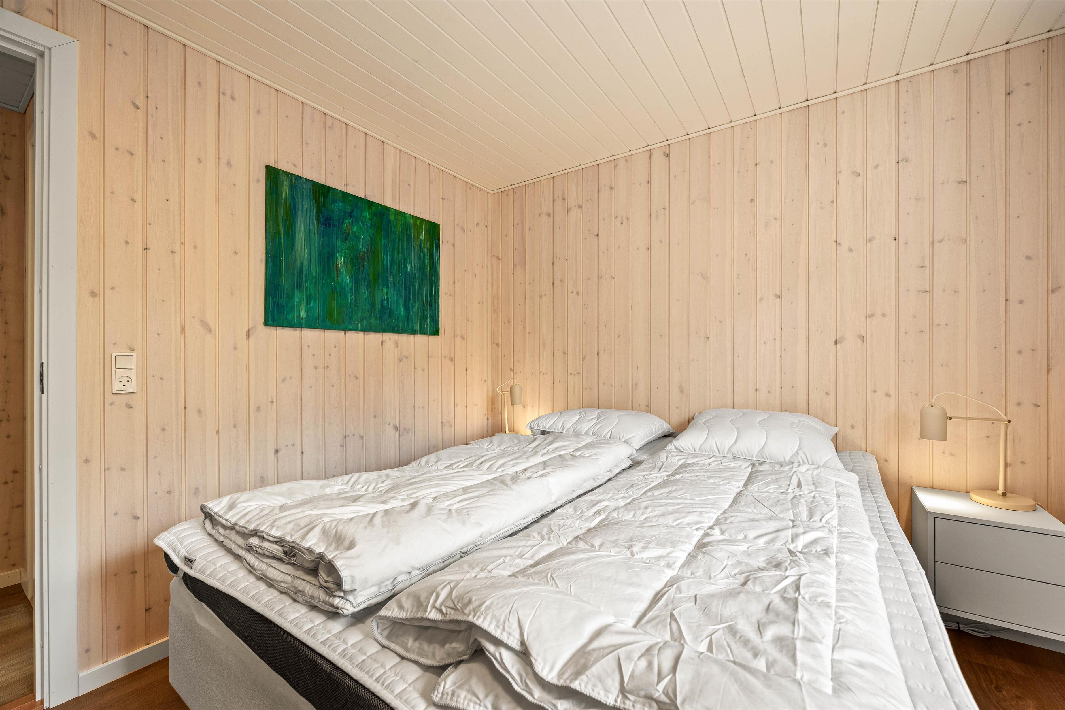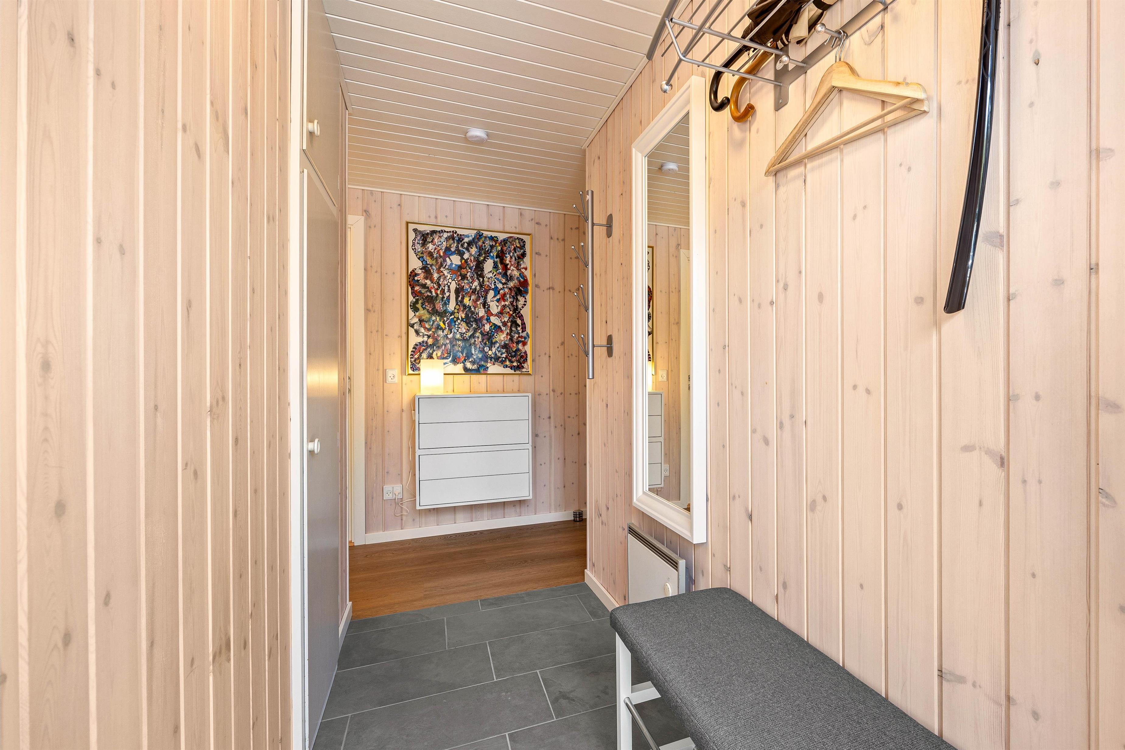 Husets rumopdeling er både praktisk og gennemtænkt. Fra indgangen kommer I til de tre soveværelser med 2 dobbeltsenge og 1enkeltseng. Her finder I også badeværelset, som både rummer bruser, toilet, vaskemaskine og ikke mindst gulvvarme. Gennem badeværelset kommer I også til husets sauna, hvor I rigtig kan slappe af og få varmen efter en lang dag i den flotte natur.