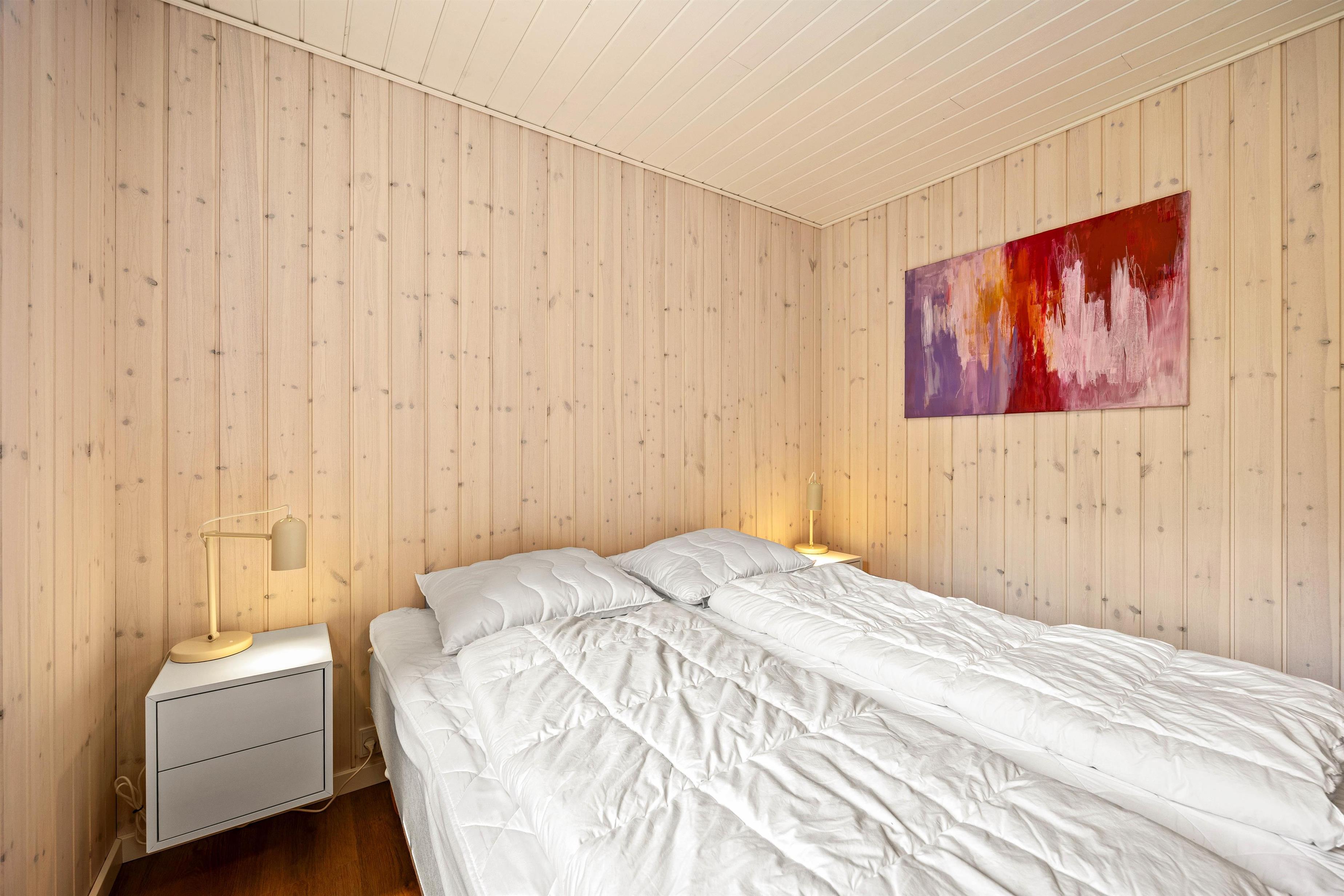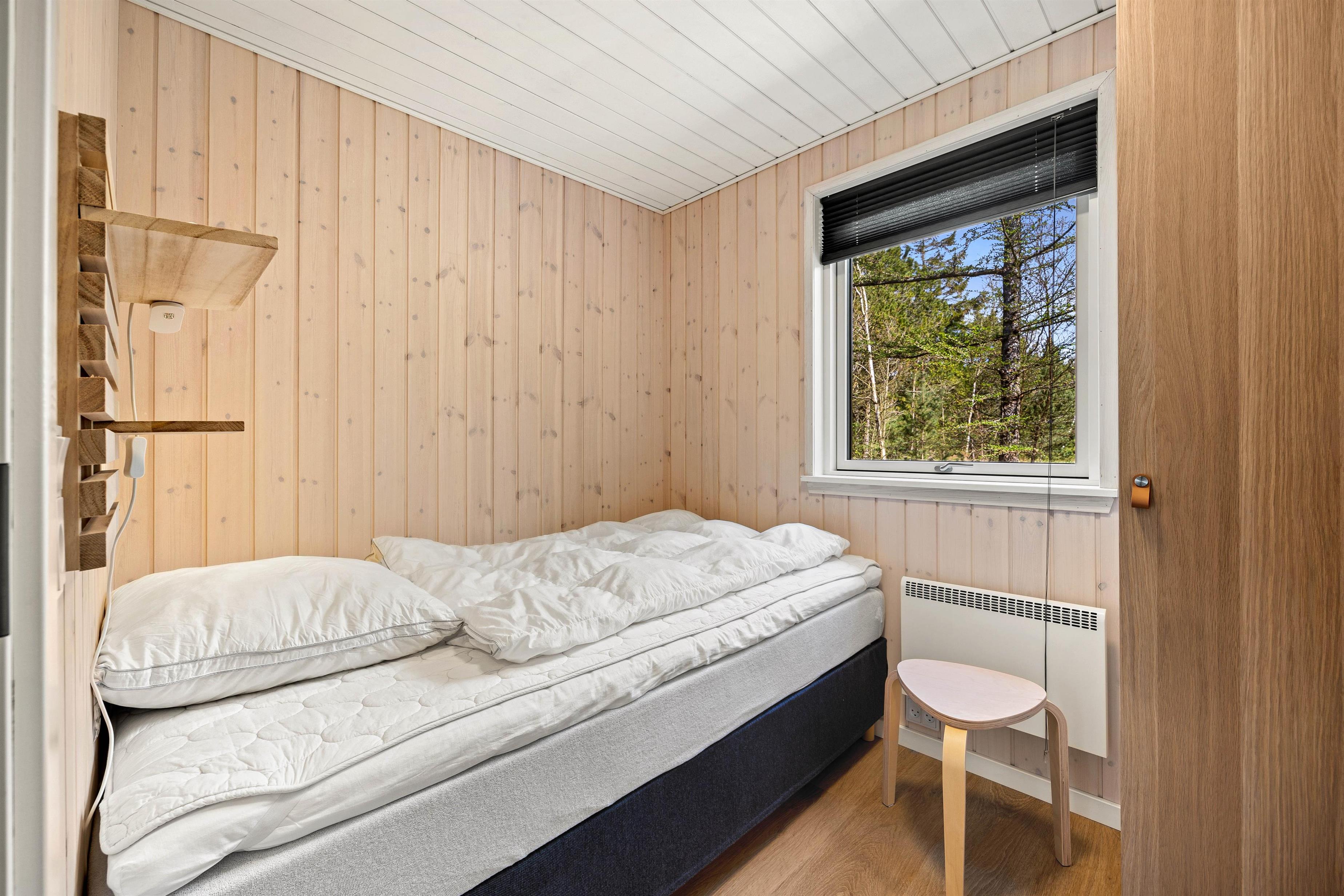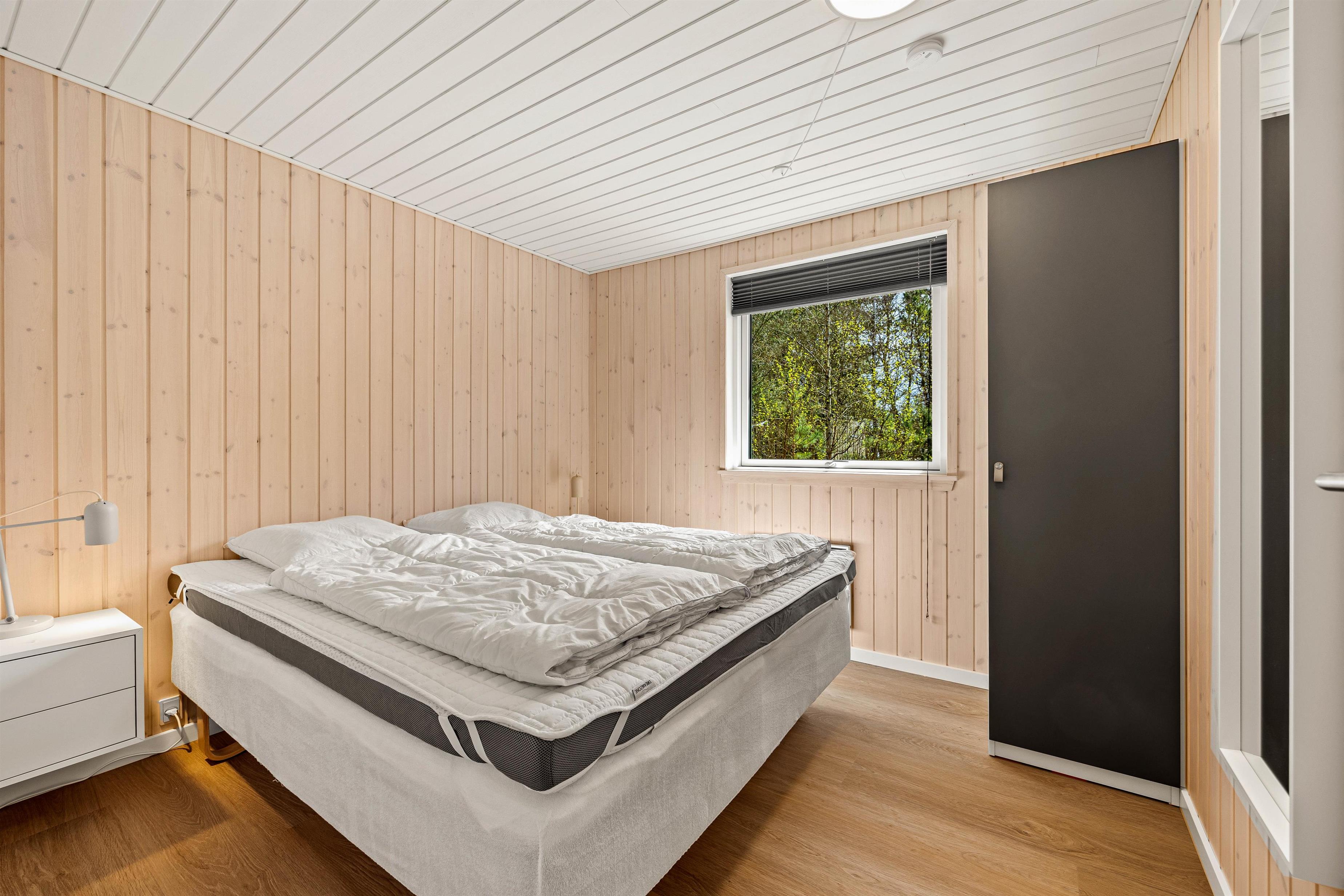 Husets rumopdeling er både praktisk og gennemtænkt. Fra indgangen kommer I til de tre soveværelser med 2 dobbeltsenge og 1enkeltseng. Her finder I også badeværelset, som både rummer bruser, toilet, vaskemaskine og ikke mindst gulvvarme. Gennem badeværelset kommer I også til husets sauna, hvor I rigtig kan slappe af og få varmen efter en lang dag i den flotte natur.
