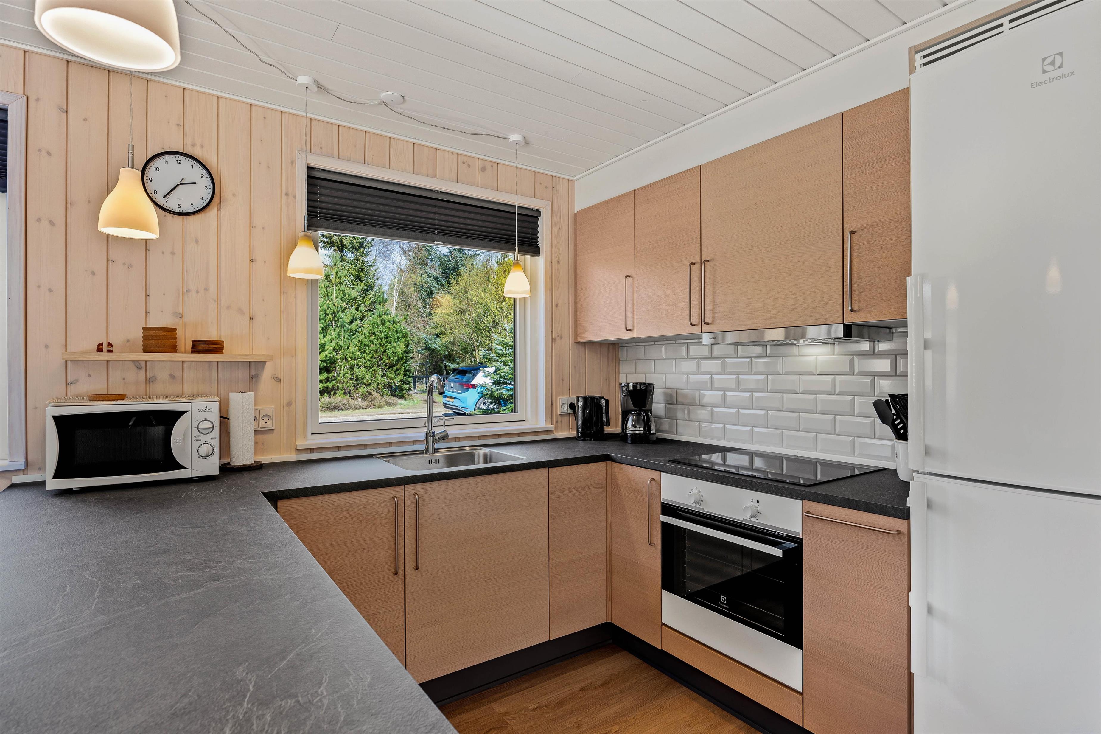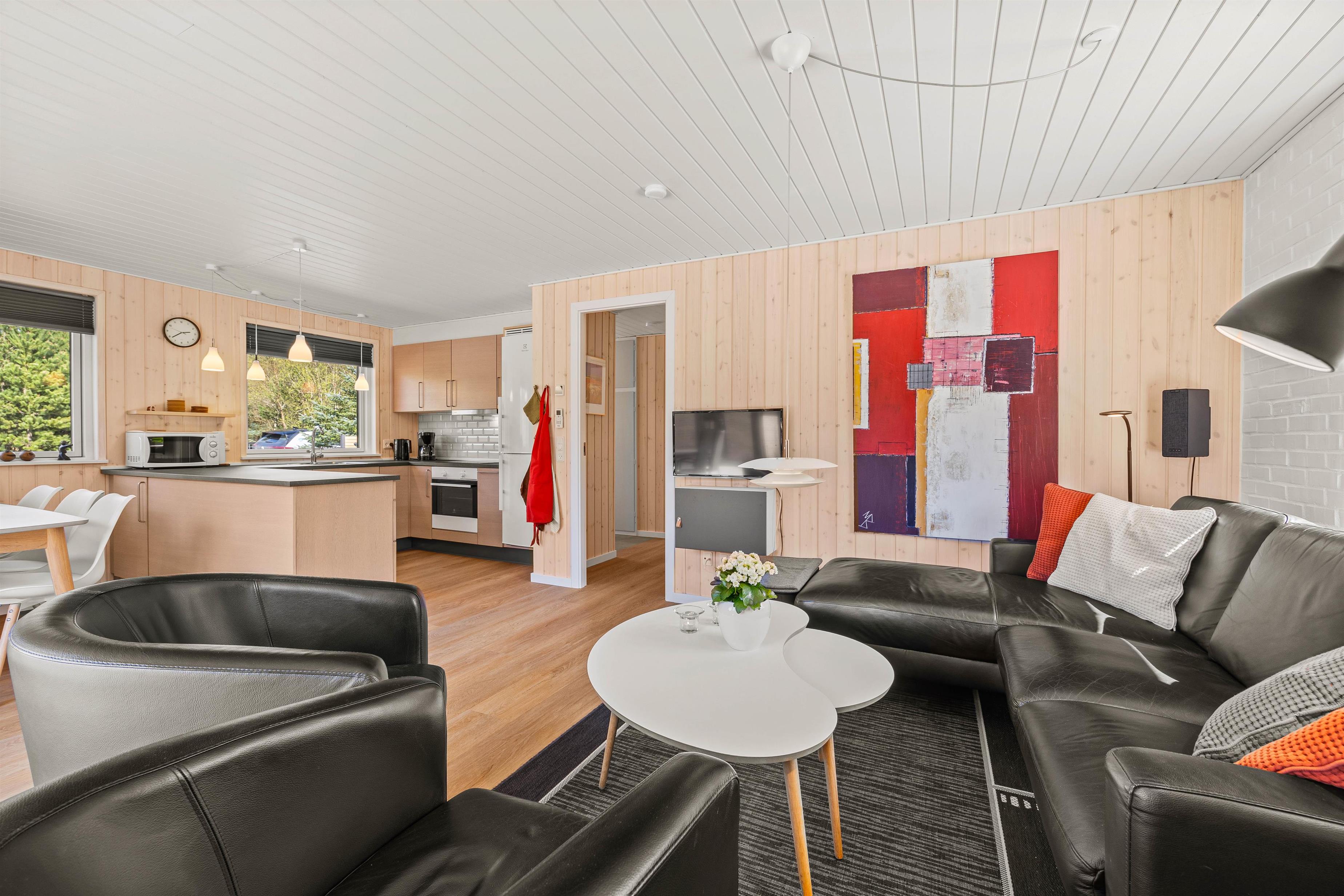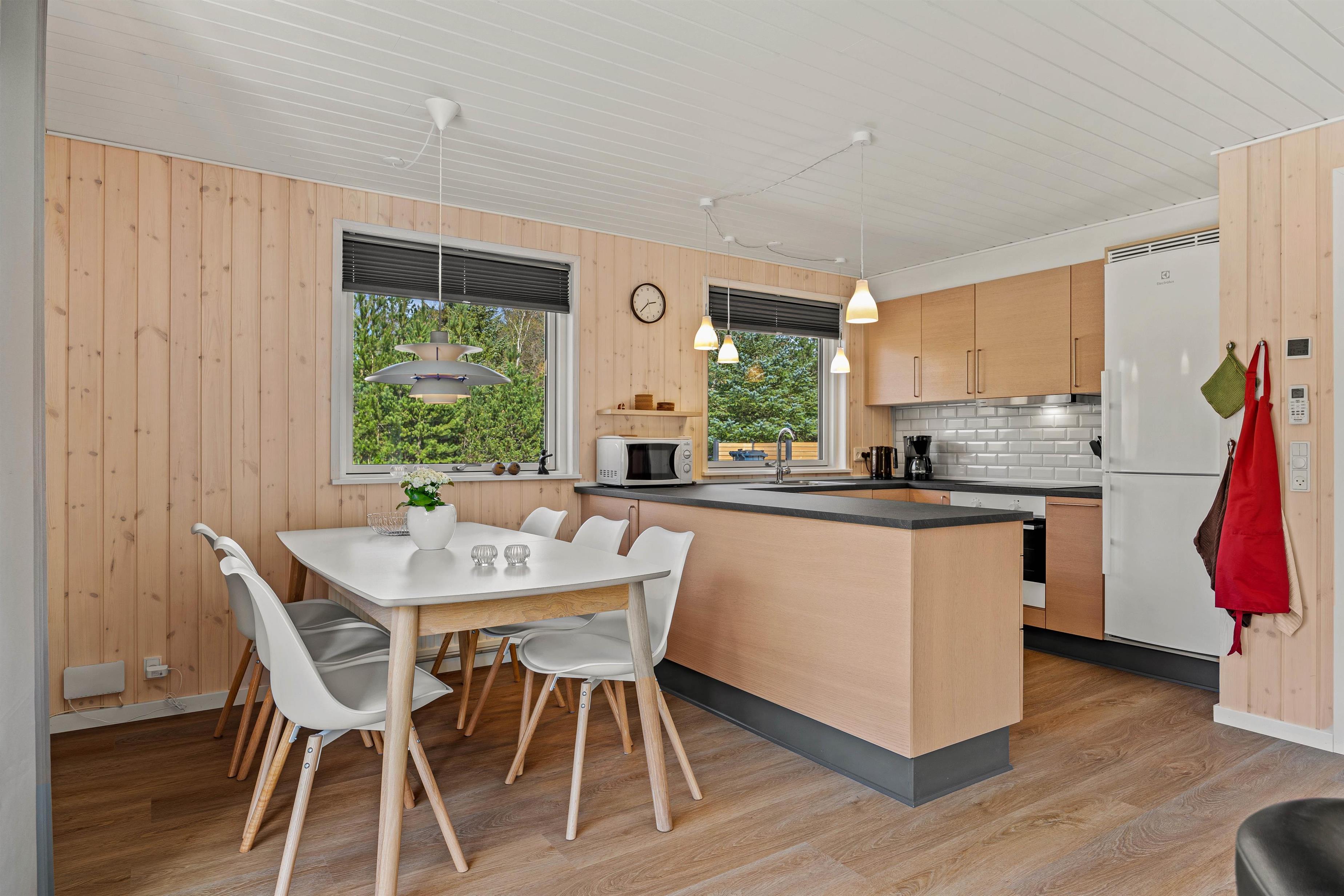 Stuen er fyldt med venlig atmosfære og er kombineret med et lille køkken og en spiseafdeling. Det rustikke køkken er udstyret med alt, hvad ferien behøver: et køleskab med separat fryser, komfur med ovn og emhætte, ligesom I også finder både en mikroovn, kaffemaskine og meget andet. I stuen kan I gøre dagen ekstra hyggelig foran den knitrende brændeovn og se en god film i fjernsynet. I får selvfølgelig også en gratis internetforbindelse, så I kan streame og dele feriebilleder med dem derhjemme.