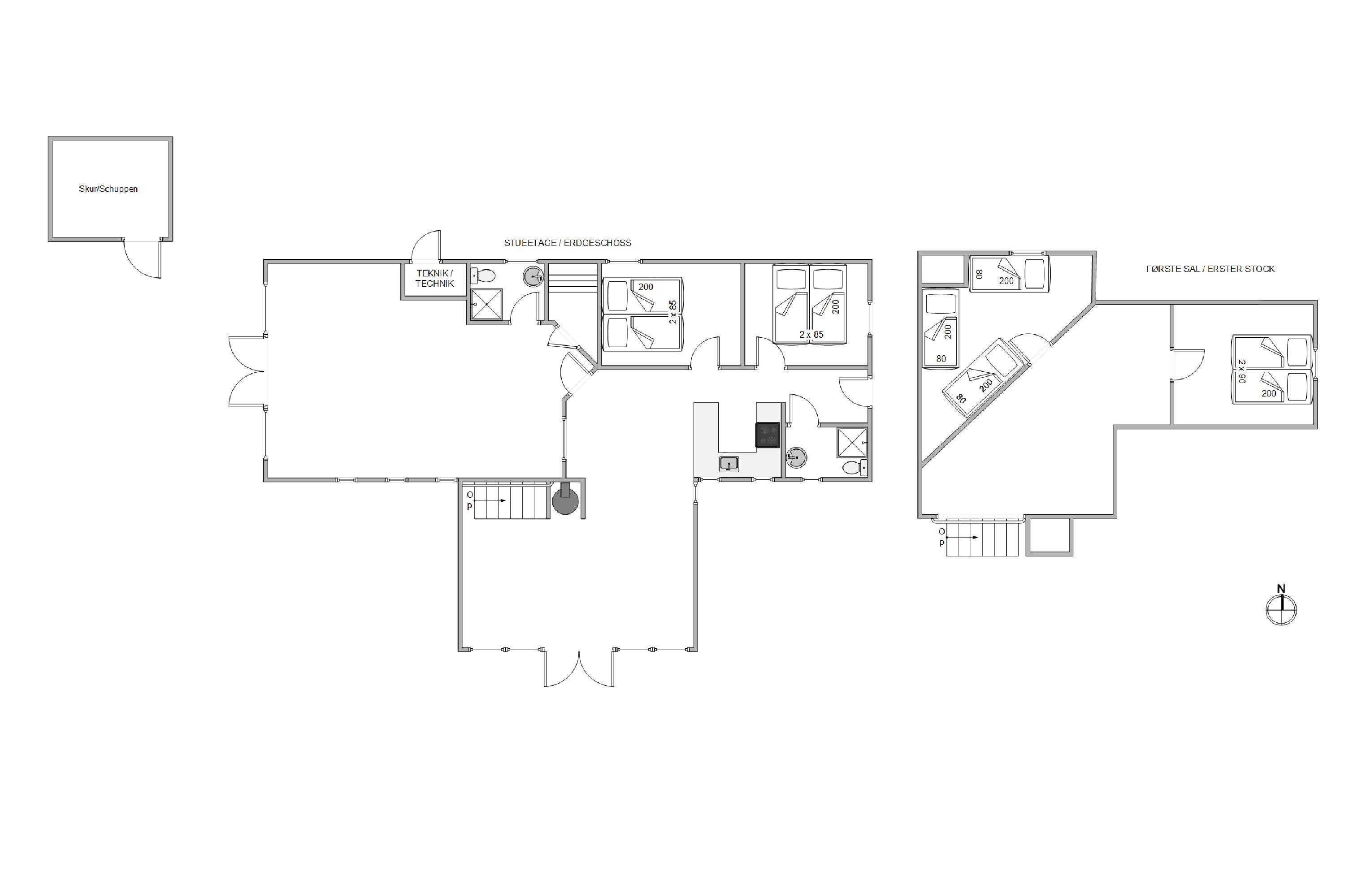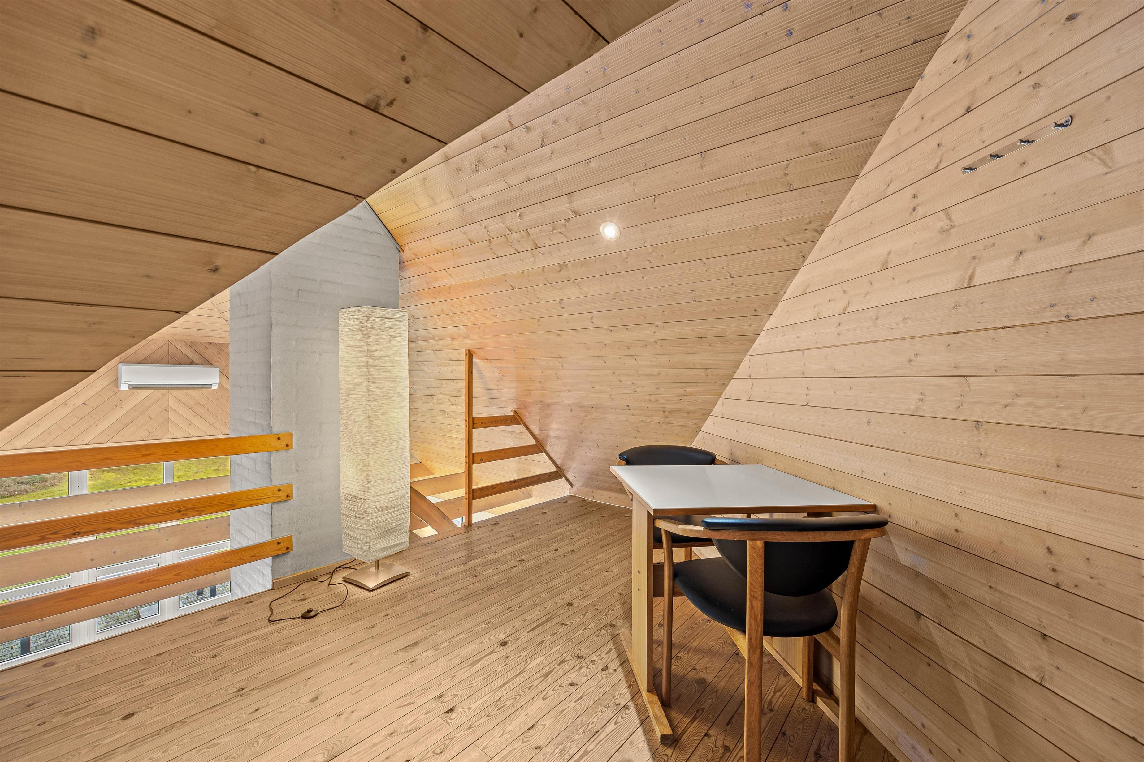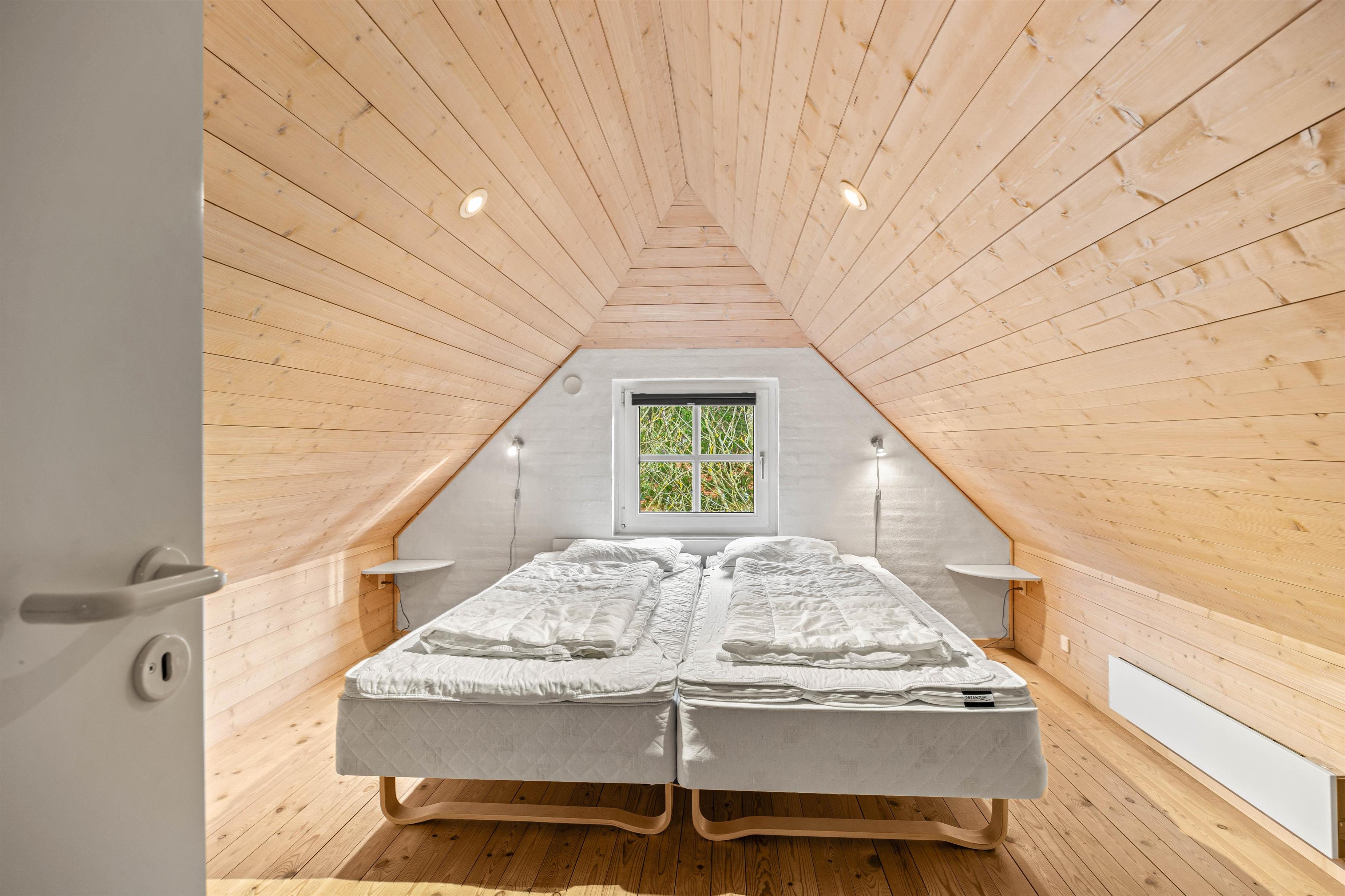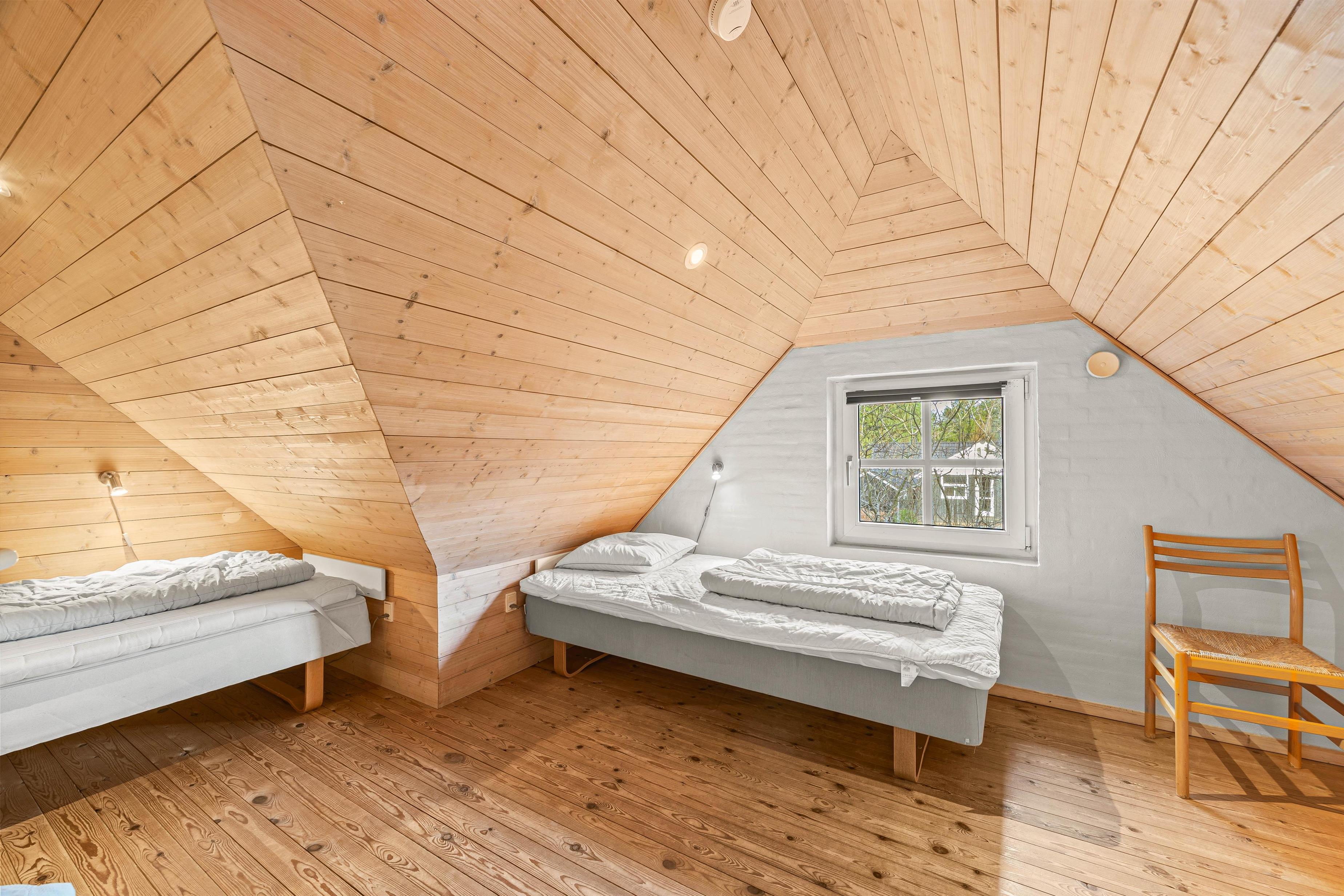 I stueetagen finder I de 2 badeværelser med gulvvarme samt 2 af soveværelserne med dobbeltsenge. Det tredje soveværelse med dobbeltseng og det hyggelige soveværelse med 3 enkeltsenge ligger på 1. sal. I feriehuset er der desuden både vaskemaskine og tørretumbler til rådighed.
