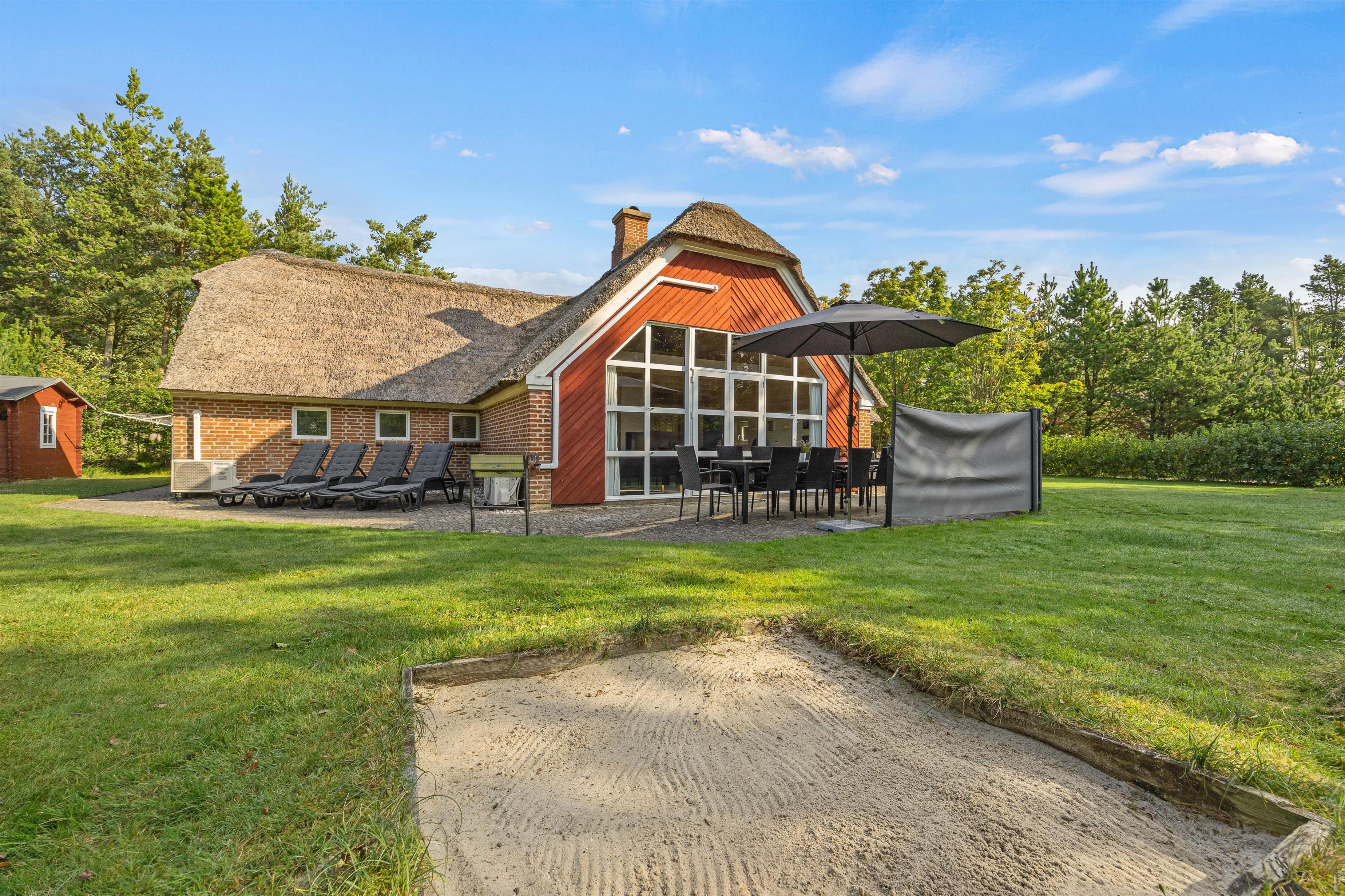 I haven finder I også et shelter, hvor I kan overnatte i det fri og få en autentisk naturoplevelse. I har jeres egen beachvolleybane ved dette sommerhus, så her kan I virkelig give den gas. Efter en masse leg og aktivitet bliver I uden tvivl sultne, og her er et lækkert måltid lavet på grillen helt ideel. Der findes ingen bedre måde at afslutte feriedagen på end med en hyggelig grillaften i godt selskab.