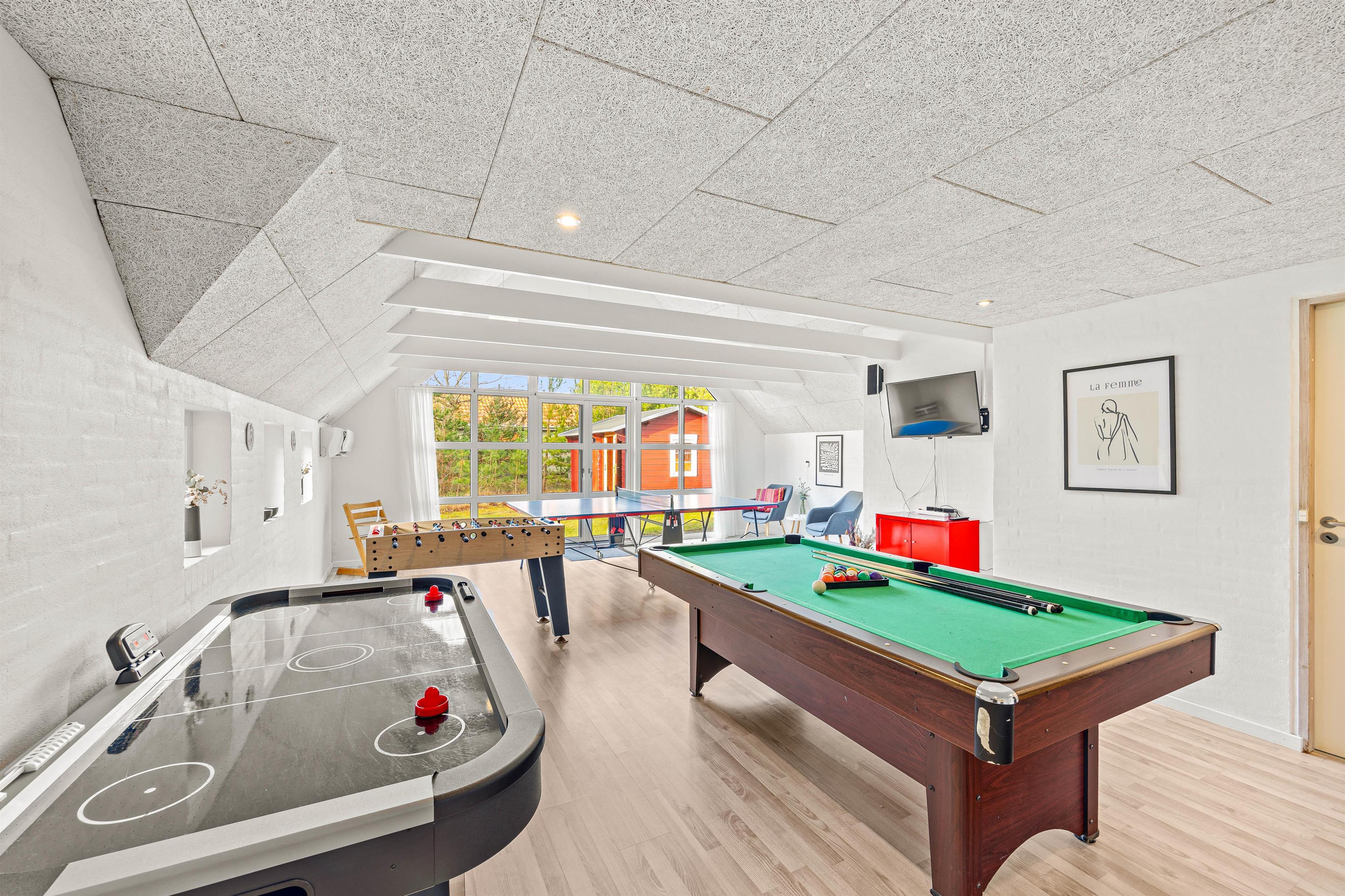 Et af feriehusets highlights er aktivitetsrummet, som byder på spil for både børn og voksne. Her er bordtennis, billard, airhockey, dart og bordfodbold, og I kan derfor få mange sjove timer til at gå med de forskellige aktiviteter og spil. Måske I vil afholde en spændende turnering og finde familiens spillemester?