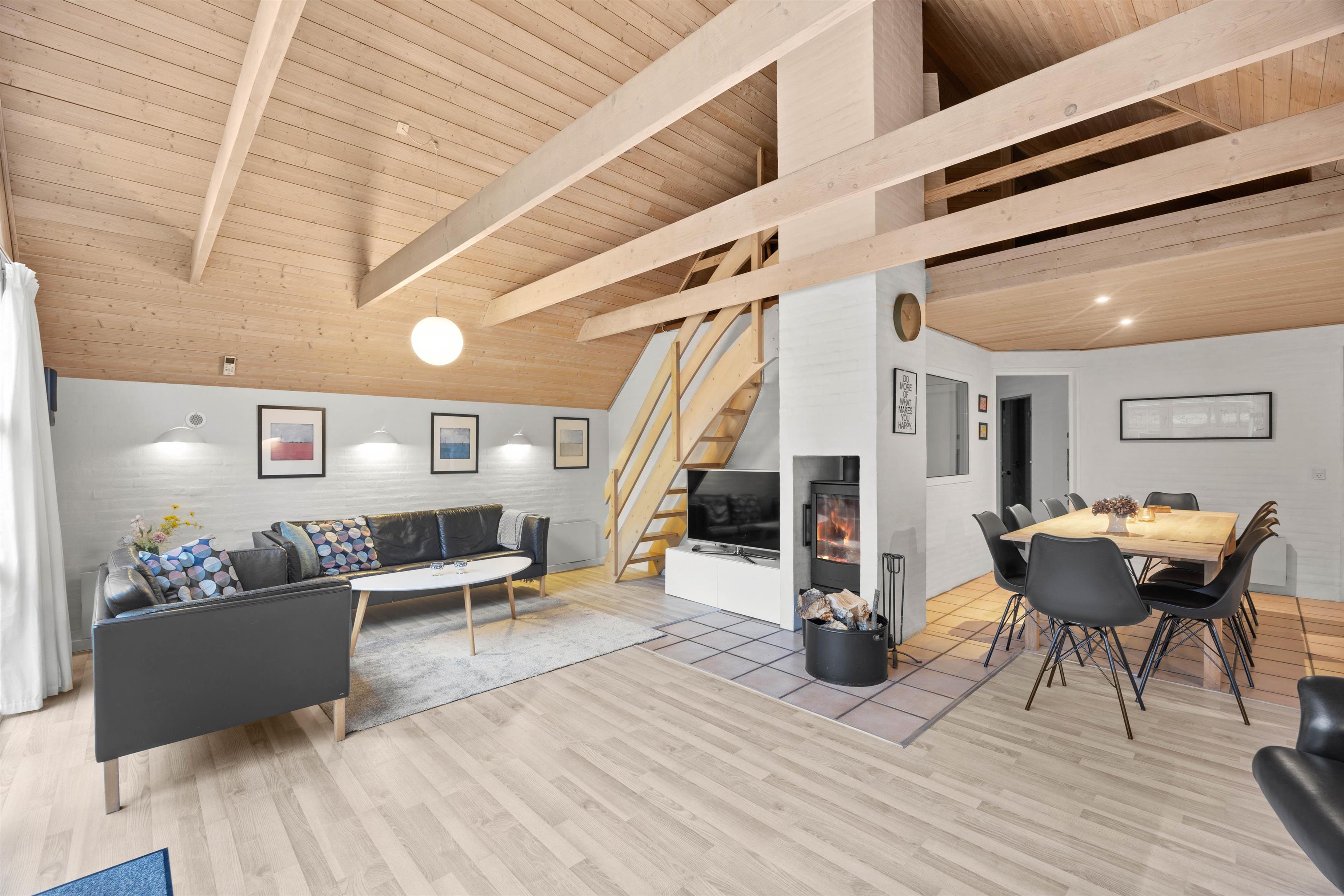 Velkommen til det indbydende og fint indrettede feriehus i Houstrup. Feriehusets samlingsrum er opholdsstuen med et stort vinduesparti, der skaber et godt lysindfald i rummet. Her kan I sætte jer godt til rette i sofaen, se tv eller lade blikket vandre ud i naturen. I sommerhuset er der både danske tv-kanaler og Chromecast. Brændeovnen skaber en særlig hyggelig feriestemning og god atmosfære, og I kan med fordel benytte jer af den energibesparende varmepumpe til at holde en behagelig temperatur.
