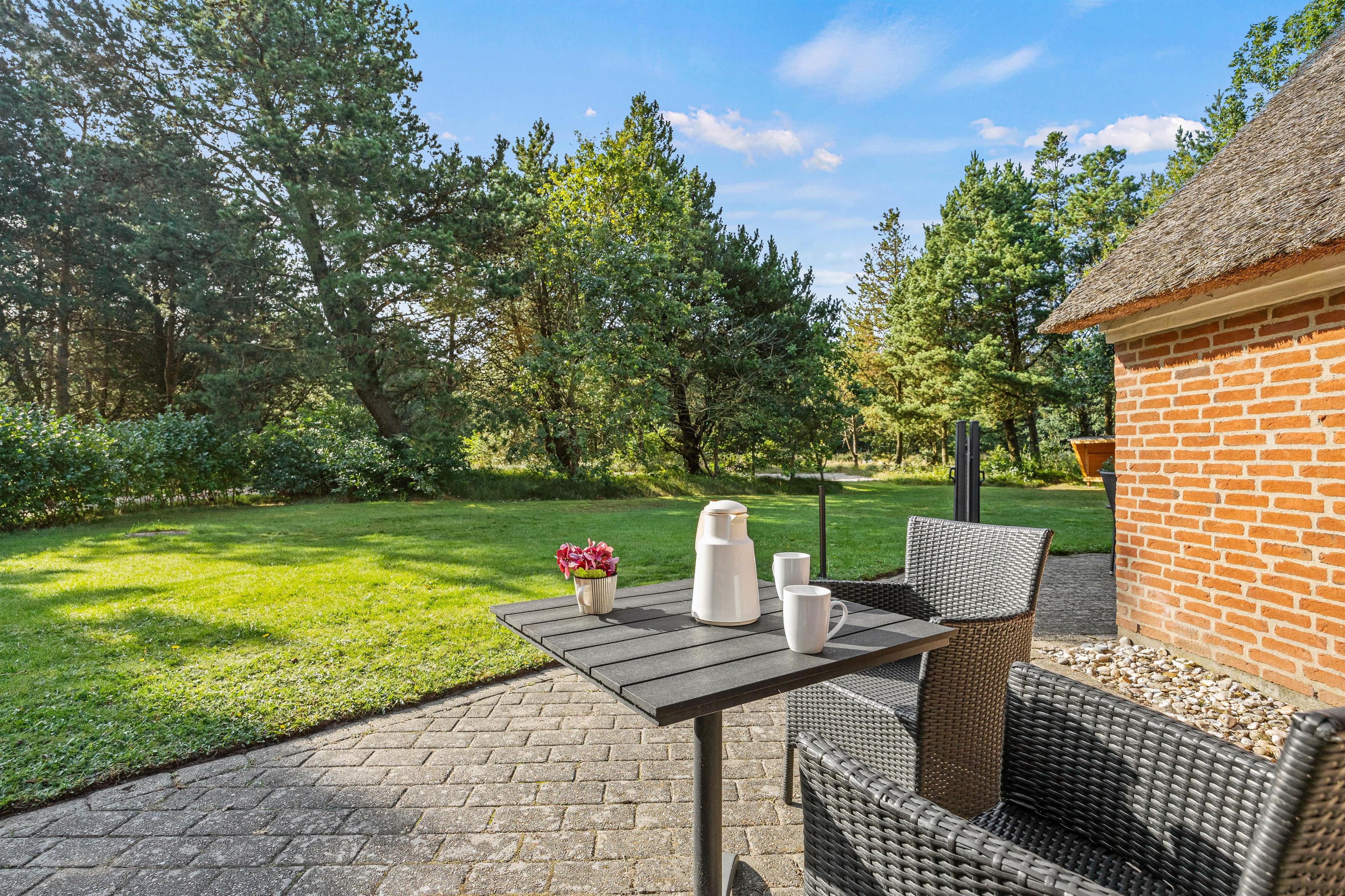 Sommerhuset ligger på en skøn plænegrund, som er delvist afskærmet af buske og træer. Den store terrasse indbyder til afslapning, og her står havemøbler, liggestole og grill klar til jer. Snup din yndlingsbog, nyd solen og en kølig drink, mens børnene leger i sandkassen eller gynger.