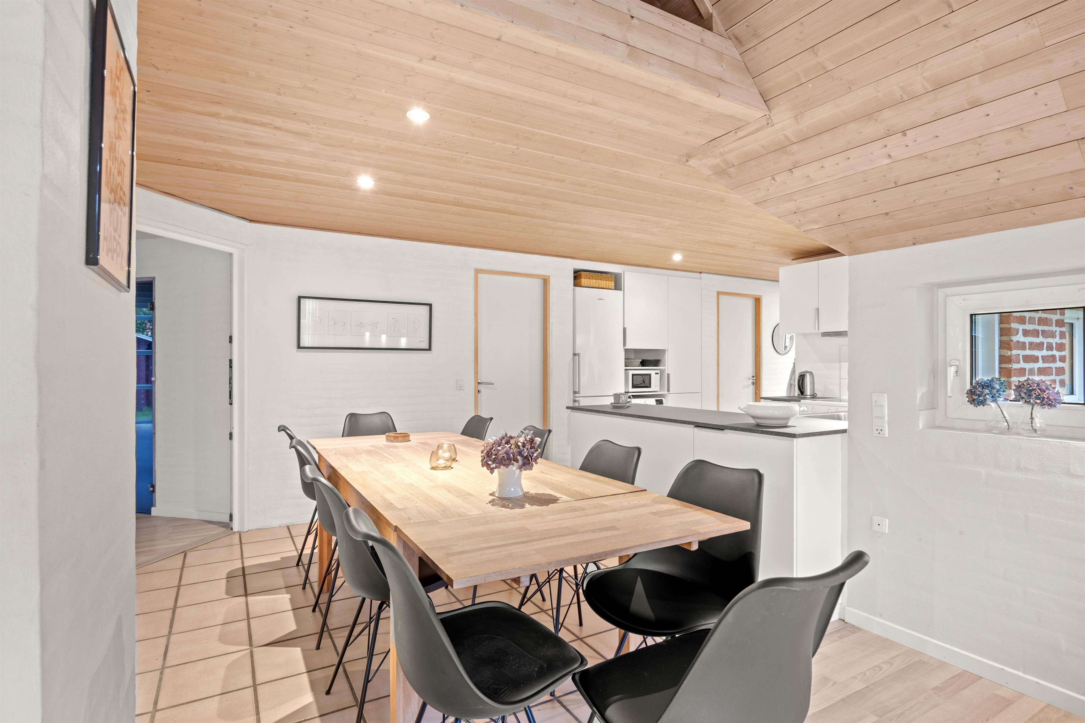 I åben forbindelse til stuen ligger spisepladsen og køkkenet, hvor hele familien kan samles om et hjemmelavet måltid. Det veludstyrede køkken har blandt andet opvaskemaskine, mikroovn og fryser på 80 liter.