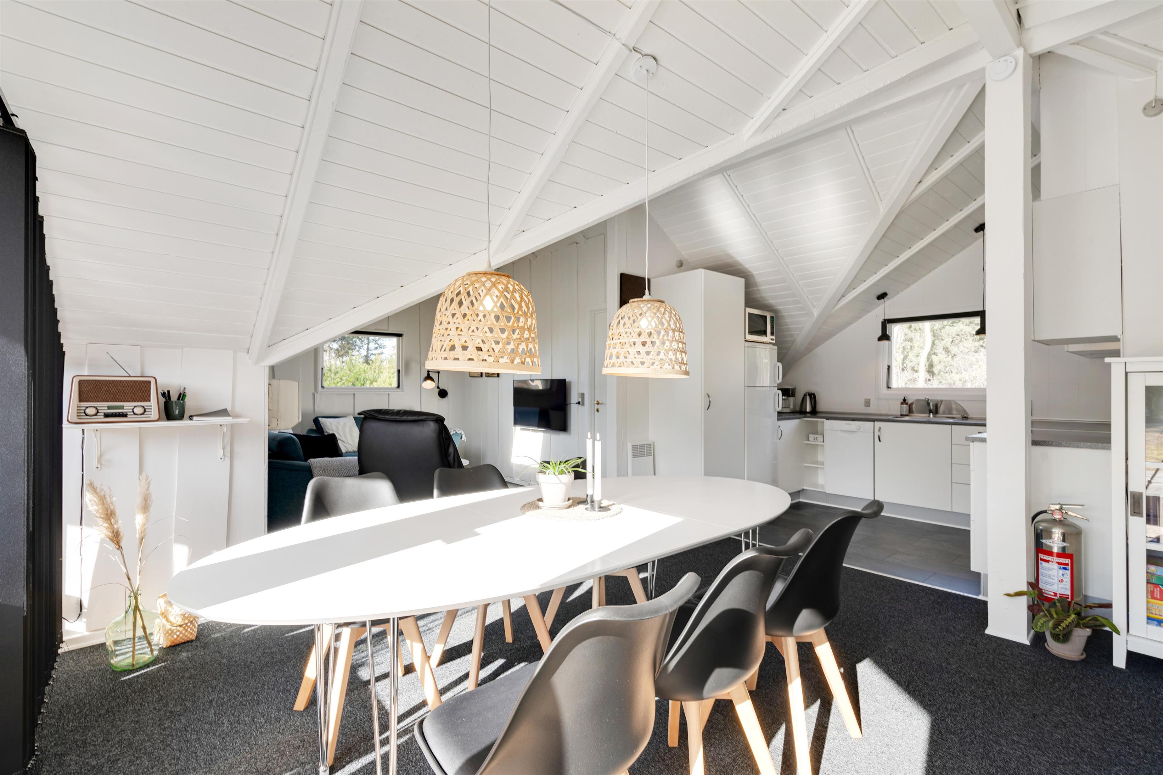 Husets opholdsrum er belagt med gulvtæppe og rummer en helt speciel charme og god plads til samvær. Her kan I tilbringe en masse tid sammen rundt om spisebordet eller i det hyggelige sofahjørne. Gennem de store vinduer slipper solens lys ind, og I får en skøn udsigt ud over den store have.