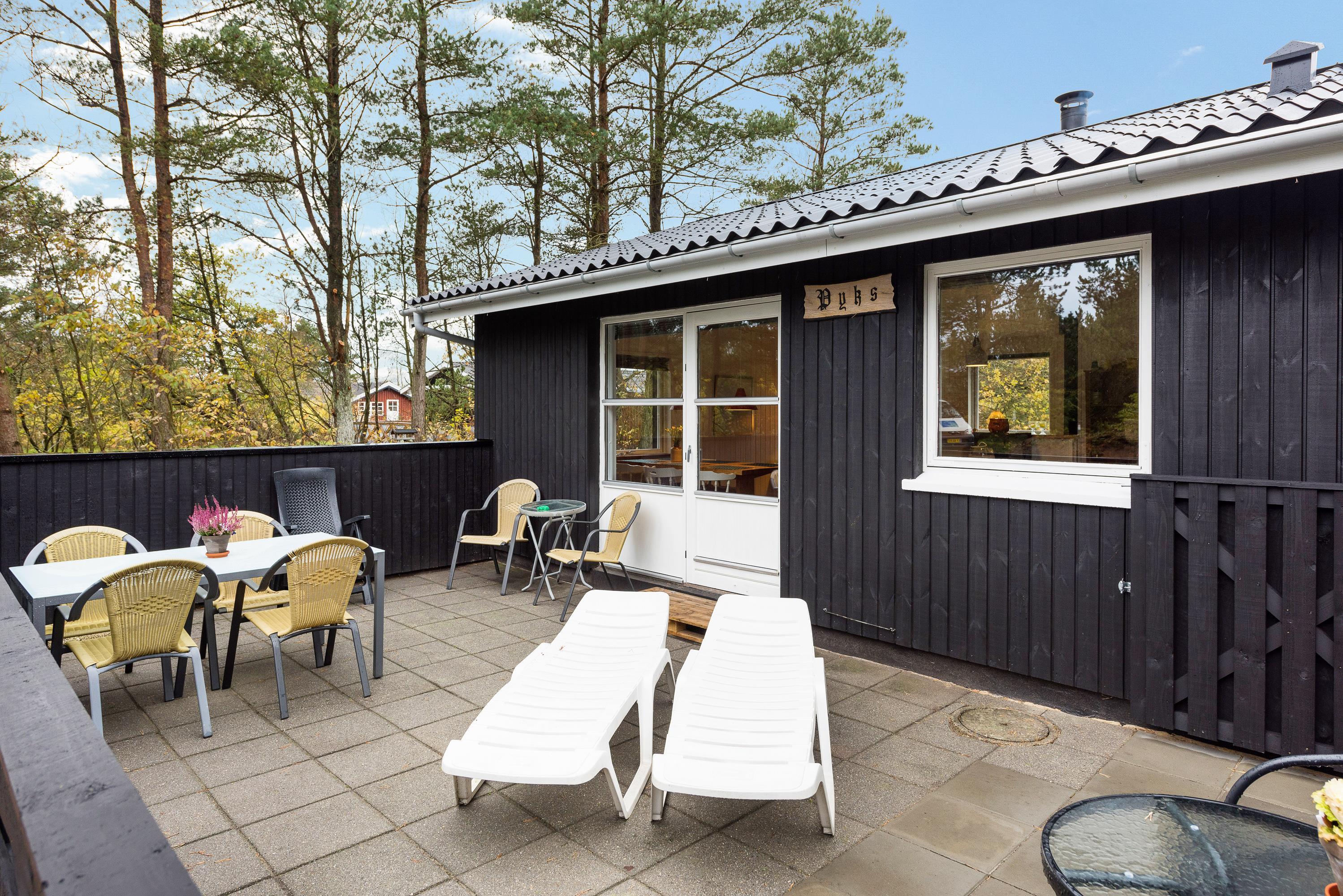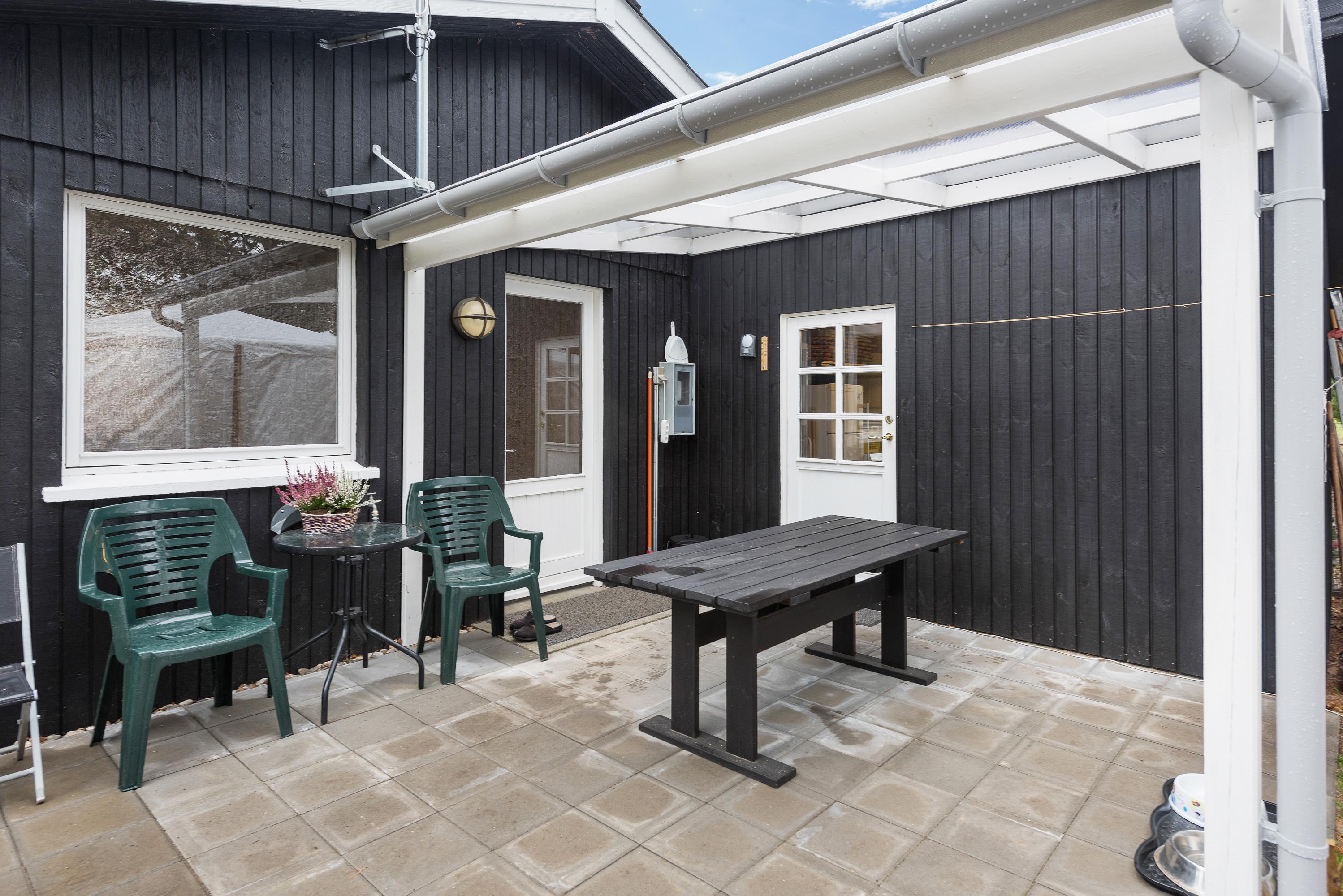 Imens børnene leger på gyngerne og bygger fantasibyer i sandkassen slapper mor og far af på liggestolene på den lukkede terrasse. Hunden ligger i skyggen, dejlig træt efter en lang gåtur gennem skoven ned til stranden. Der er købt ind til grillmad, og selv der er lovet regnvejr hen på dagen, er det intet problem, - grillen er allerede rykket ind under halvtaget på den overdækkede terrasse - det er ægte ferietid på Hans Hansensvej 108.