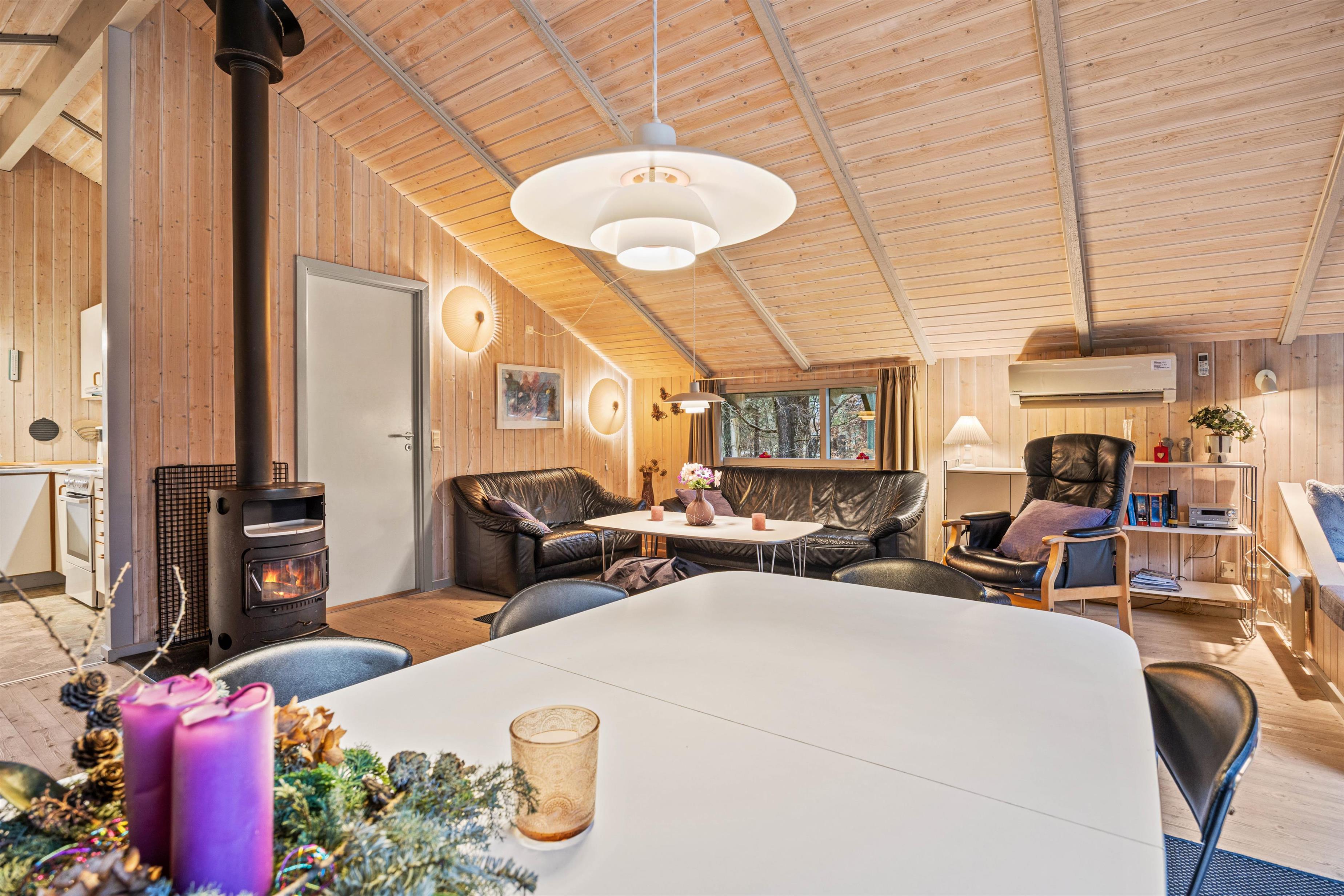 Det klassiske træsommerhus har alt, hvad feriehjertet begærer. På kolde vinterdage sørger brændeovnen for feriestemning og varme, og stuen er udstyret med et hyggeligt sofahjørne, hvor der kan spilles kort og ses film på de sene ferieaftener.