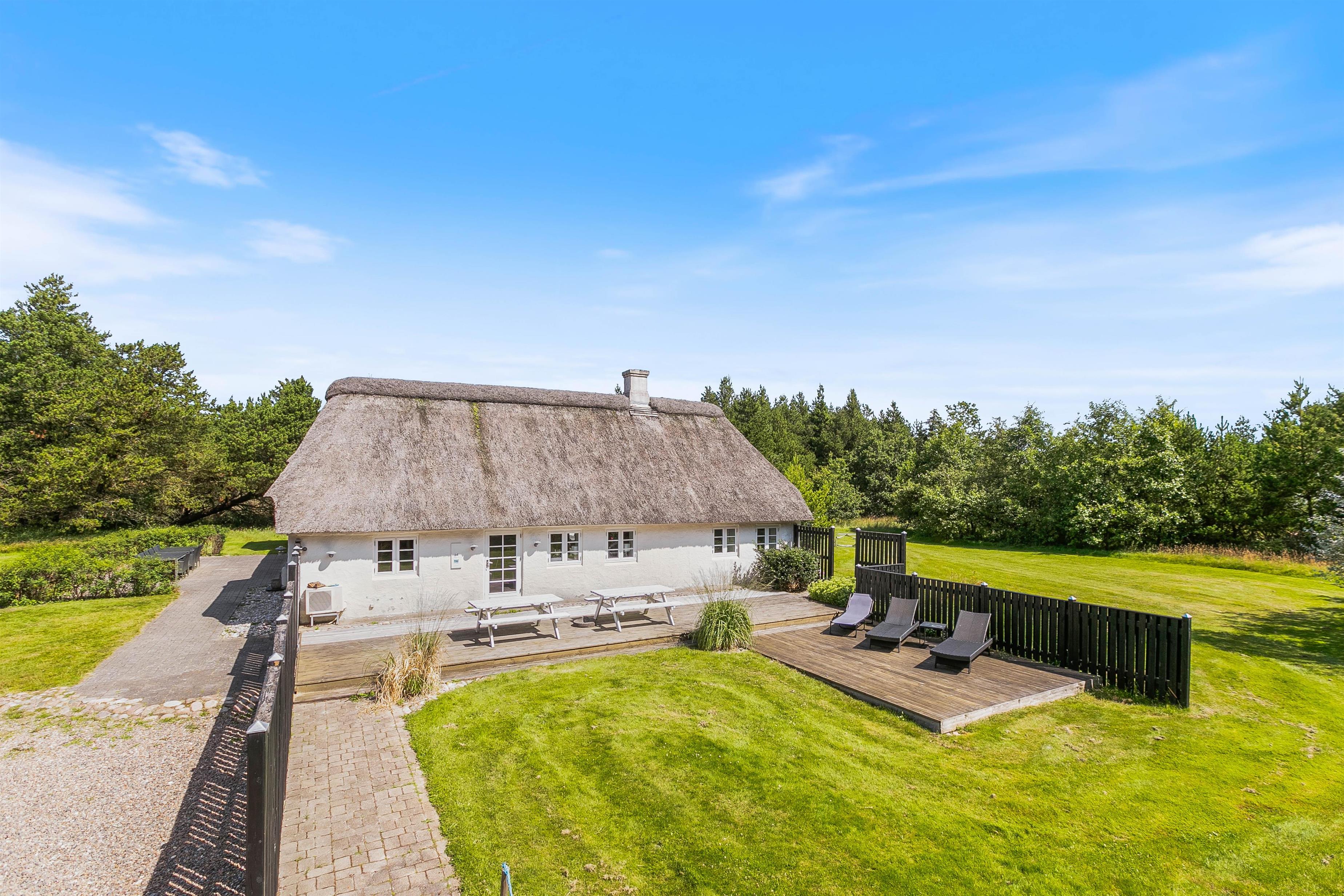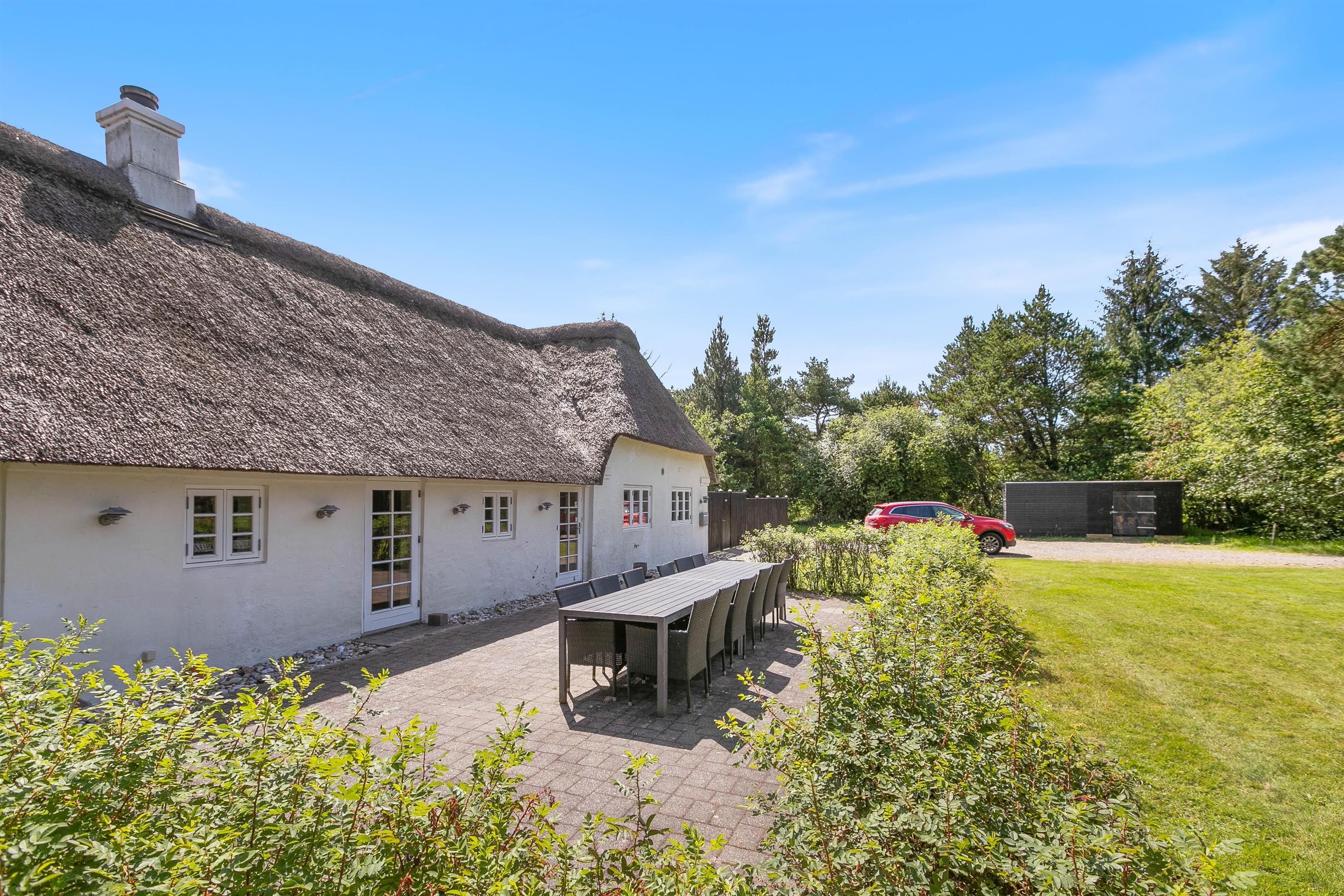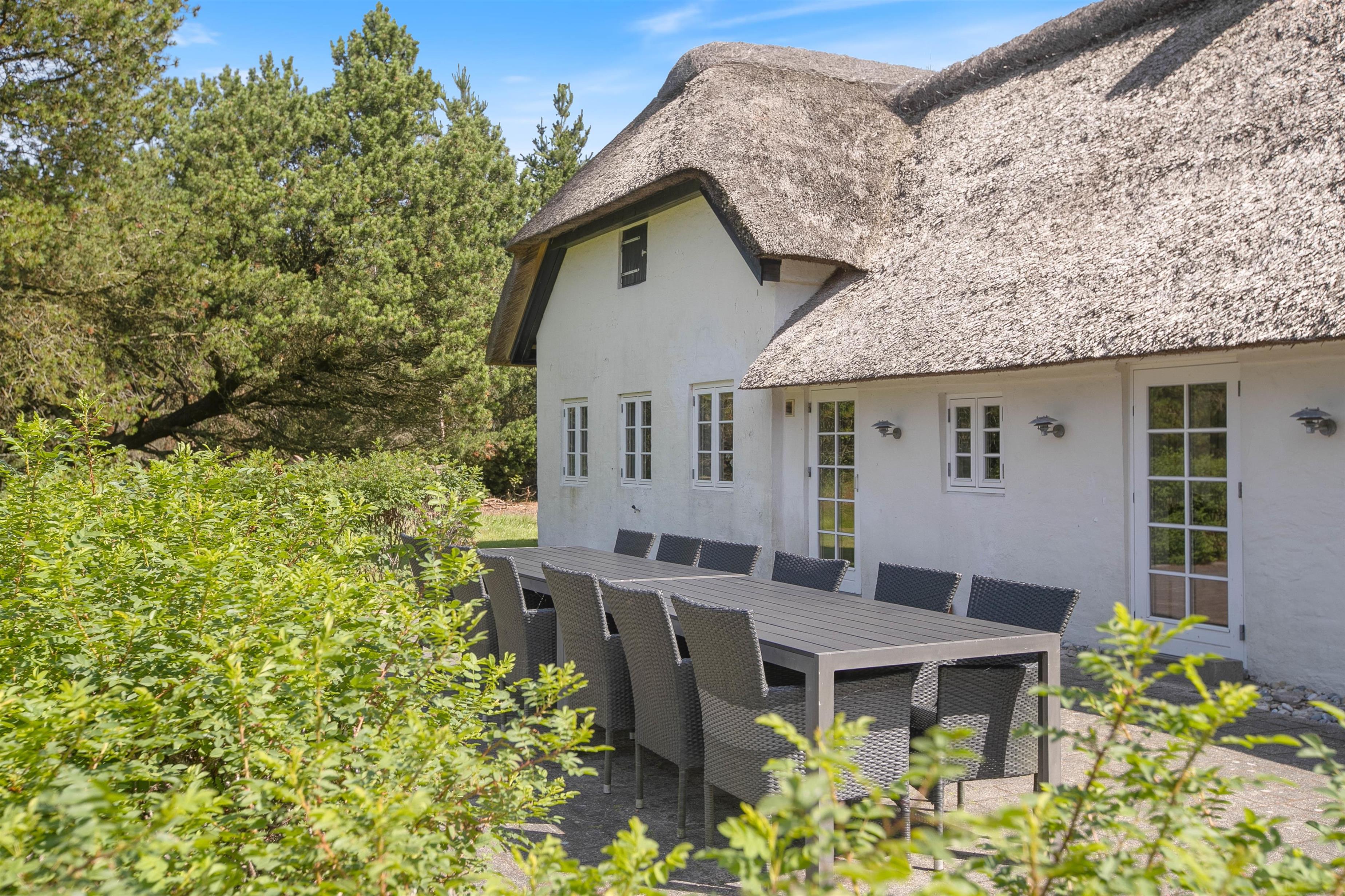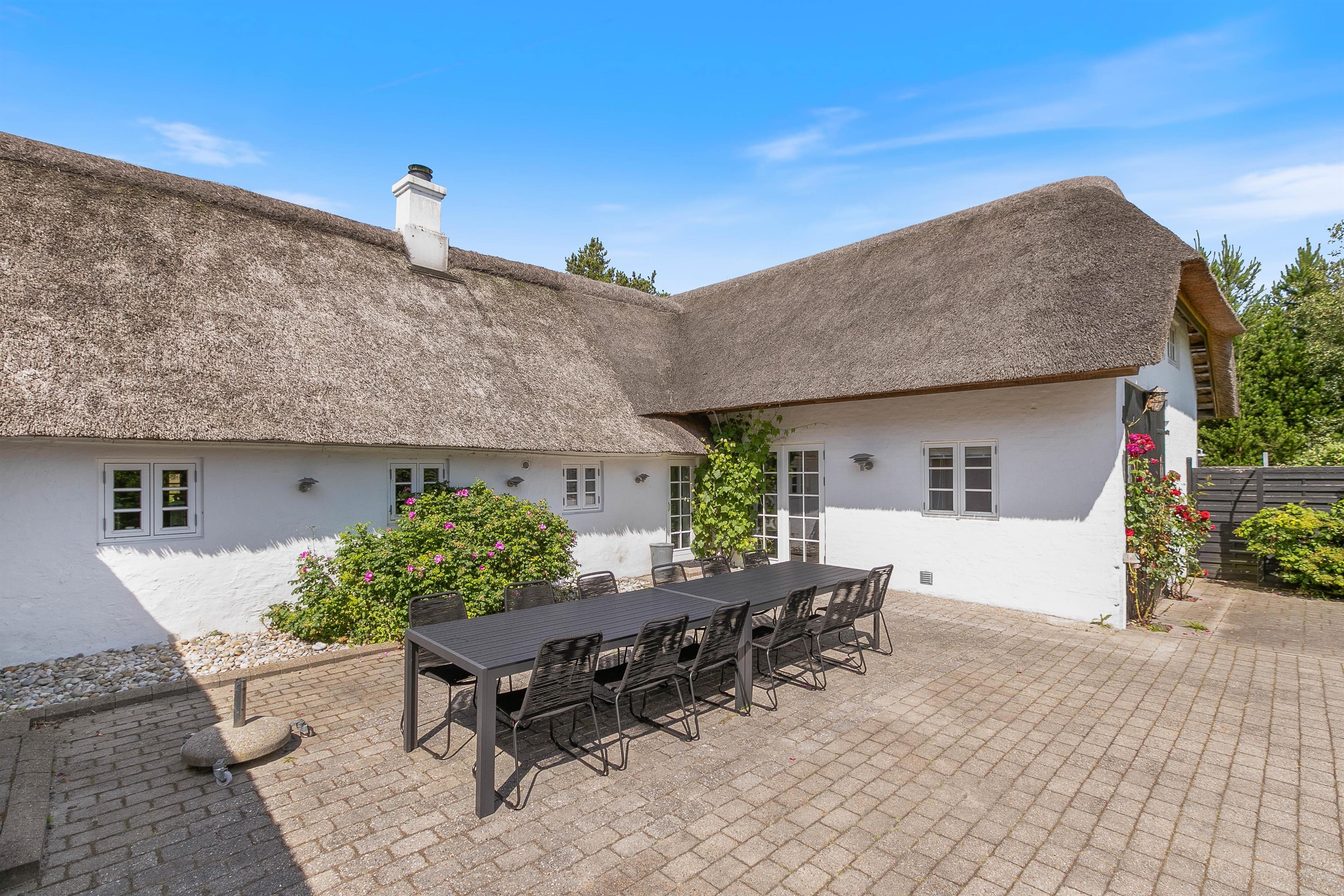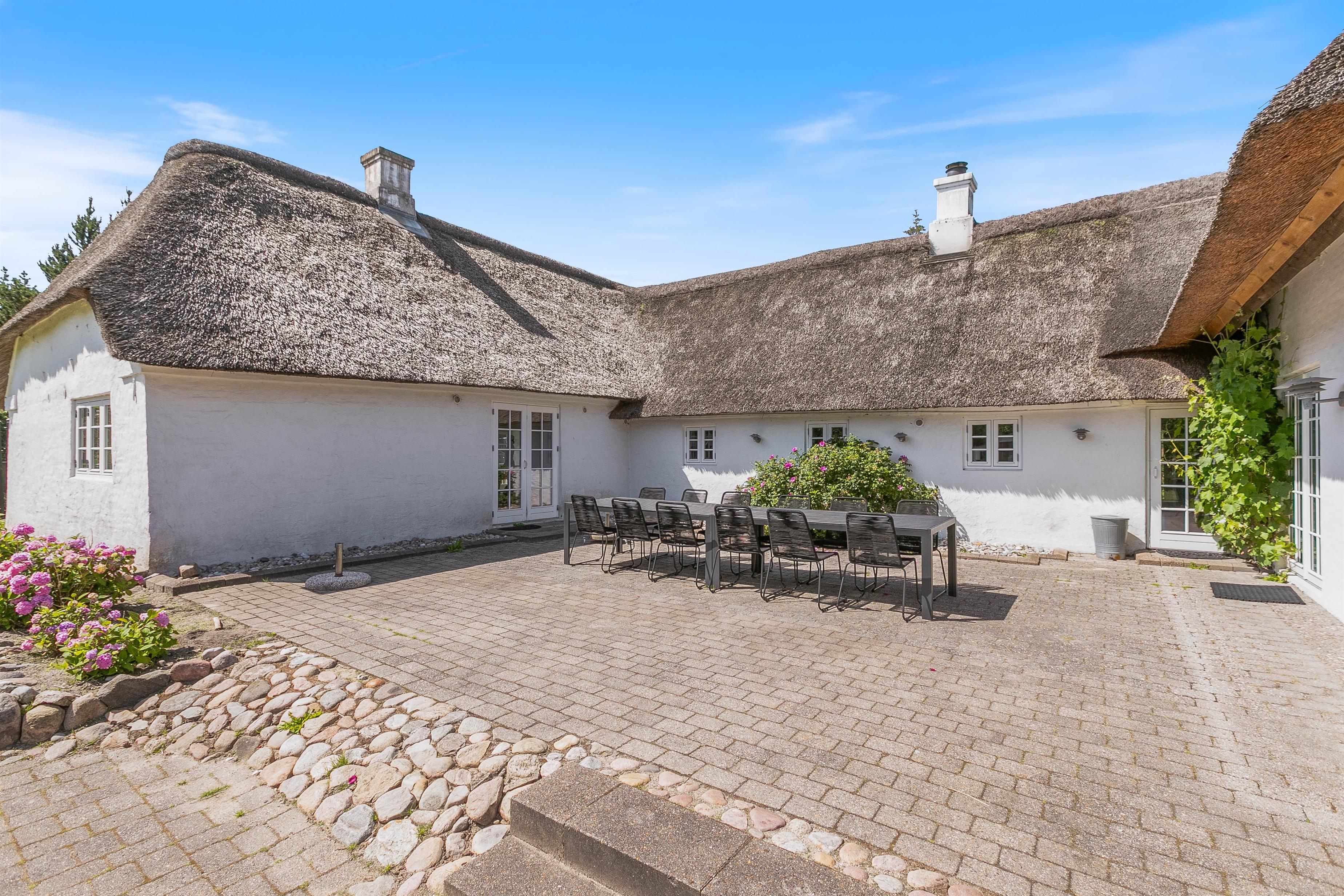 Sommerhuset, beliggende på Houstrupvej 120, er designet til at rumme op til 16 gæster og strækker sig over 300 kvadratmeter. Denne charmerende stråtækte bolig udstråler ægte dansk atmosfære og venter på at byde jer velkommen til det smukke Houstrup-landskab.