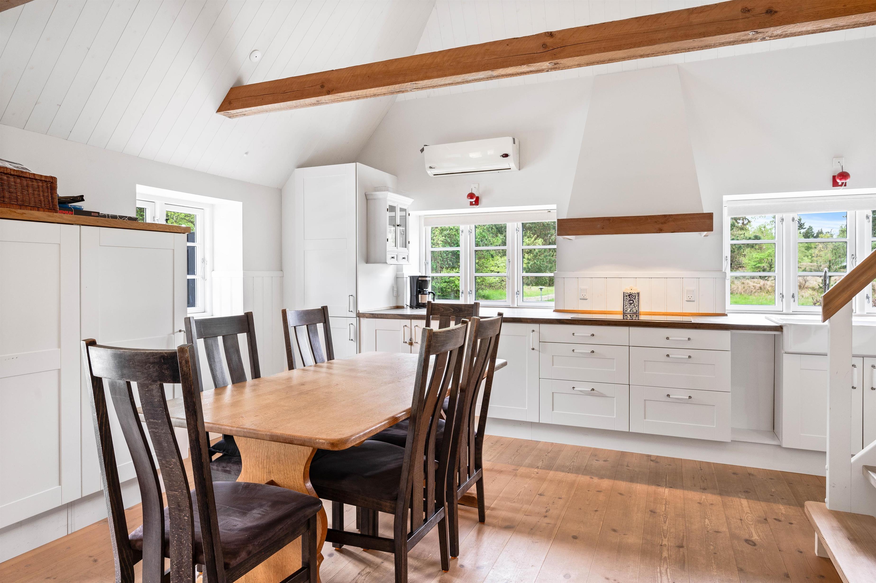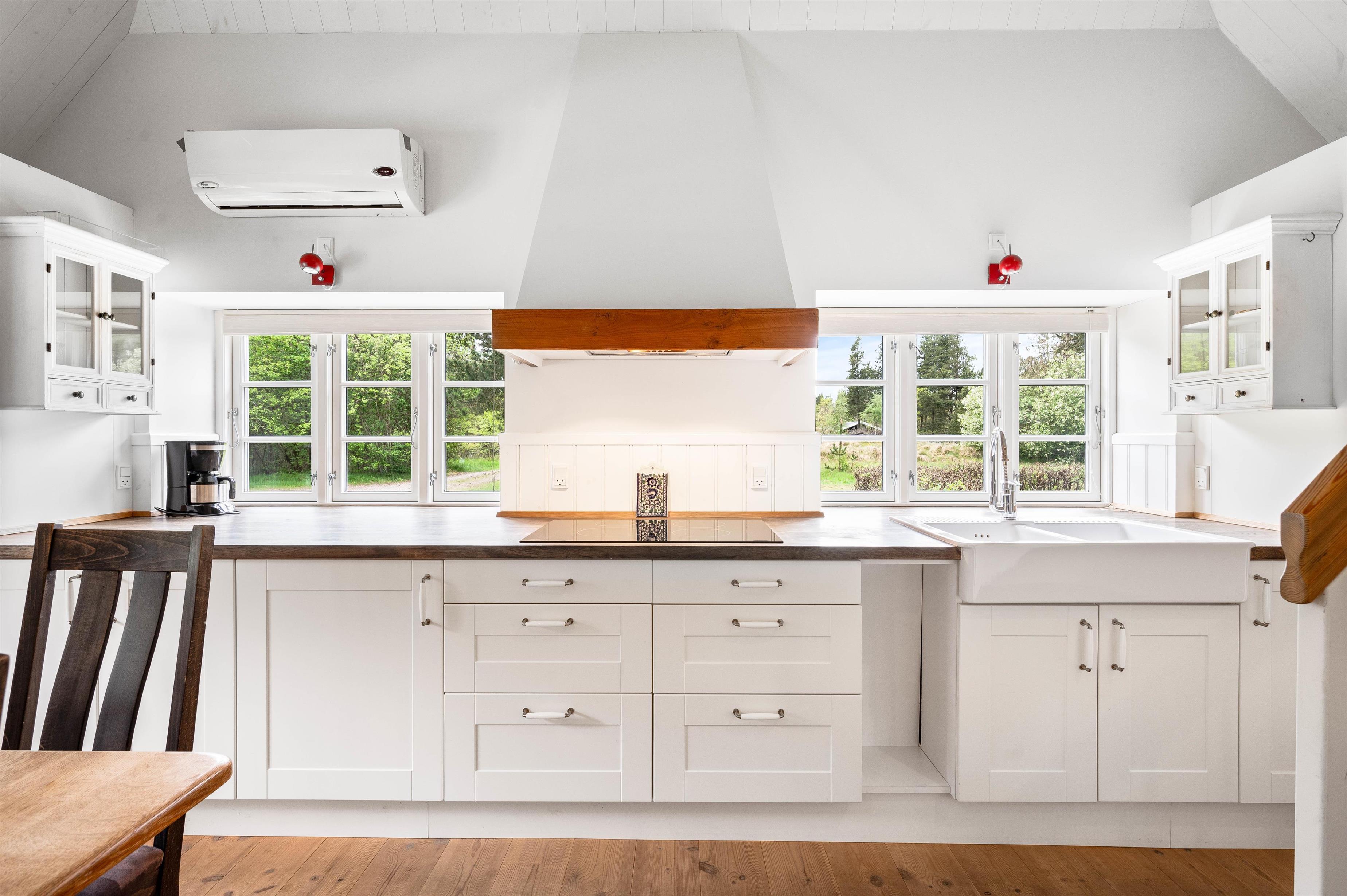 Udover det lyse samtalekøkken, der inviterer til fælles madlavning og hyggelige måltider, byder sommerhuset også på et ekstra køkken i aktivitetsrummet. Her kan I forberede snacks og forfriskninger, mens I nyder spil og sjov med familien. Med to køkkener til rådighed er der rig mulighed for at tilpasse madlavningen og skabe øjeblikke sammen.