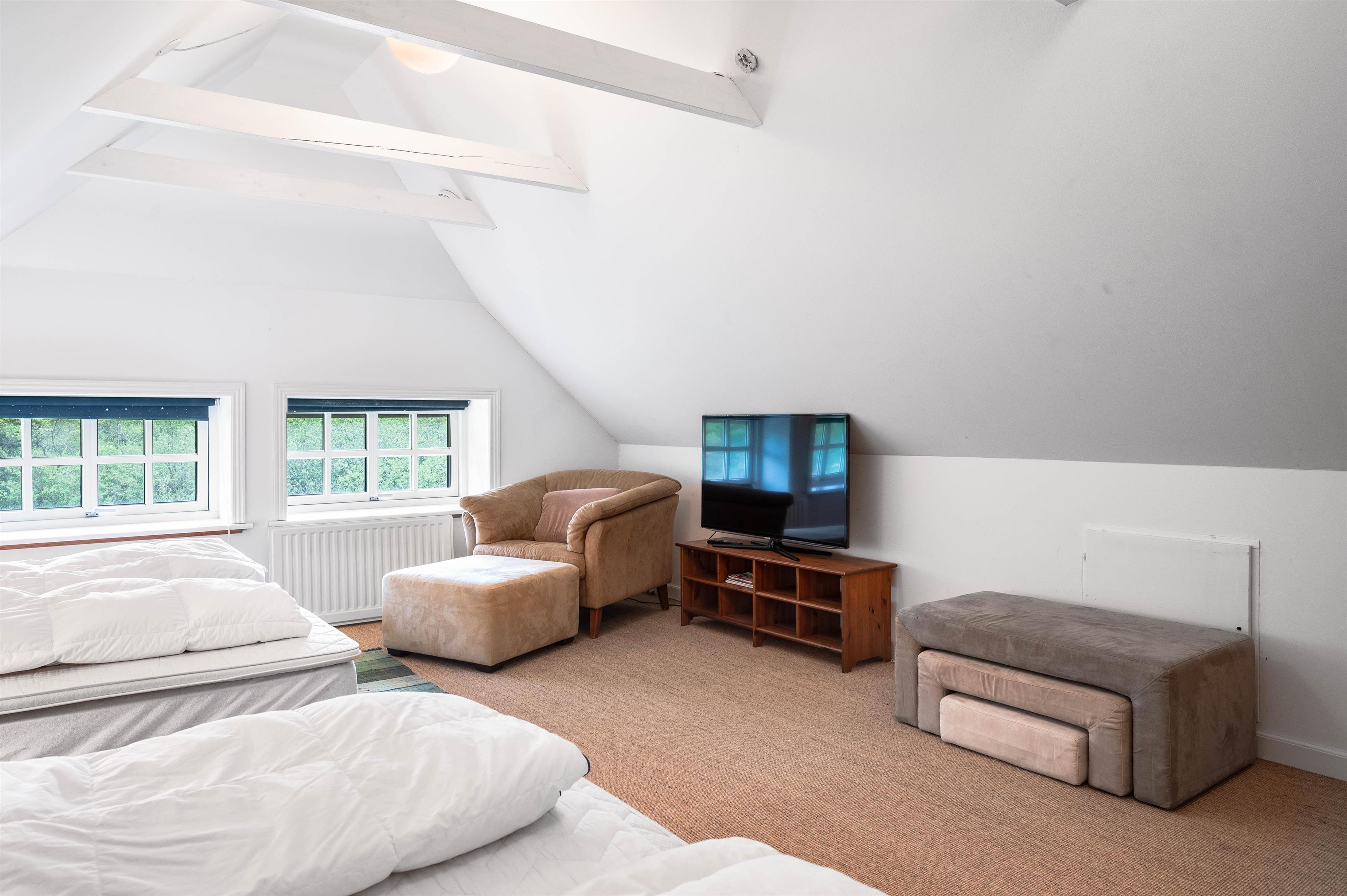 Sengefordelingen er designet til at imødekomme familiesamværet med mulighed for at skabe en speciel "ungeafdeling", hvor flere familiemedlemmer kan sove sammen. Med 5 soveværelser i stueetagen og yderligere 6 sovepladser på førstesalen er der rig mulighed for at tilpasse indkvarteringen efter familiens behov og ønsker. Soveværelset med 2 sovepladser på 1. sal er en åben hems.