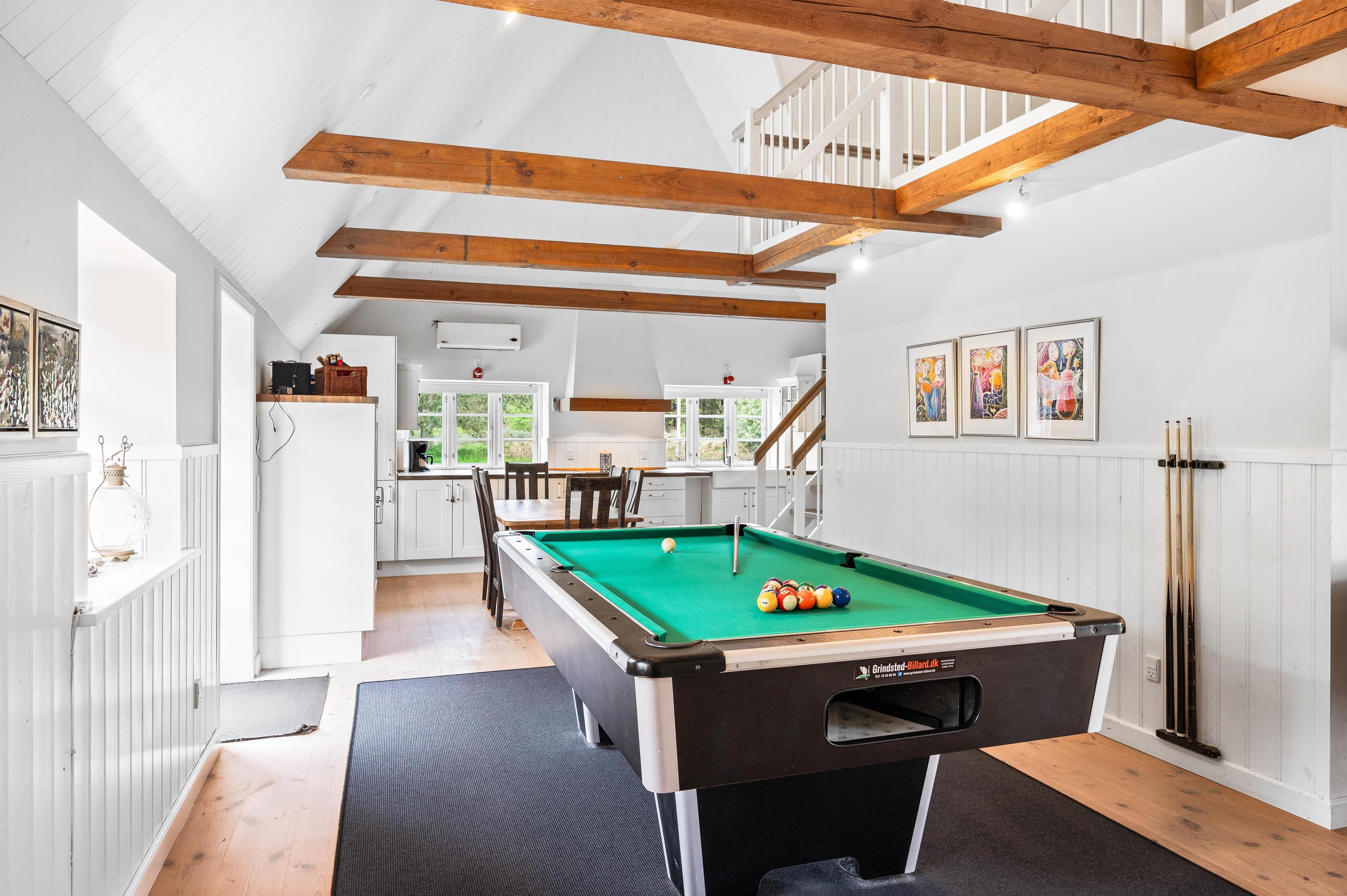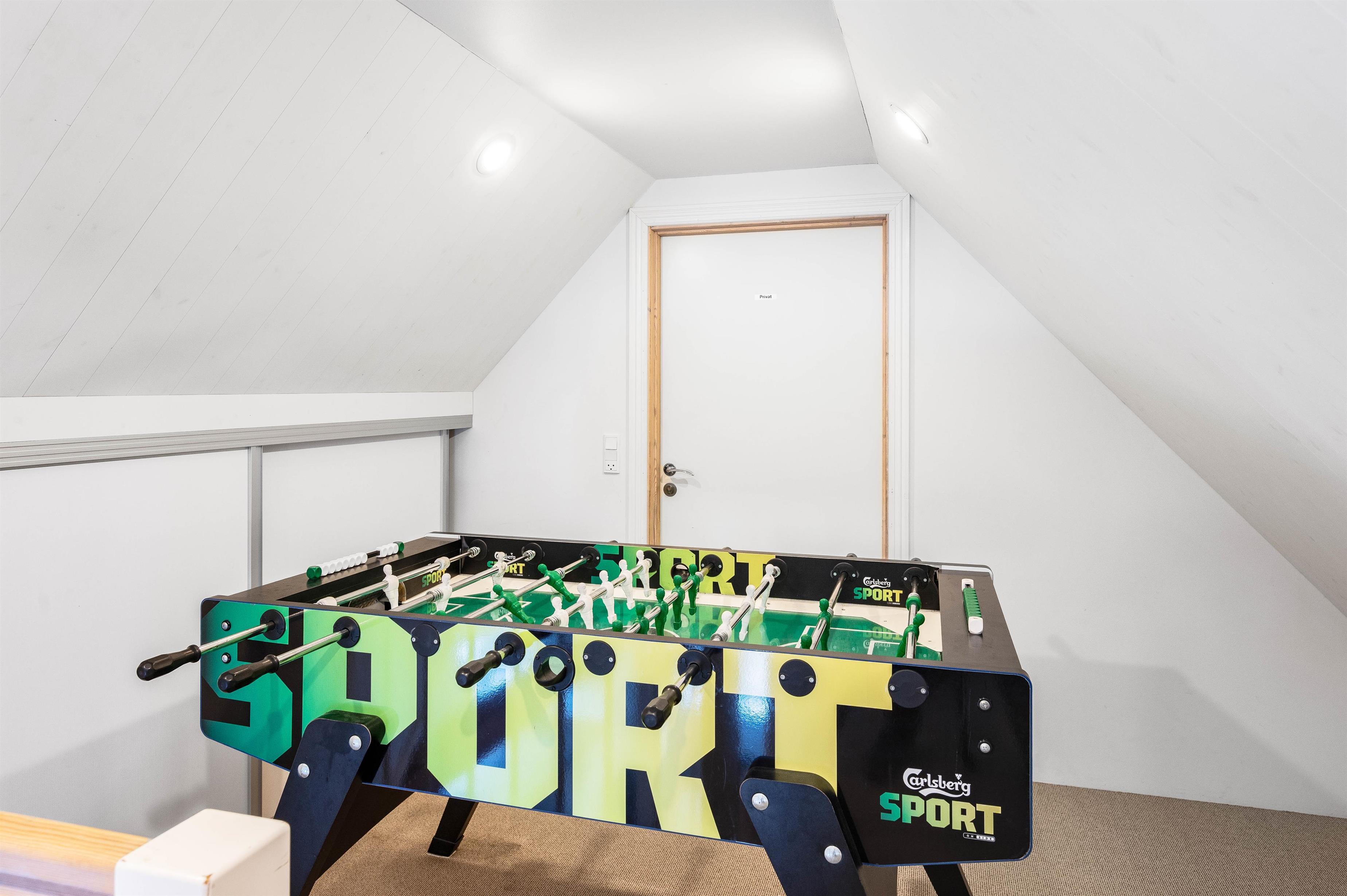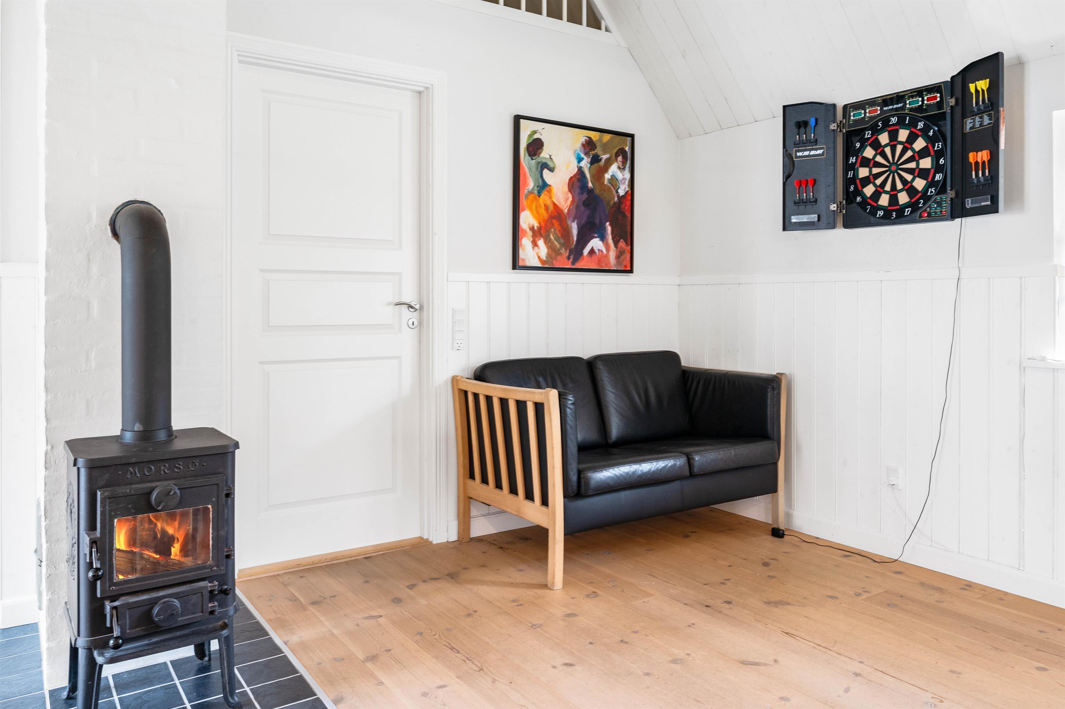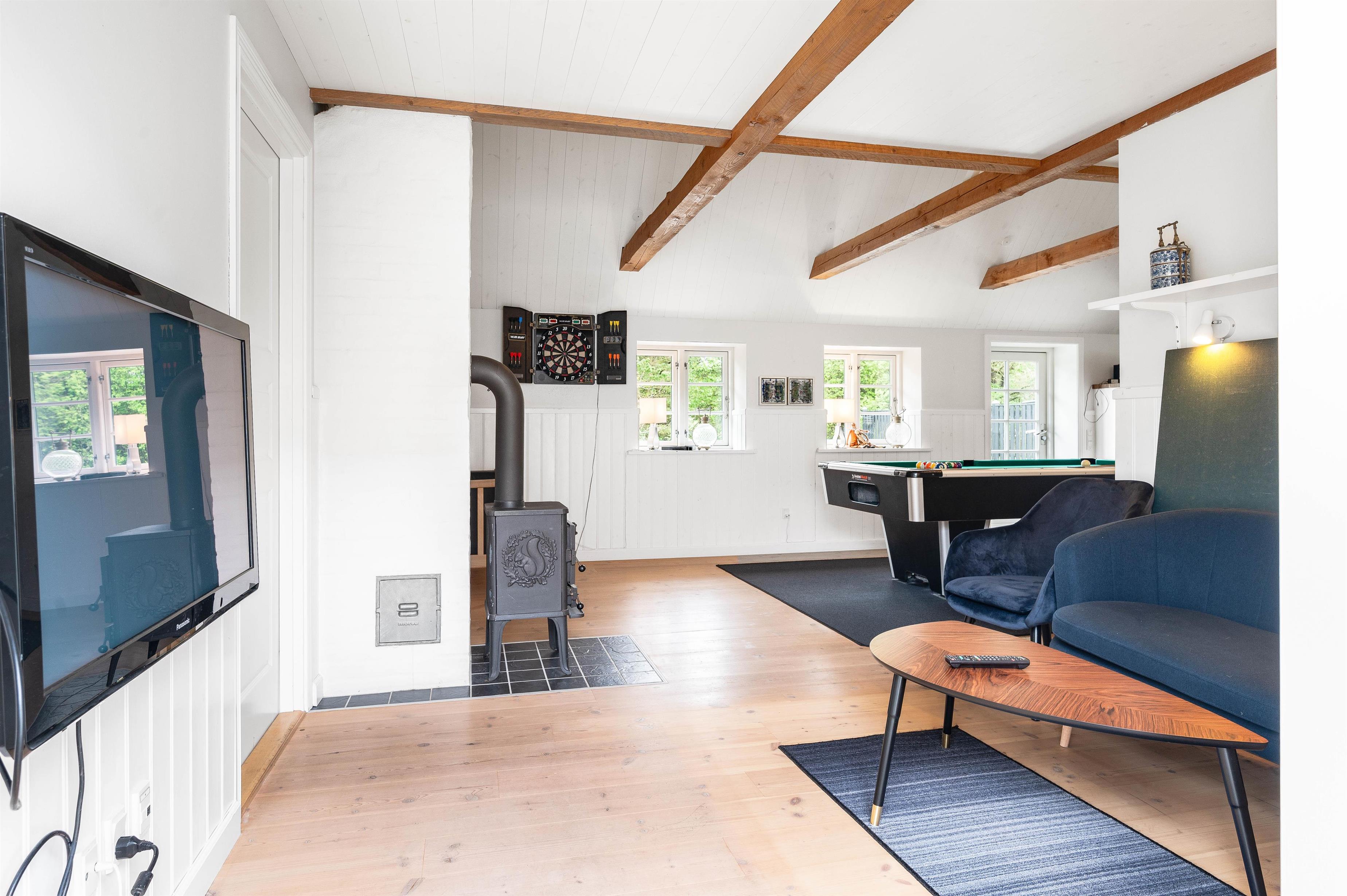 I den indbydende stue kan I slænge jer i de bløde, komfortable møbler og nyde varmen fra sommerhusets brændeovn. Her kan I også streame jeres yndlingsserier og film. Derudover byder sommerhuset på et aktivitetsrum, hvor I kan udfordre hinanden til en omgang pool eller dart.