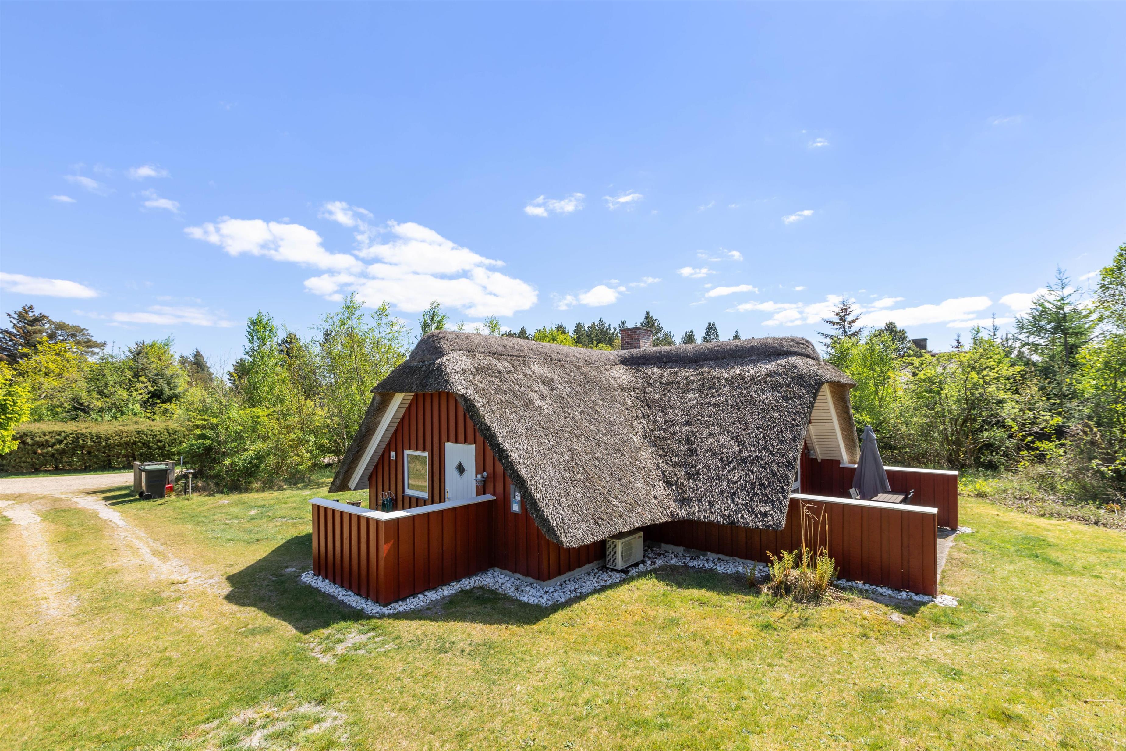 Udendørs byder sommerhuset på flere hyggelige terrasser, som kan tilgås direkte fra både stuen og spisestuen. Disse områder er ideelle til at tilbringe tid under åben himmel. Her er alt, hvad I behøver for en skøn aften med mad i det fri, herunder grill og komfortable havemøbler til dagens BBQ.