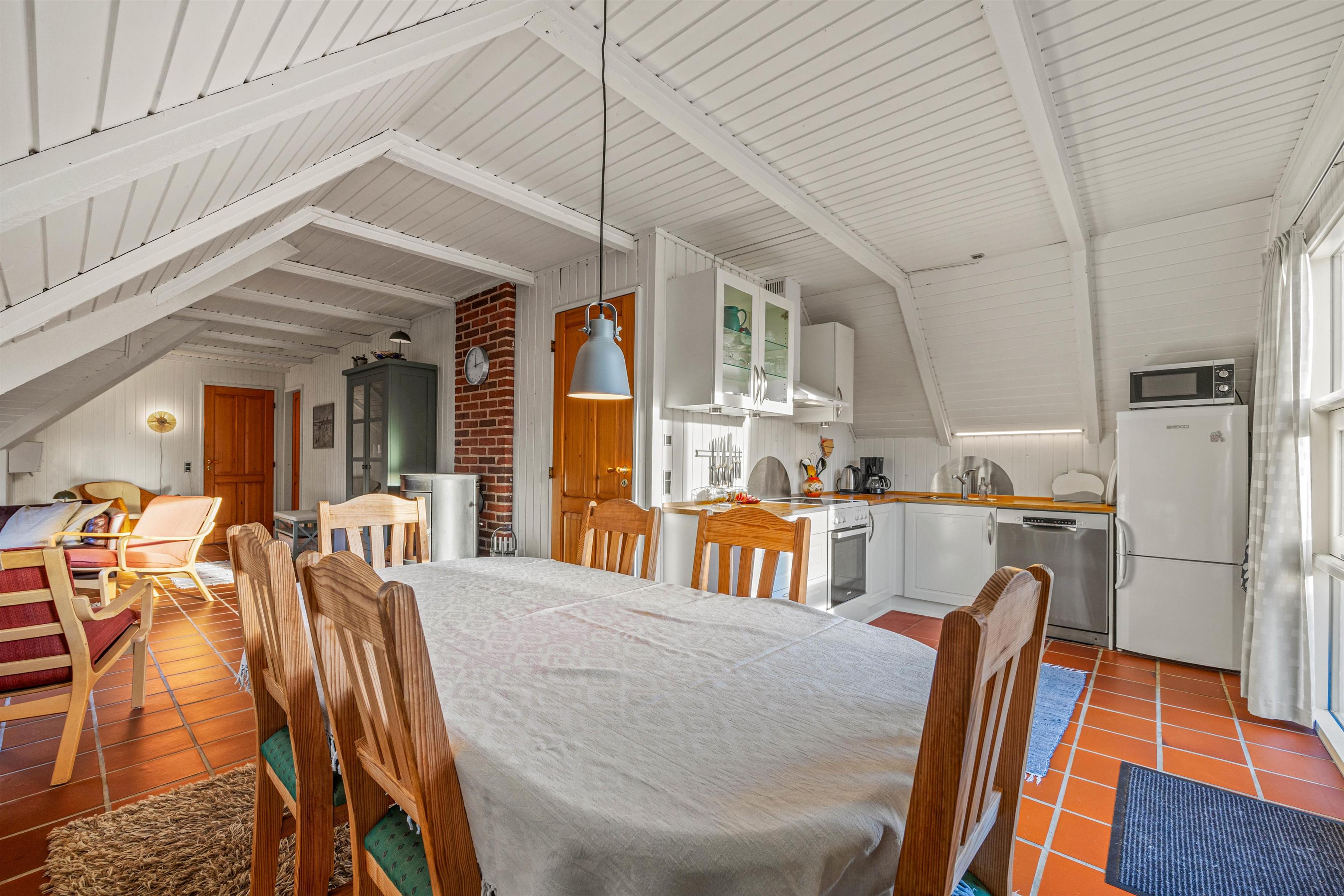 Når I træder ind i sommerhuset, vil I straks bemærke den lyse og åbne planløsning, der skaber en varm og indbydende atmosfære. Det centrale køkkenalrum er designet til at fremme hyggeligt samvær, hvor I både kan nyde madlavningen og slappe af i sofaen.