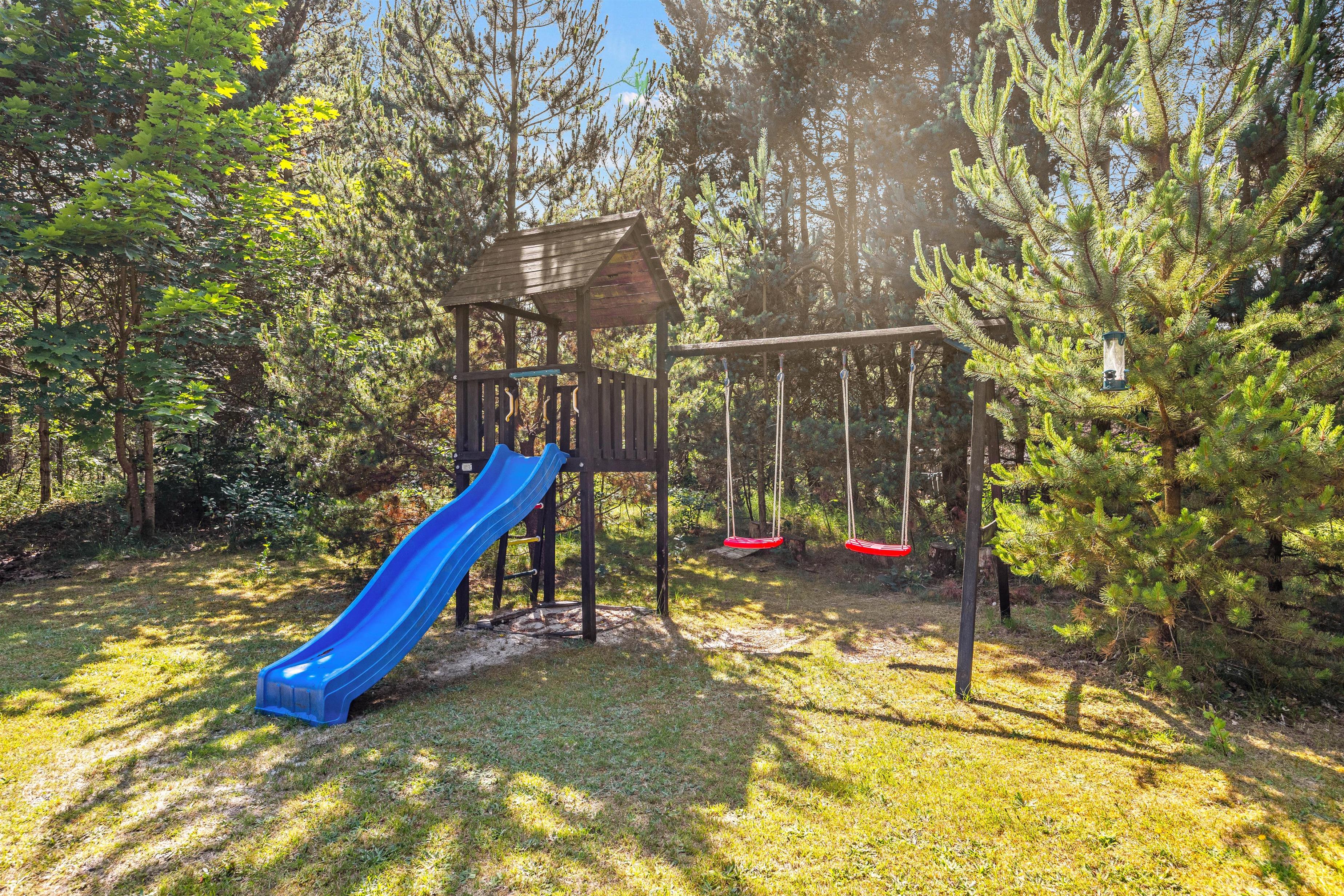 På den velholdte græsplæne er der masser af plads til leg og boldspil, og til glæde for de yngste familiemedlemmer er der også et legetårn med både gynger og rutsjebane på grunden. Her er hele familien godt underholdt på en fredfyldt solskinsdag.