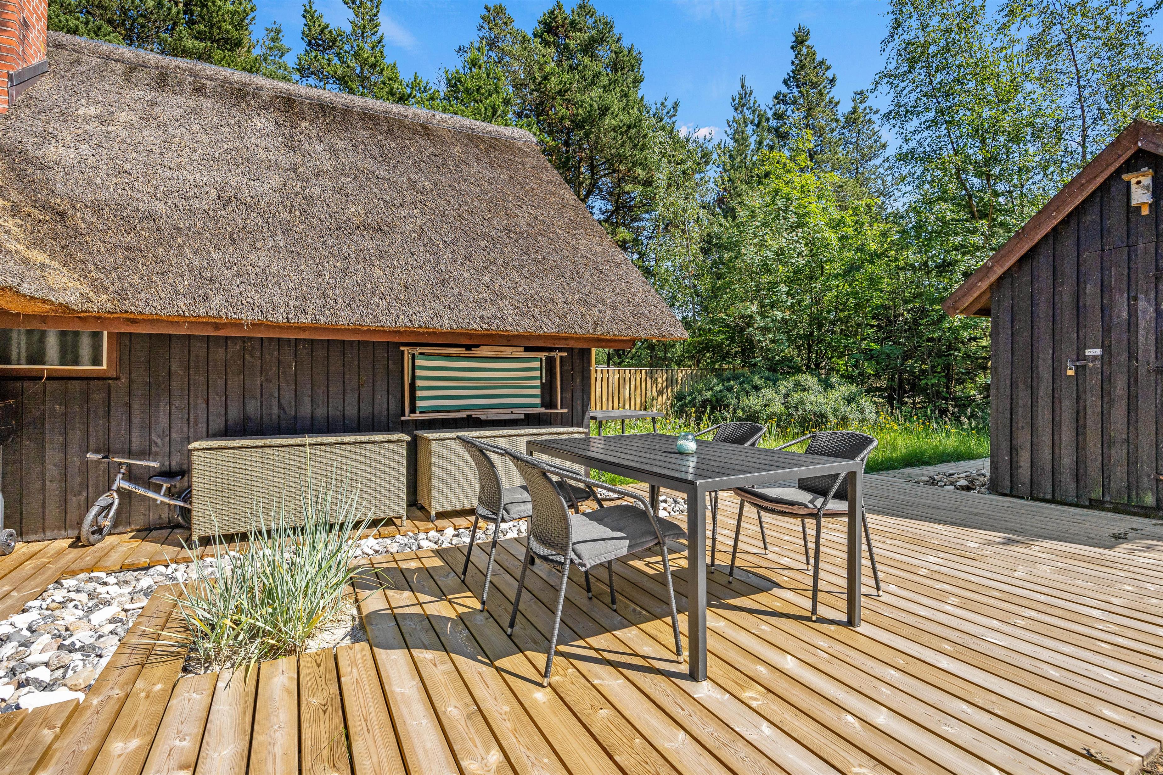 Fra alrummet er der udgang til feriehusets store træterrasse. Her finder I altid en læfyldt plads takket være den delvise afskærmning og overdækning. Hele den store plænegrund er omgivet af høje træer, så I har god ro til at nyde solen fra liggestolene eller spise en grillmiddag udenfor på en lun sommeraften.