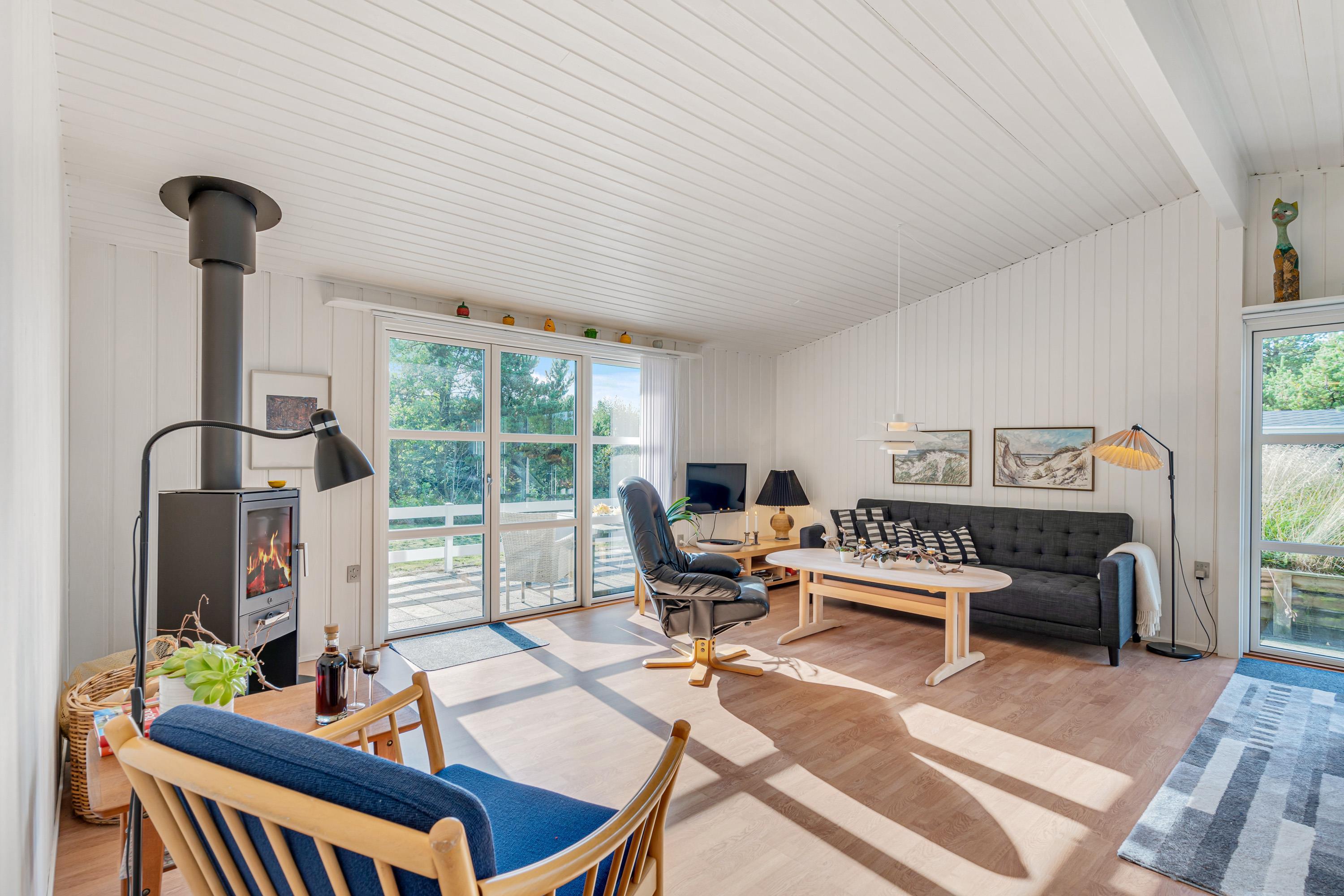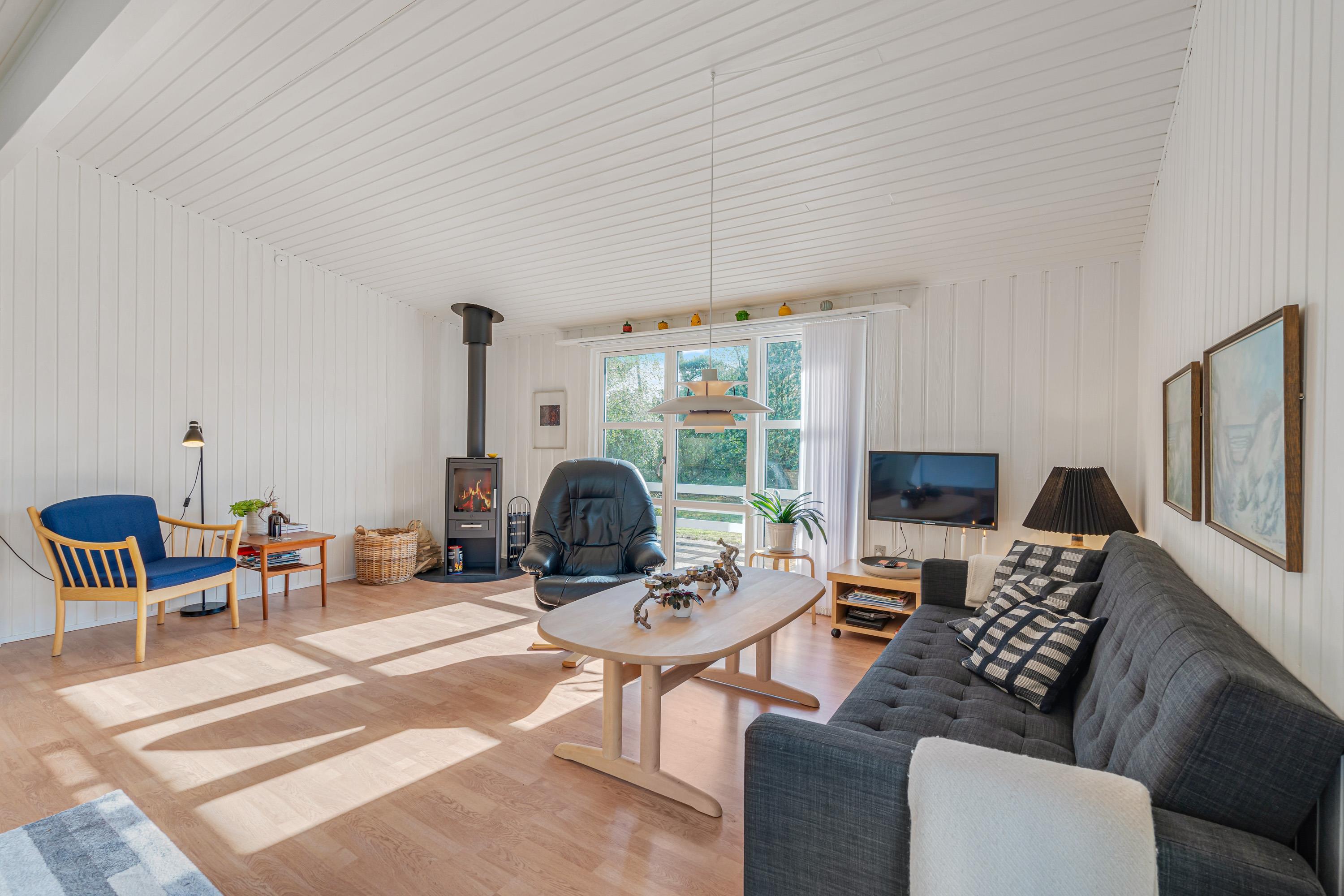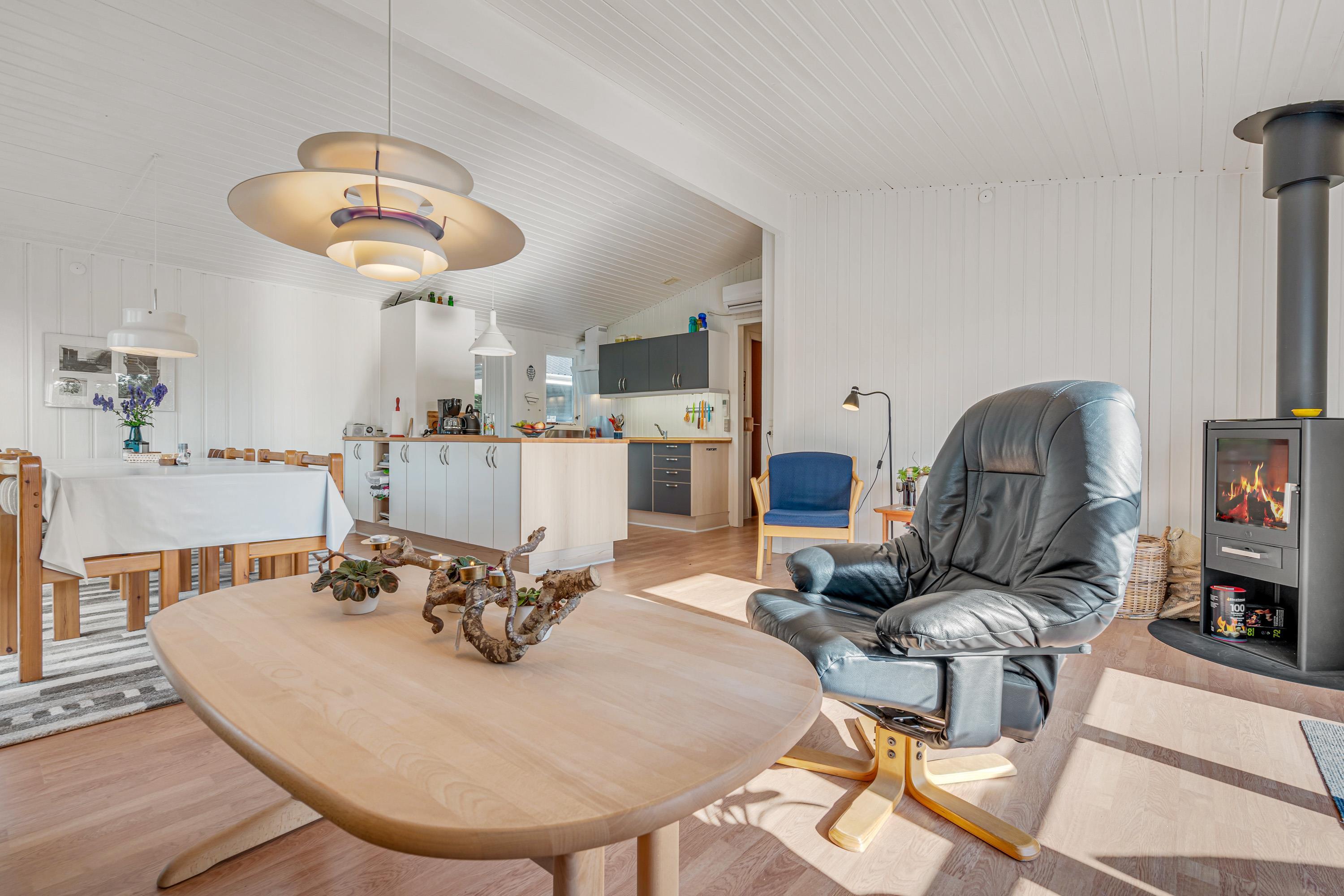Stuen, som er kombineret med åbent køkken, spiseplads og udstyret med brændeovn, udgør det centrale omdrejningspunkt for dette feriehus. Her kan I lave mad sammen, lave planer for de kommende dage eller se jeres yndlingsserier. På en kølig sommeraften er det også super hyggeligt at tænde op i brændeovnen og bare nyde den knitrende varme. Alternativt er der en moderne varmepumpe for at sikre behagelige temperaturer.
