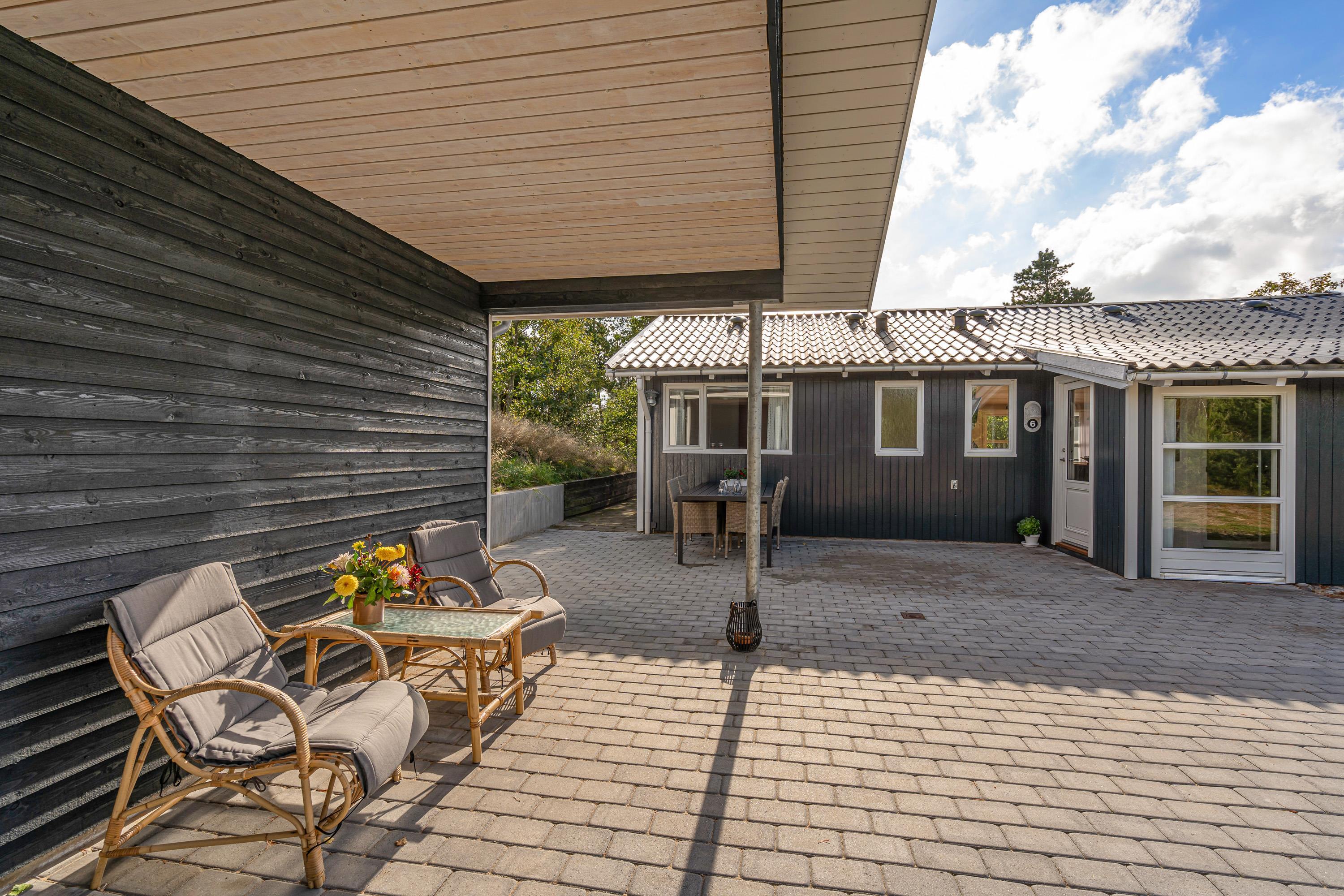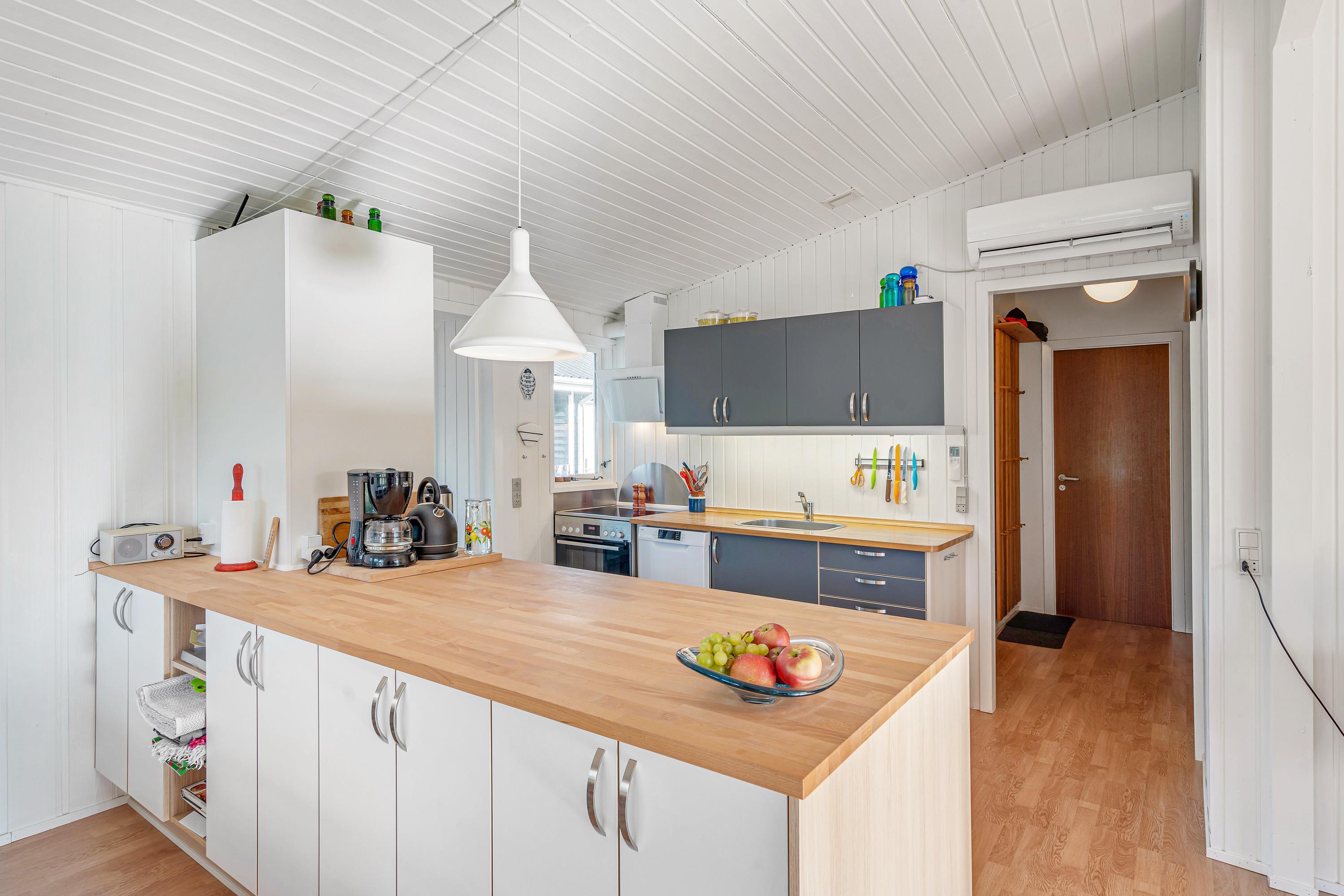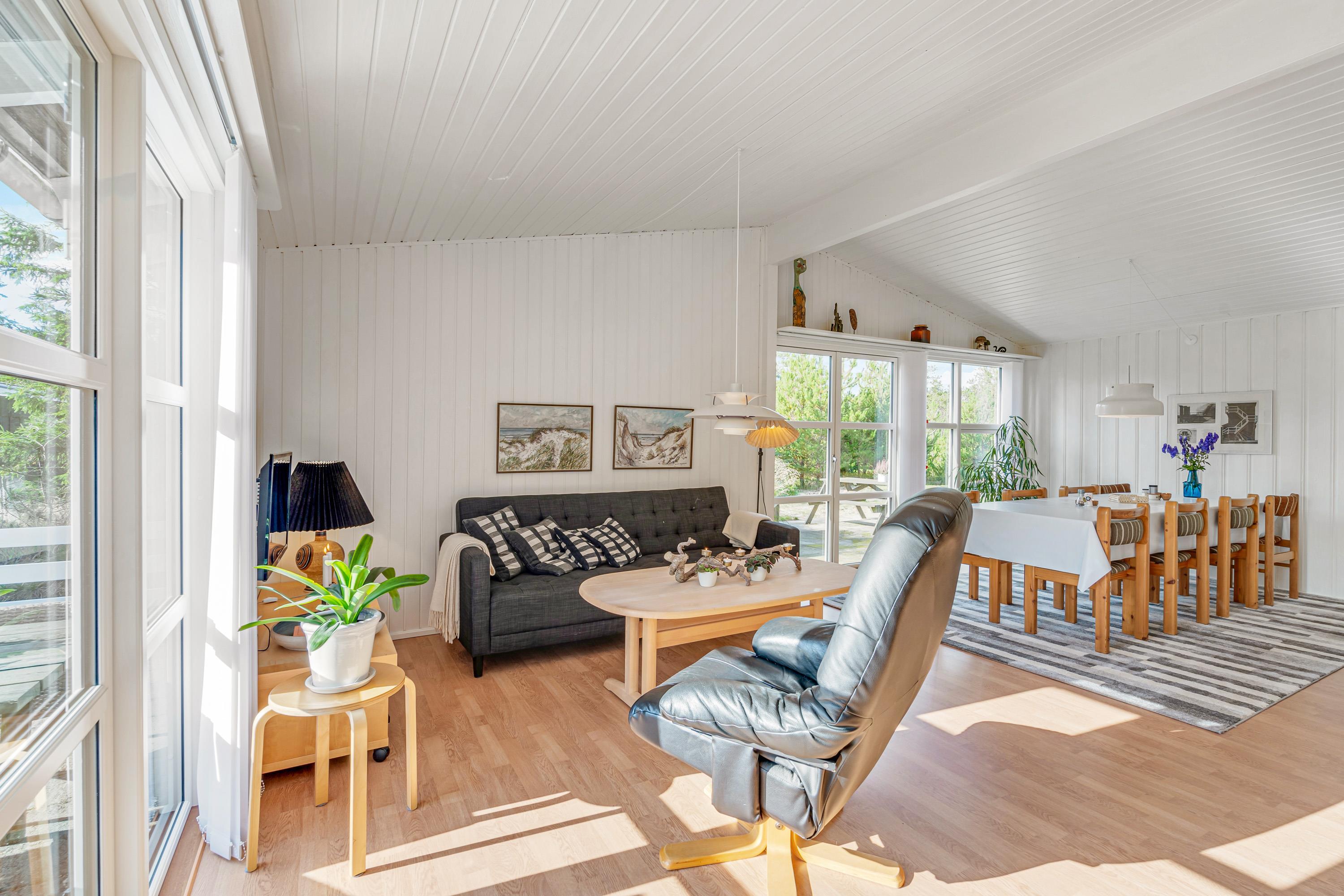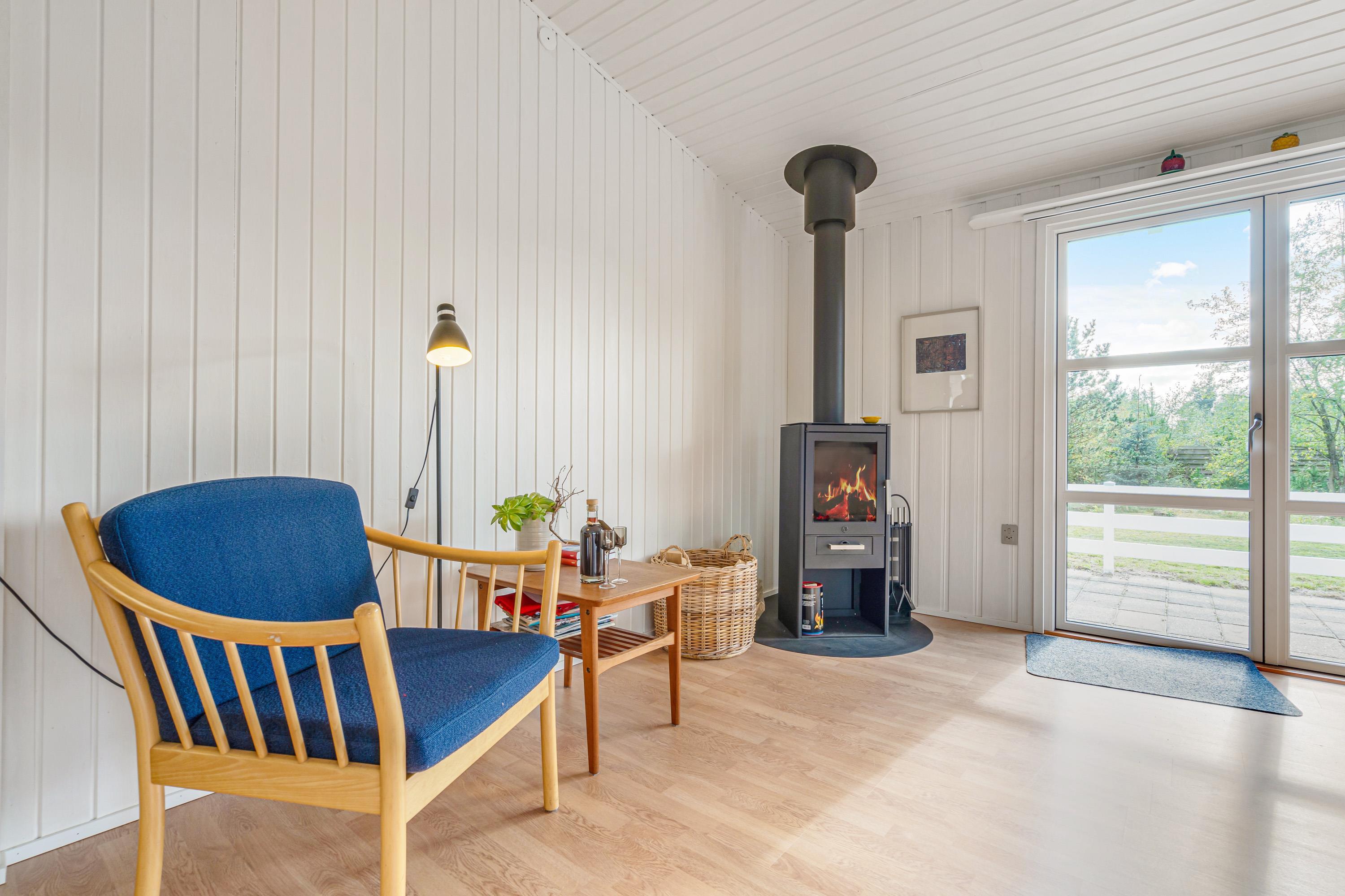 Stuen, som er kombineret med åbent køkken, spiseplads og udstyret med brændeovn, udgør det centrale omdrejningspunkt for dette feriehus. Her kan I lave mad sammen, lave planer for de kommende dage eller se jeres yndlingsserier. På en kølig sommeraften er det også super hyggeligt at tænde op i brændeovnen og bare nyde den knitrende varme. Alternativt er der en moderne varmepumpe for at sikre behagelige temperaturer.