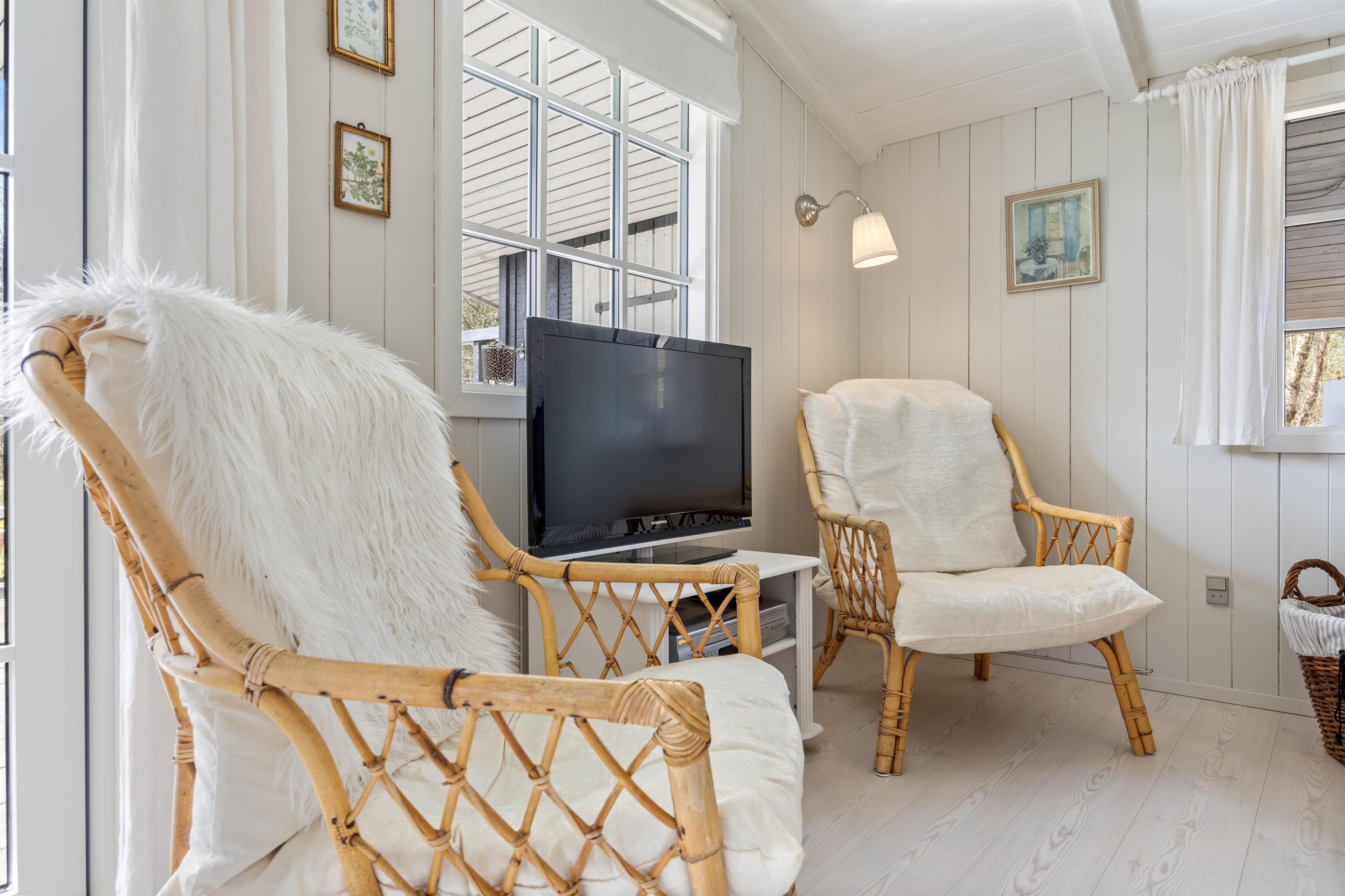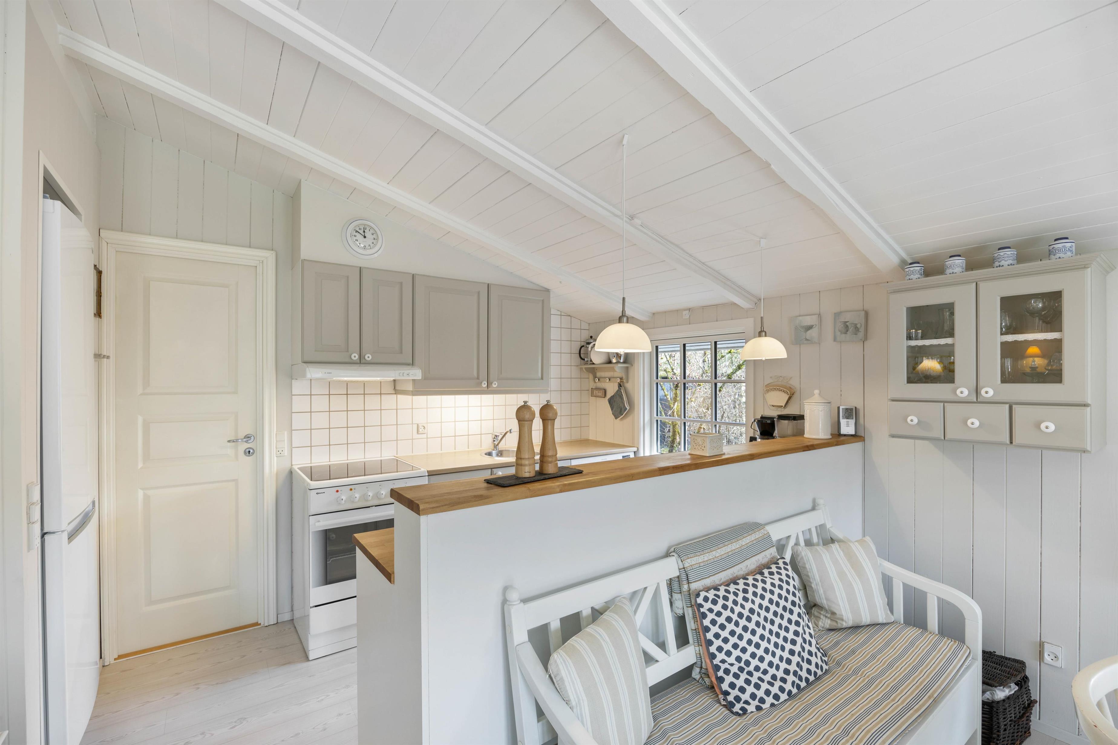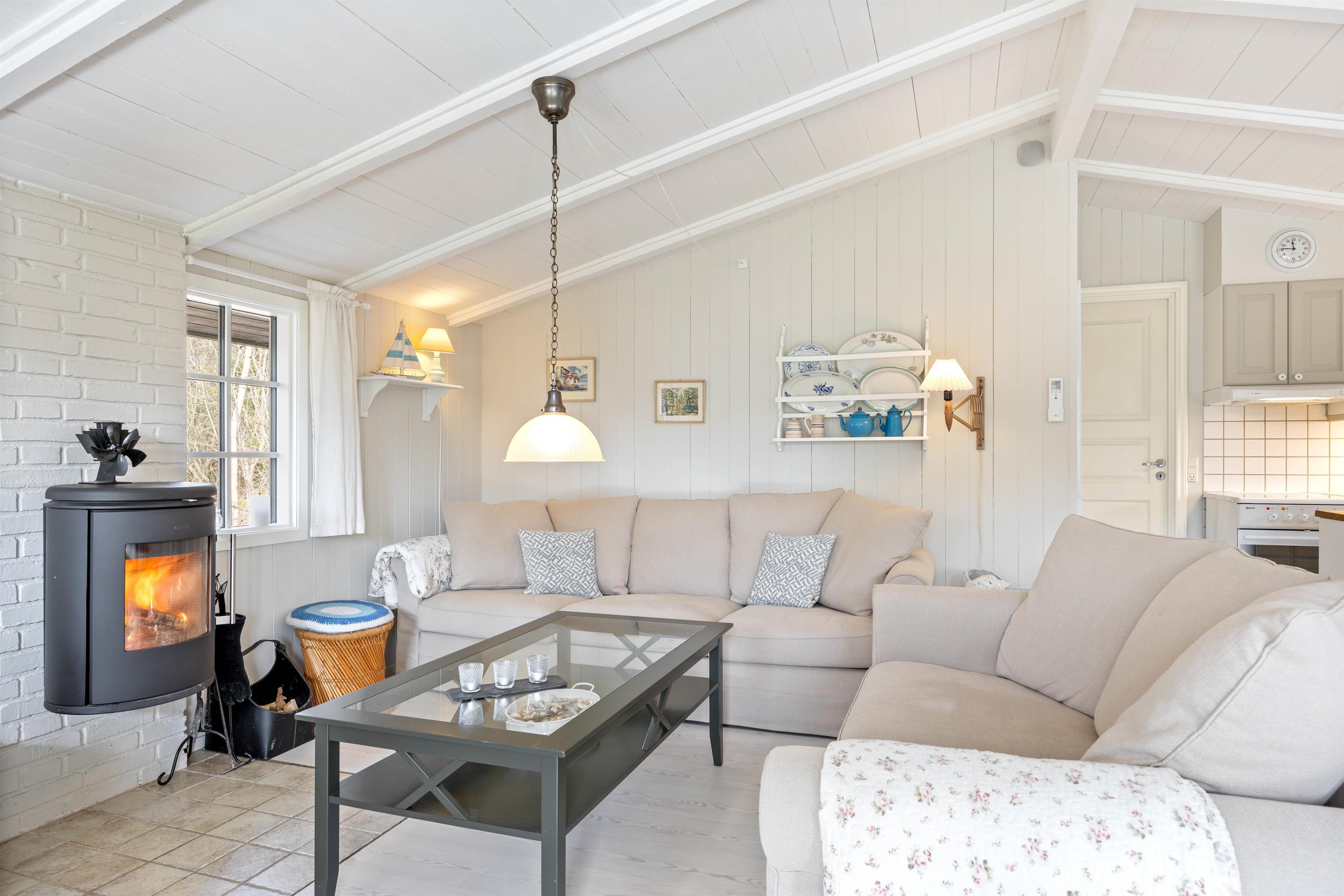 De lyse vægge, gulve og møbler gør indretningen både venlig og hjemlig og lægger en afslappende atmosfære i huset. Huset er indrettet både personligt og hyggeligt, og her er der lagt op til en klassisk sommerhusferie i idylliske omgivelser.