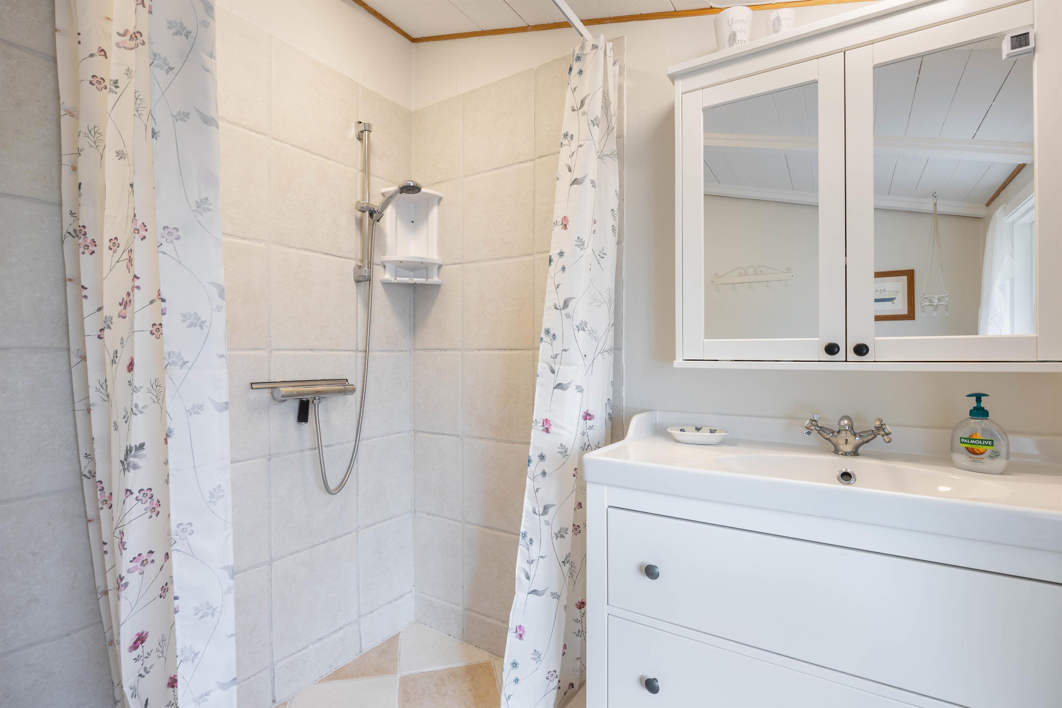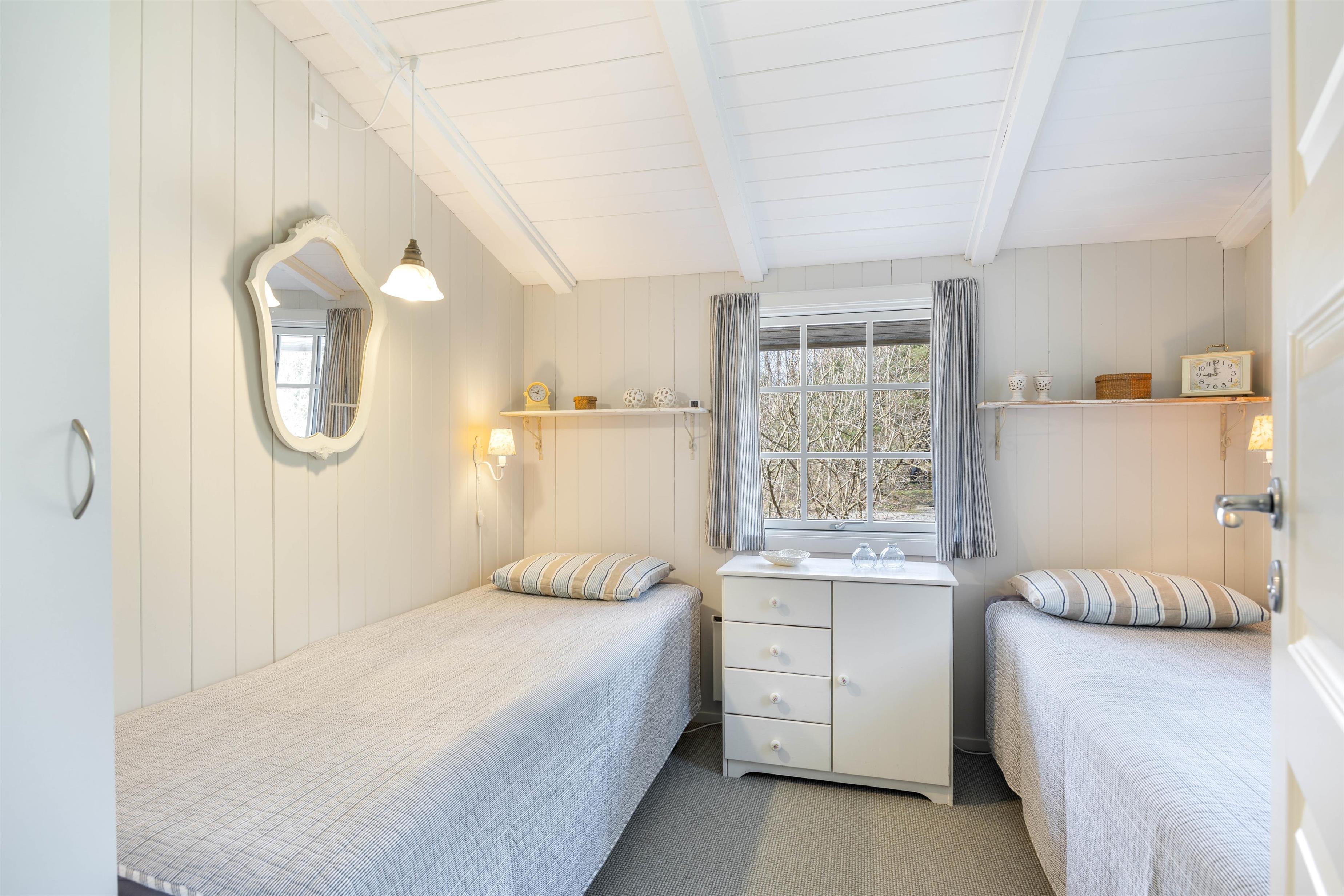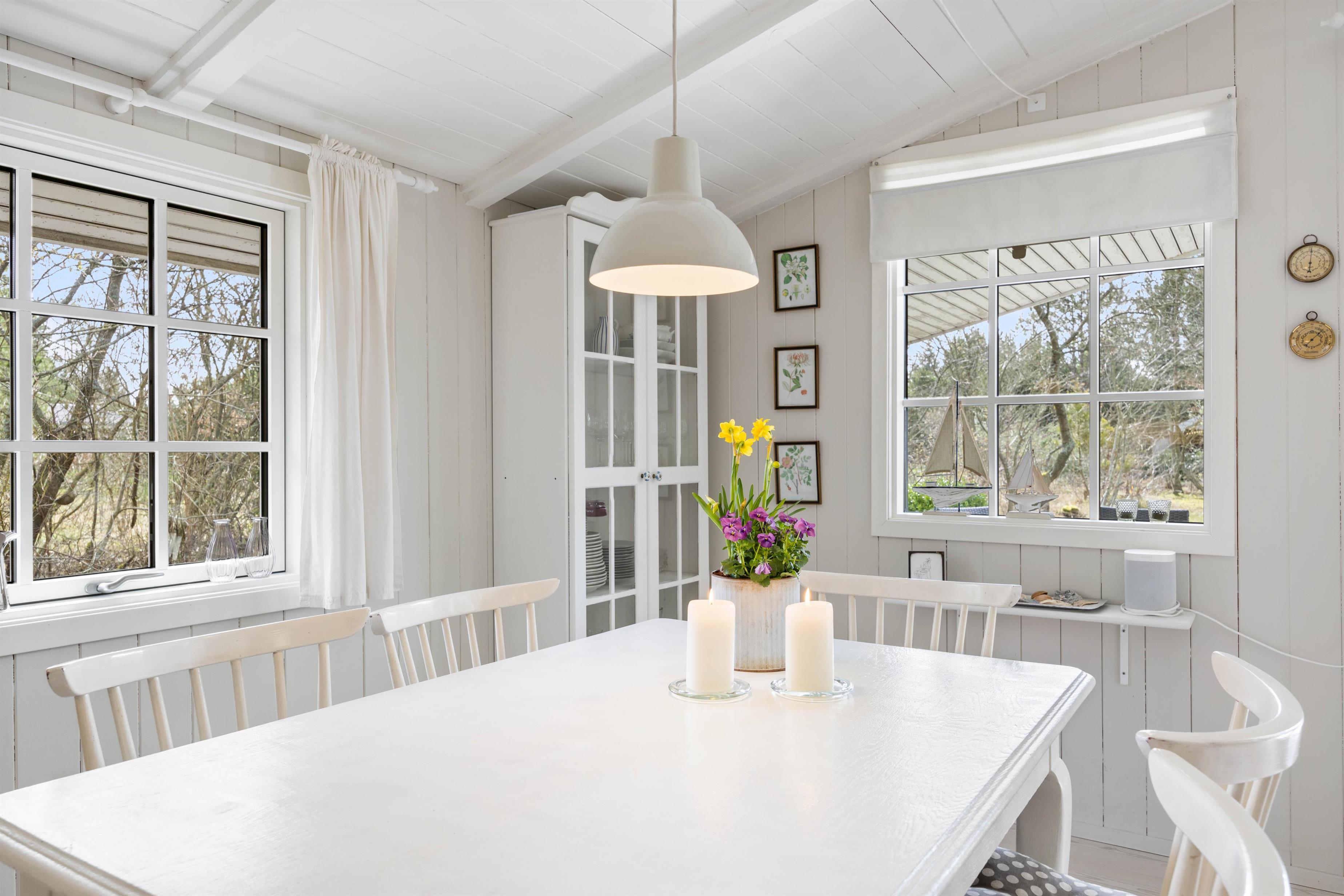 De lyse vægge, gulve og møbler gør indretningen både venlig og hjemlig og lægger en afslappende atmosfære i huset. Huset er indrettet både personligt og hyggeligt, og her er der lagt op til en klassisk sommerhusferie i idylliske omgivelser.