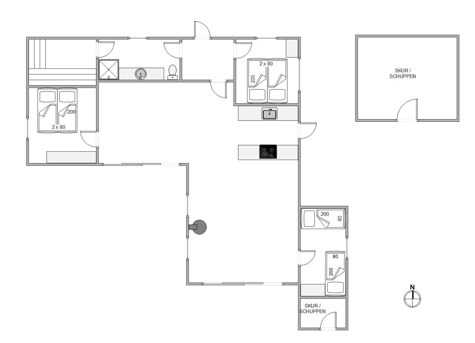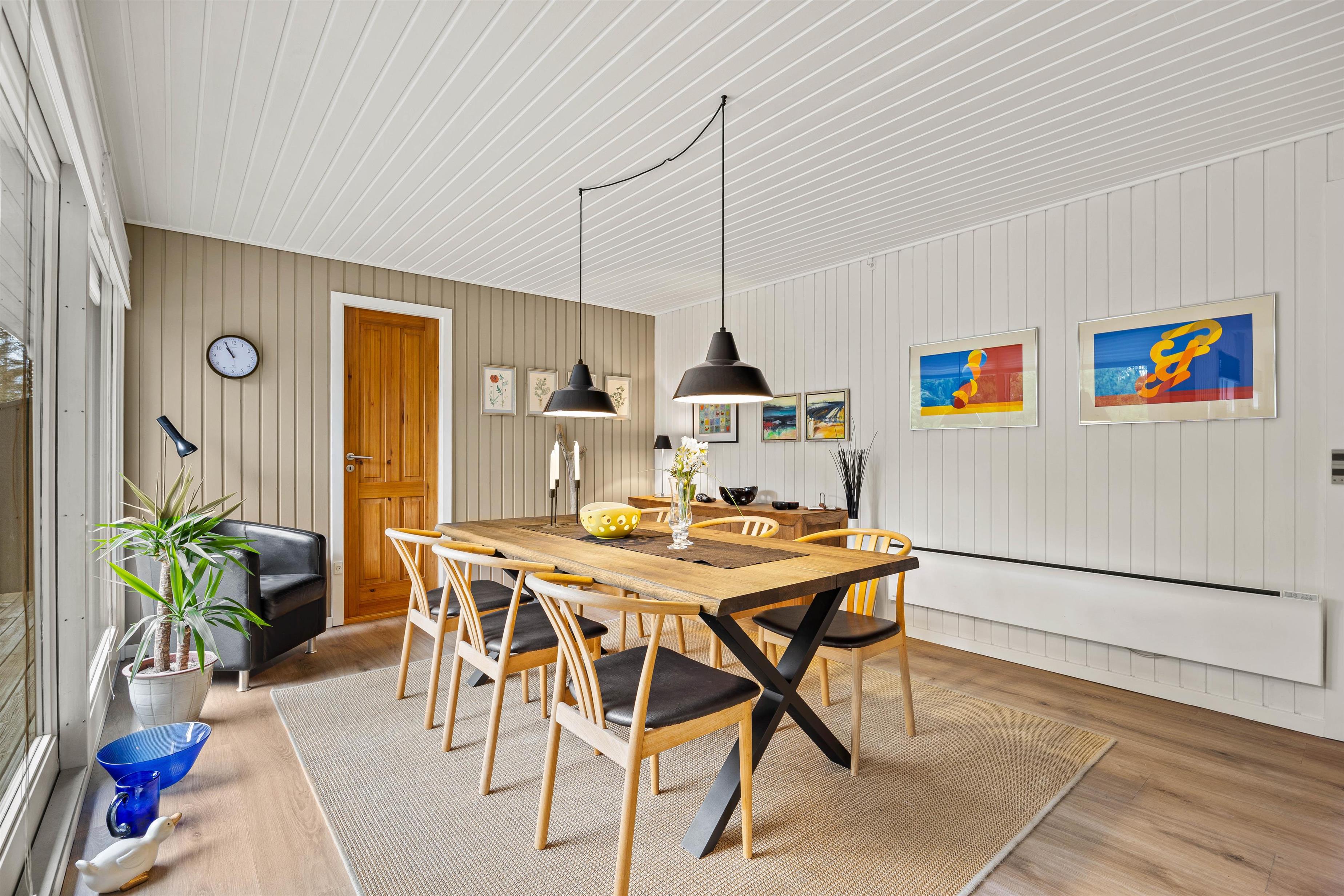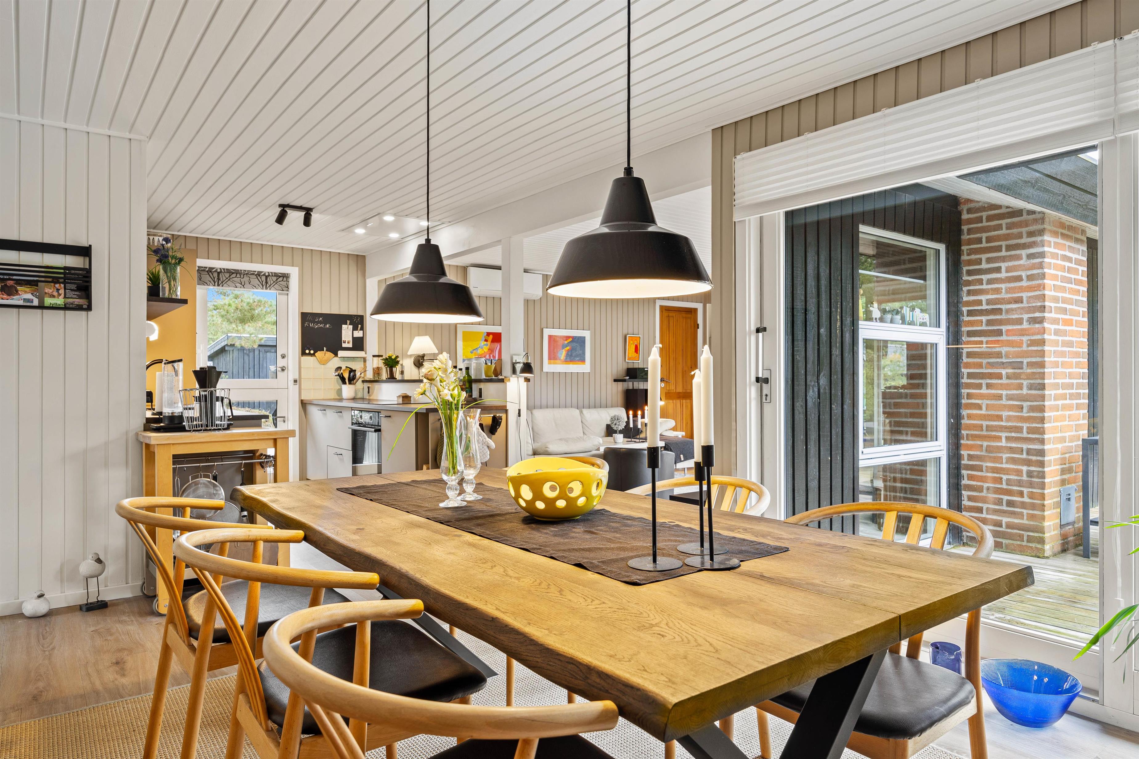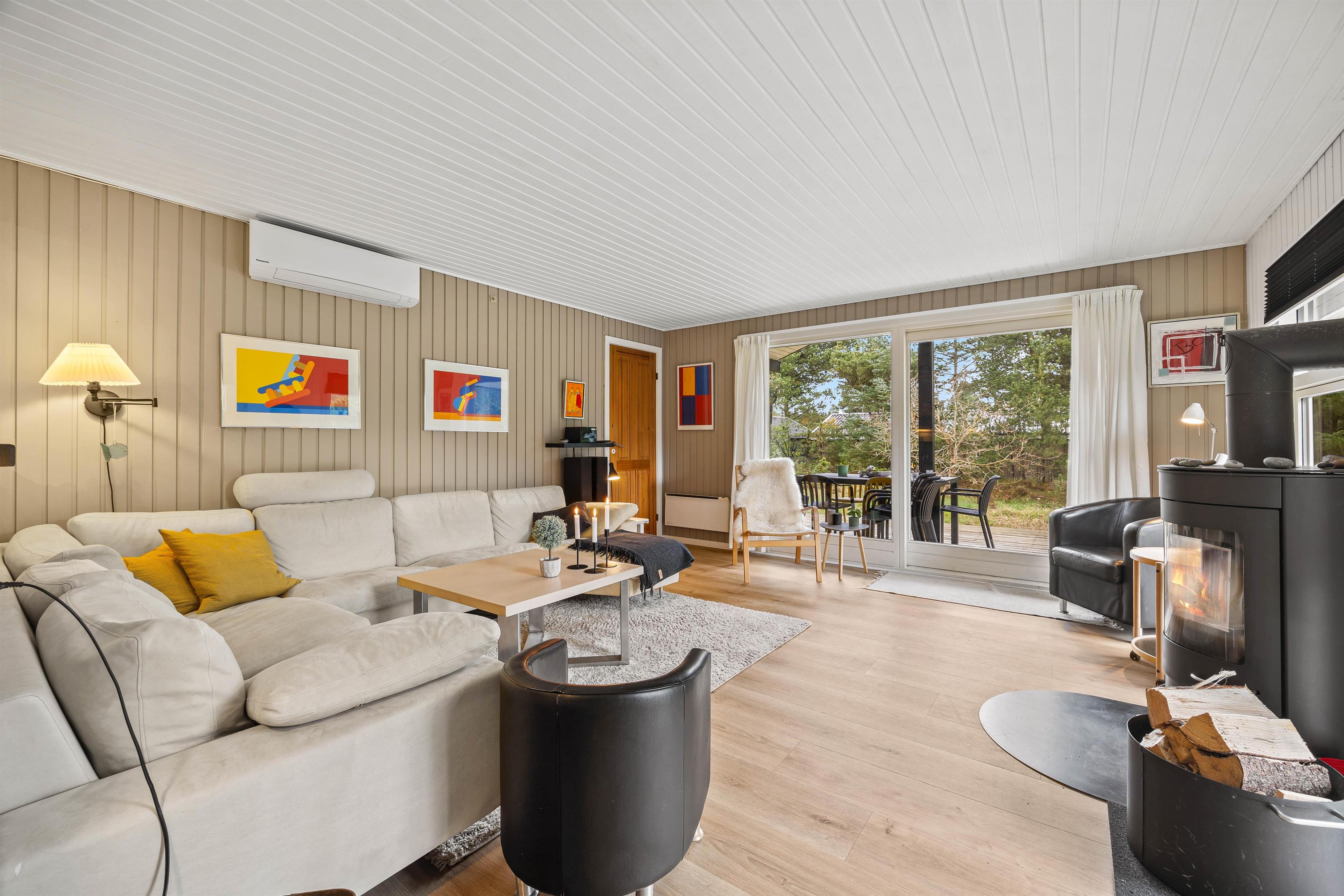 Ikke-ryger huset har god plads til de maks 6 personer og hunden. Det kombinerede stueområde med de mange vinduer er lyst og venligt indrettet, og på den store lædersofa foran brændeovnen kan I læse en god bog eller holde en hyggelig spilaften med familien.