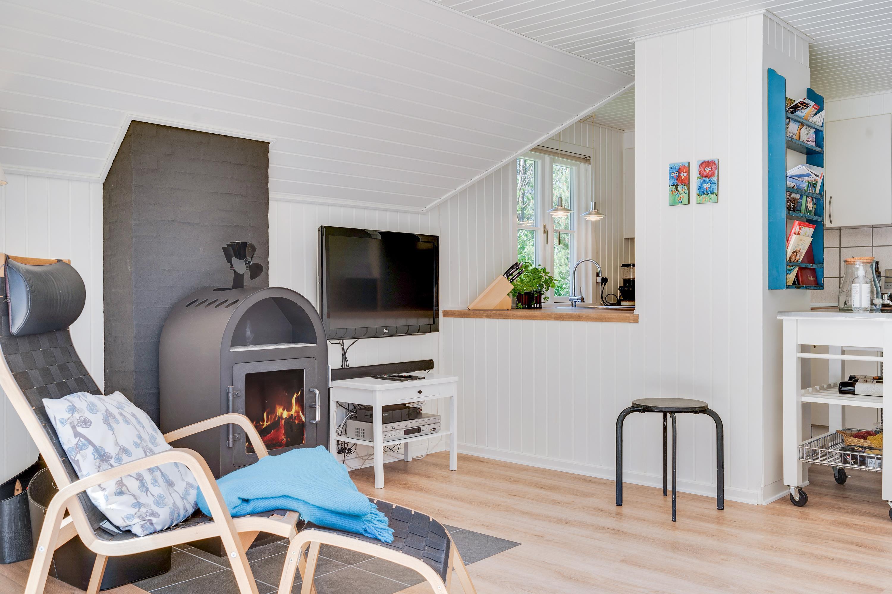 I stuen finder I brændeovnen, hvis knitrende flammer især i de kolde måneder, vil fylde stuen med varme og god feriestemning. Læn jer tilbage i sofaen eller lænestolen med en god bog, og nyd den fredfyldte ferietid.