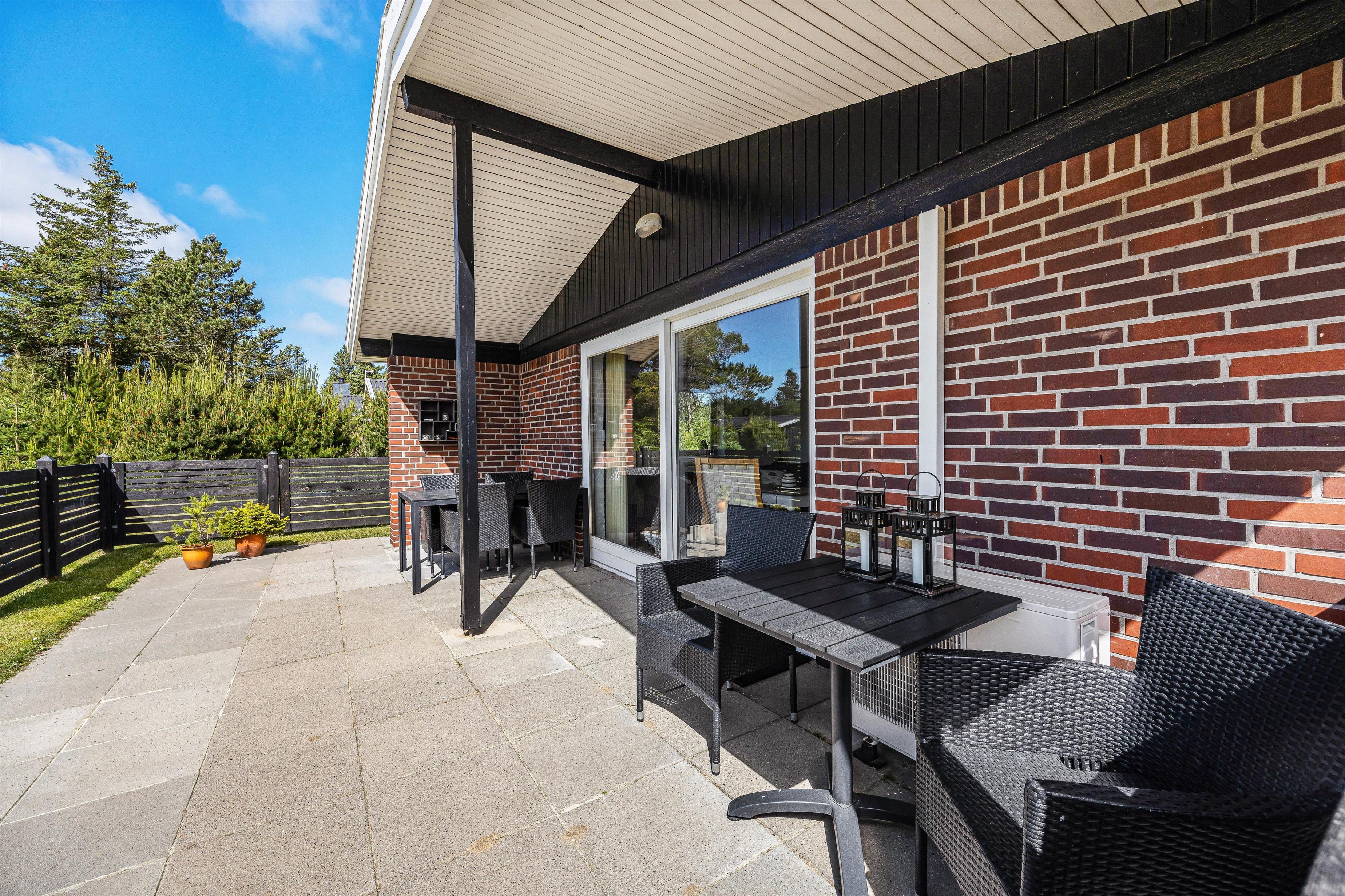 Gemt bag træerne finder I Peder Larsensvej 75. Feriehuset er placeret på en god naturgrund med flere gode hyggekroge. Der er fliser rundt om huset med flere terrasser, så der er rig mulighed for at nyde solen på alle dagens tidspunkter. Terrassen ved stuen er delvist overdækket og afskærmet, så I også kan være ude ved dårligt vejr. Læg jer godt til rette på solvognene og se på mens børnene leger i sandkassen, eller boltrer sig i haven, I har også mulighed for at grille og nyde dagenes sidste timer.