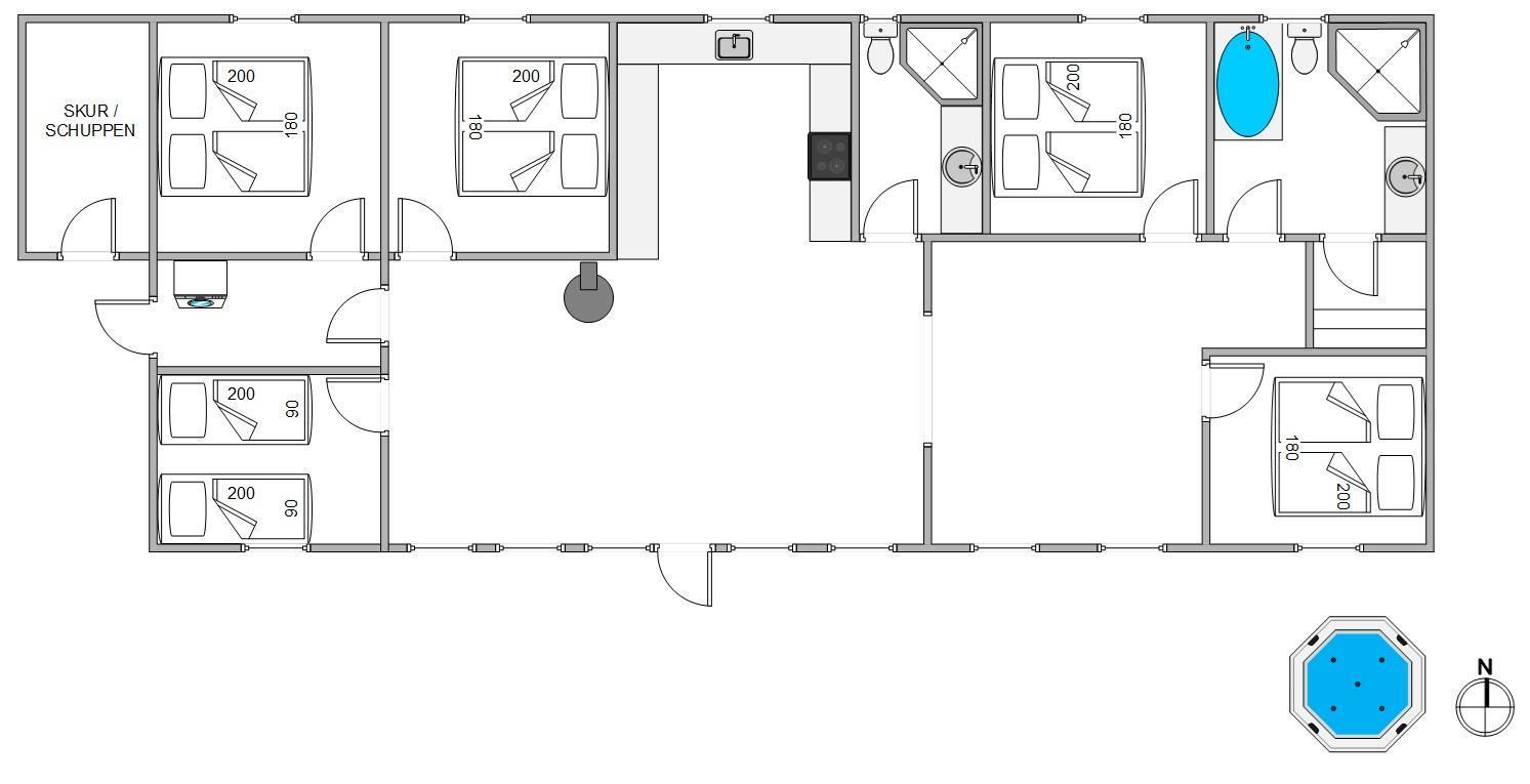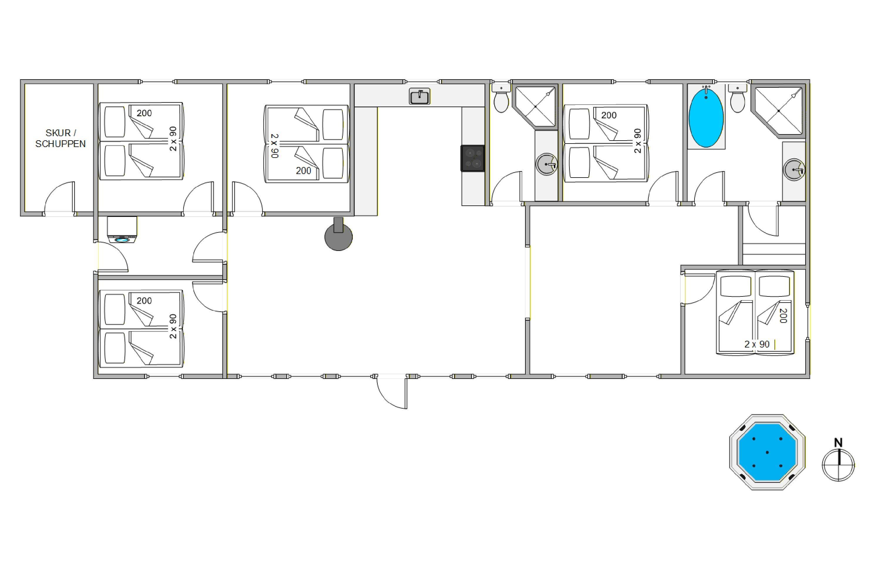 Sommerhuset råder over 5 komfortable soveværelser, alle indrettet med dobbeltsenge for den optimale nattesøvn. I har også adgang til to moderne badeværelser, der begge er udstyret med gulvvarme.