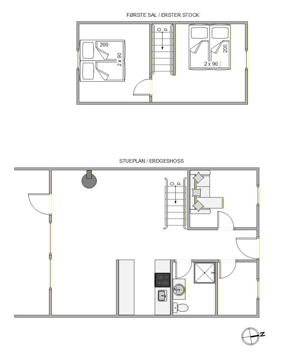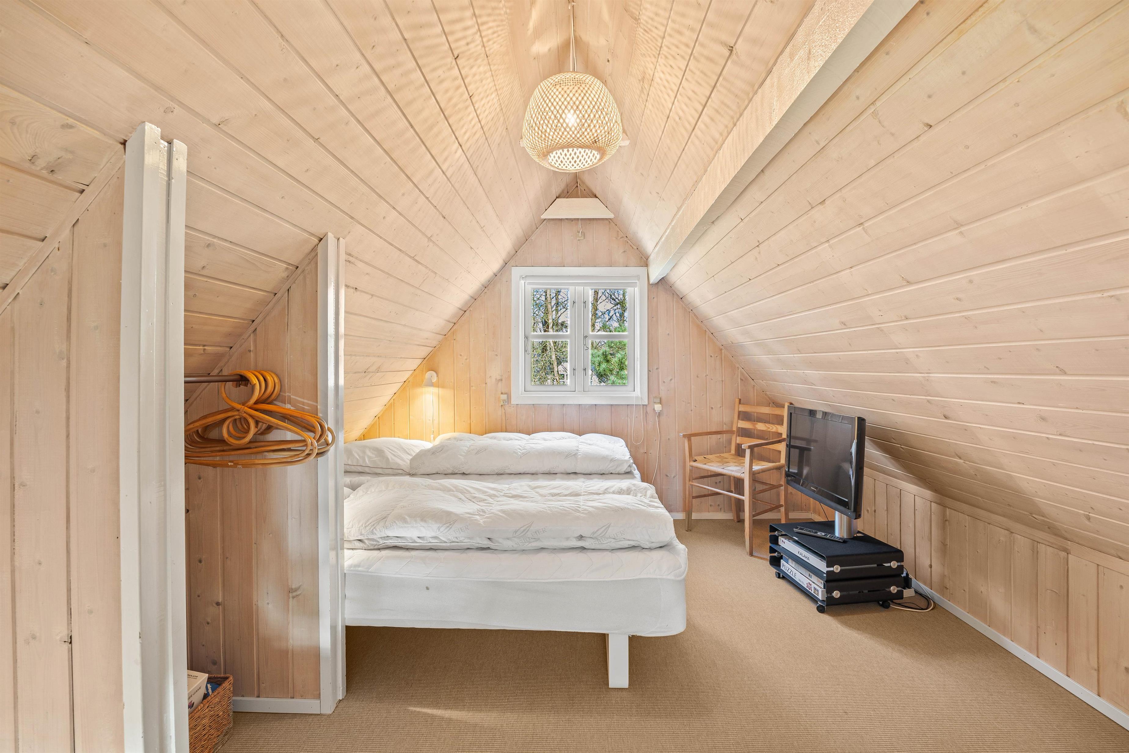 På stueetagen ligger ét af sommerhusets tre soveværelser, hvor der venter jer en komfortabel sovesofa. De to øvrige soveværelser befinder sig på første sal og er begge indrettet med dobbeltsenge. Ferieboligen fuldendes af et lyst og pænt badeværelse, der sikrer bekvemmelighed og komfort under hele opholdet.